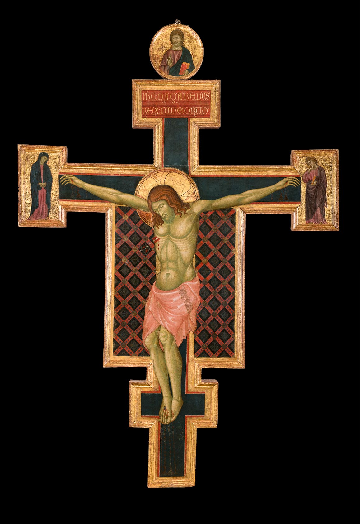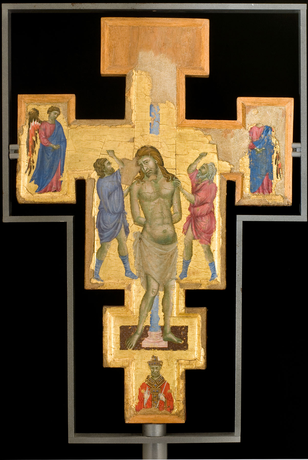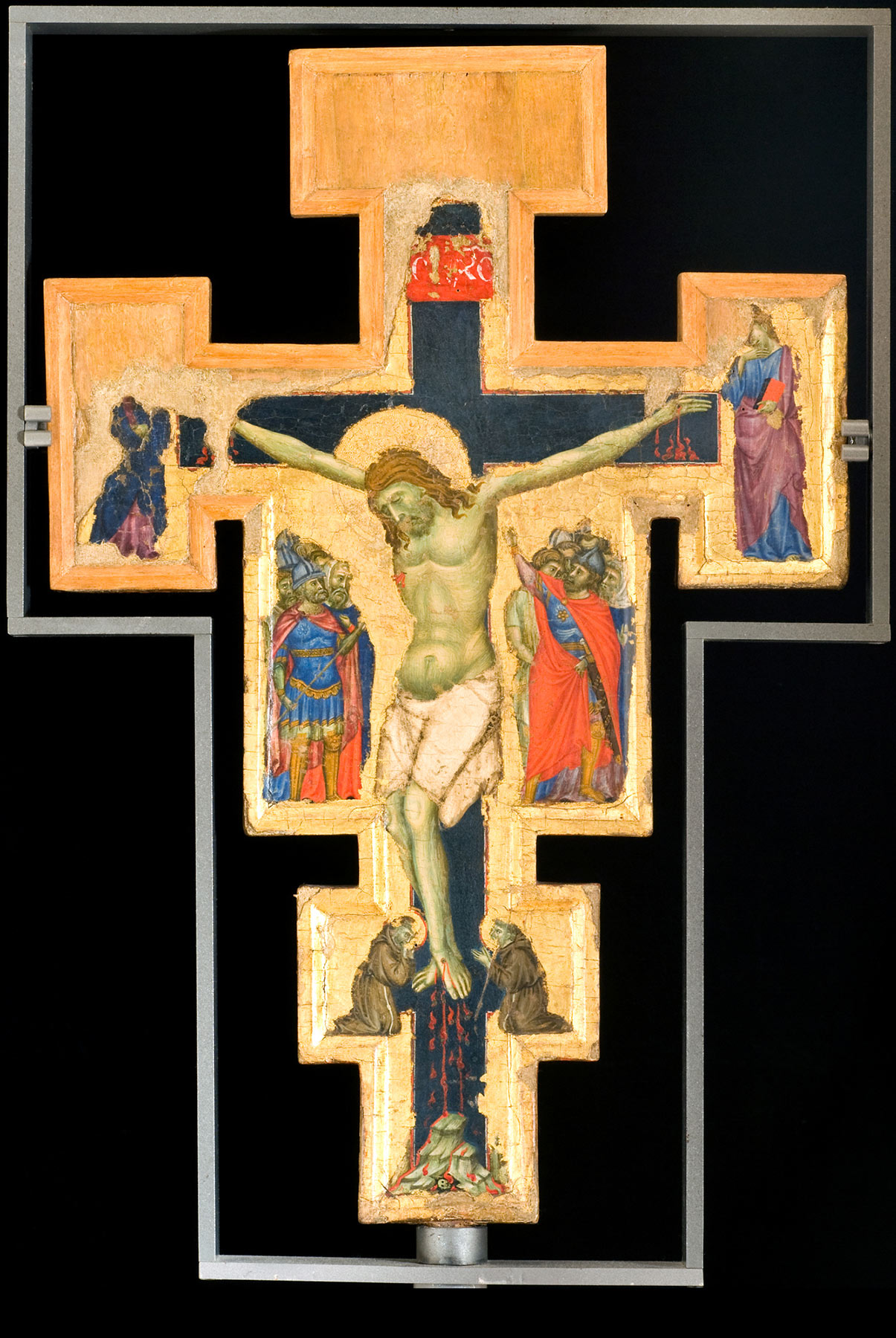This double-sided processional cross is painted on both faces with closely related but not identical images of the Crucified Christ. On both the obverse and reverse, full-length standing figures of the mourning Virgin and Saint John the Evangelist fill the left and right lateral terminals, respectively, and a half-length mourning angel is seen in the upper terminal. On the obverse, the angel faces left, toward the Virgin; on the reverse, the angel faces right, toward the Evangelist. The Virgin on both sides of the cross wears a dark blue cloak over a red dress; on the obverse, she crosses her arms over her chest, while on the reverse she clasps her hands before her. Saint John wears a red cloak over a light blue robe. On the obverse of the cross, he holds a book of his Gospels in his left hand and touches his right to his chest; on the reverse, his head rests on his right arm in a gesture of consuming grief. The angels, both front and back, wear violet cloaks over blue tunics, considerably lighter on the obverse than on the reverse. The bottom of the cross on both sides is filled with a kneeling figure in a Franciscan habit, looking up to adore the Crucified Christ: on the reverse, a woman in a Clarissan habit, who may be presumed by her halo to represent Saint Clare; on the obverse, a severely damaged friar, again with a halo, who may be presumed to be Saint Francis.