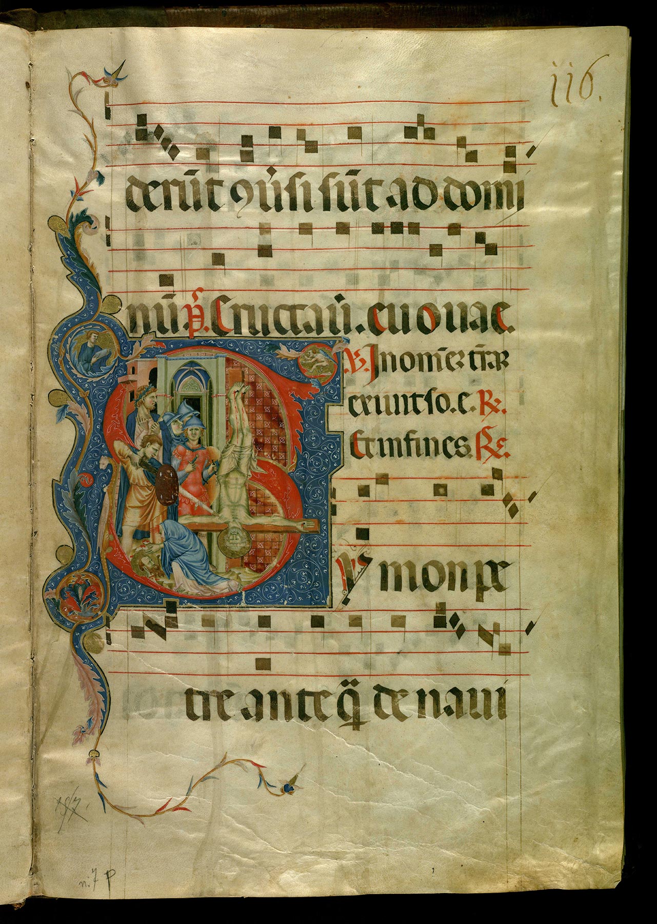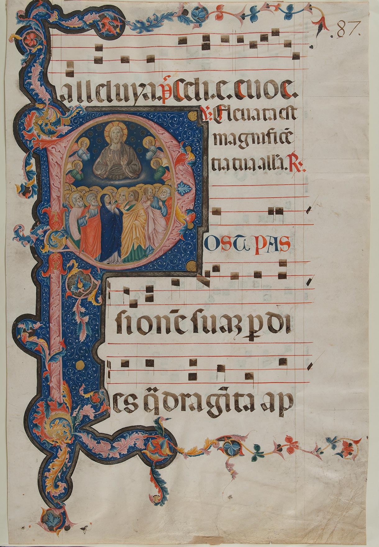 In light of this distinction of hands, the contentions that the Master of the Gubbio Cross might be the Primo Miniatore Perugino (Conti, Subbioni) or that he might instead be the Secondo Miniatore Perugino (Todini) both require closer scrutiny. Connections to the work of the Secondo Miniatore—in particular, the Lord’s Supper in an Initial A in Antiphonary H of the San Domenico choir books (fig. 4) or the Martyrdom of Saints Peter and Paul in an Initial S in Antiphonary F (fig. 5)—are entirely to be found among the forms and patterns on the reverse of the Yale cross. These are, in fact, sufficiently striking to imply that the two painters might indeed be the same. On the other hand, links to the work of the Primo Miniatore—such as the Ascension in an Initial P in the Fondazione Giorgio Cini, Venice (fig. 6)—are restricted to the obverse of the Yale cross, and, once again, these are striking. The coincidence of the same two artists being engaged together on distinct collaborative projects might lend circumstantial support to Lunghi’s proposals that the Secondo Miniatore Perugino is actually an early stage in the career of Marino di Elemosina and that the Primo Miniatore and he were father and son. While it is reasonable to believe that the series of fourteen choir books at San Domenico required a considerable span of time to complete, it is equally reasonable to assume that the two faces of the Yale cross were painted all but simultaneously. If the identification of the two artists as Elemosina and Marino di Elemosina is correct, it would follow that the Yale cross should be dated close to 1304, certainly earlier than 1313, the hypothetical date of a signed panel by Marino in the Galleria Nazionale dell’Umbria, Perugia, representing the Virgin and Child Enthroned with Saint Paul, Saint Peter Celestine, and four angels.15 By that time, the style of Marino di Elemosina had matured beyond the stage at which it could be confused with the hypothetical Secondo Miniatore Perugino. A counterproposal to identify the Primo Miniatore Perugino, and therefore also the Master of the Gubbio Cross, as the Eugubine painter Palmerino di Guido16 was rejected, apparently correctly, by Linda Pisani in favor of a tentative association of this documented assistant of Giotto with the so-called Maestro Espressionista di Santa Chiara.17 —LK