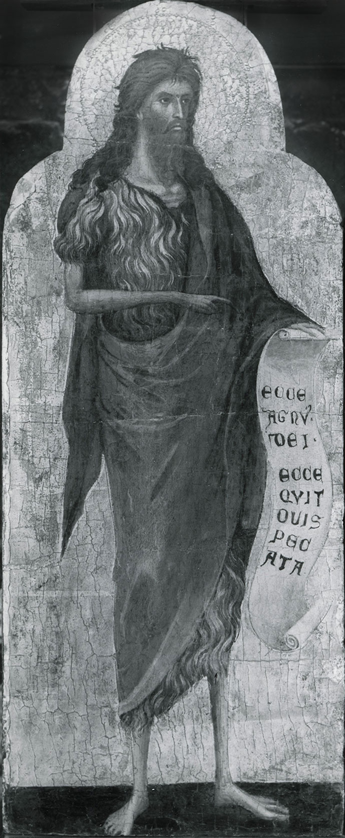Hitherto unacknowledged in discussions of the Yale Magdalen and John the Baptist are the qualitative differences that separate the two panels. The contrasts between them are especially evident in photographs taken before the 1959 cleaning by Andrew Petryn (figs. 1–2), which contributed to a flattening of the painted surface and eliminated the sensitively applied highlights that noticeably distinguished the handling of the Baptist. Compared to the almost generic, formulaic technique used in the figure of the Magdalen, the Baptist stands out for the meticulous attention to the articulation of the individual facial features and hands, as well as a concern with chiaroscuro effects that clearly emphasize the underlying bone structure and the individual folds of drapery. These elements denote a markedly more sophisticated approach that suggests Paolo’s direct involvement in the execution of this figure, and the probable intervention of assistants in the Magdalen.