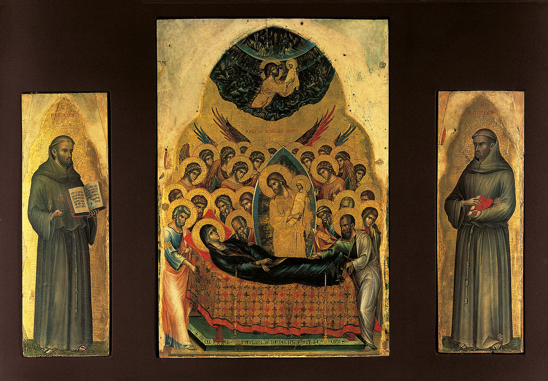 Among Paolo’s signed and dated works, the nearest points of reference for the Yale Magdalen and John the Baptist are the hieratic lateral figures in the 1333 altarpiece with the Transit of the Virgin in the Musei Civici, Vicenza (fig. 3)—a work described by Francesca Flores d’Arcais as a “sort of manifesto” of the artist’s early maturity, characterized by a “subtle equilibrium” between traditional Byzantine forms and modern Gothic elements.16 But rather than providing a terminus post quem for the Yale panels, as argued by past authors, the Vicenza altarpiece seems to represent a more advanced stage in the evolution of the artist’s idiom toward increasingly Gothic formulas. Absent from the Yale figures are the swaying linear rhythms that break up the severity of the poses; the gestures are more restricted, the mood more contained.
