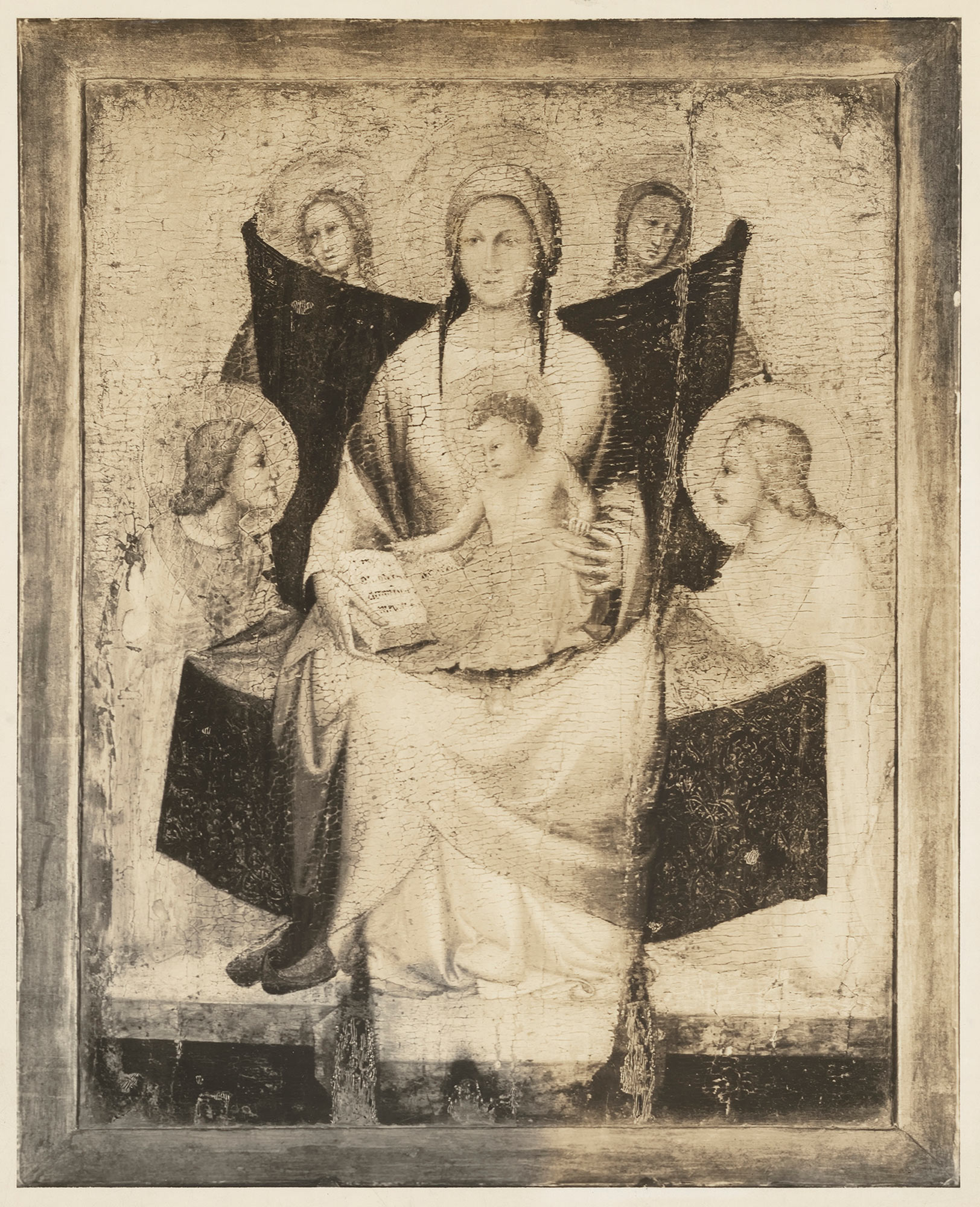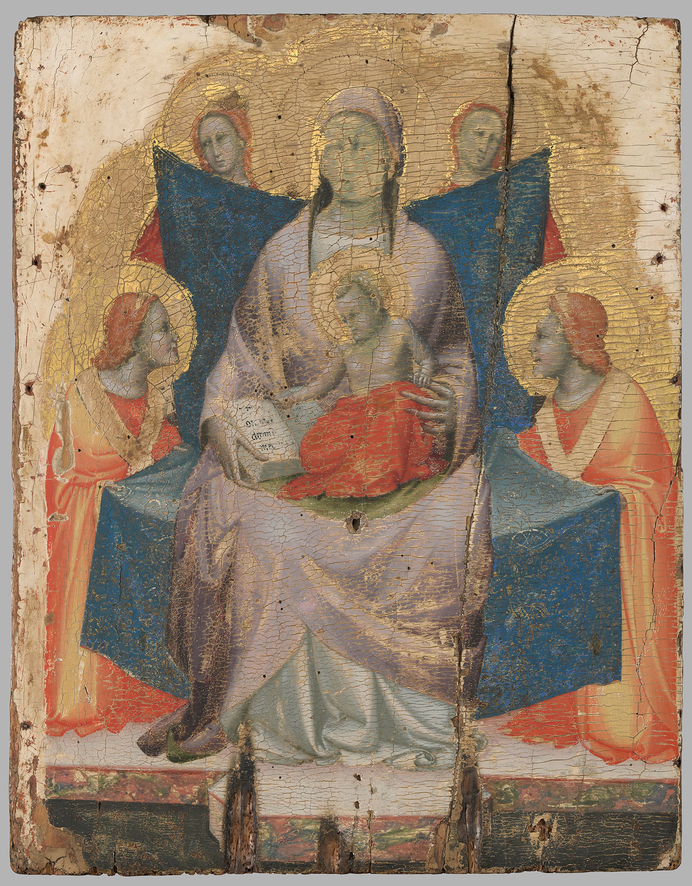 The painting, heavily retouched at an unknown date before entering the collection of Maitland Griggs, and subsequently subjected to harsh “cleaning” in 1964–67, was restored to some semblance of its original appearance in 2012. Notwithstanding the significant losses—most noticeable in the heads of the Virgin and of the angels in the background but also extending to surface decorative effects—the image still retains much of its original charm, derived from the unusual composition and palette. Referred to by Roberto Longhi as the Madonna “of the flying carpet” (“del tappeto volante”),1 the panel depicts the Virgin and Child “seated” on a brocaded cloth of honor held aloft by four angels rather than on a solid throne. Conceived with a close attention to naturalistic detail, two kneeling angels, dressed in brilliant orange robes with yellow highlights, are shown holding onto the edges of the heavy material, sagging under the weight of the bodies. Judging from old photographs (fig. 2), the other two angels, standing in the background, may originally have been depicted holding up the other end of the cloth, now seemingly suspended in midair. The figures are placed above the kind of marble platform usually reserved for a throne, its edges carefully painted to evoke the rich veining of the material. The Virgin, wearing an exquisite mauve-colored mantle lined with green over a white gown, supports the half-naked Christ Child on her lap; a diaphanous veil is draped over His left shoulder and a brilliant red blanket covers His lower half. With His right hand—whose present form is a modern restoration—the Child gestures toward the words, no longer legible, in a small volume held open by the Virgin, perhaps a book of hours. The precious, enamel-like quality of the panel was undoubtedly once magnified by the gilt borders that formerly decorated the figures’ robes and by the gilt sgraffito designs incised over the cloth of honor.