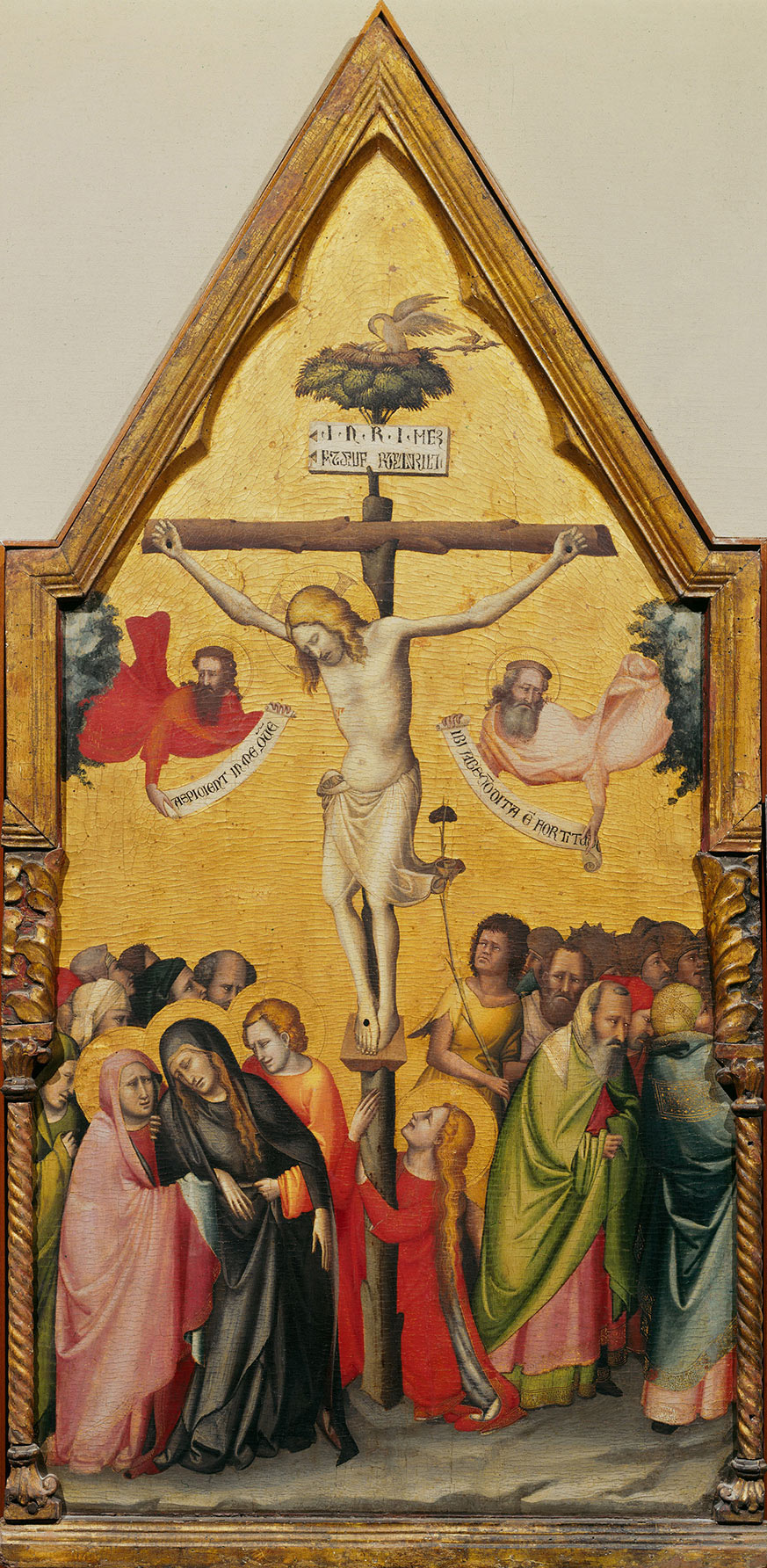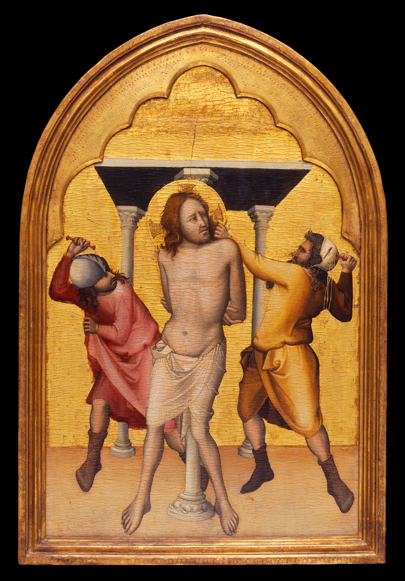 In the most recent and comprehensive reexamination of the “Dalmasio” question to date, Damien Cerutti focused extensively on the importance of the Yale panel in the debate, while presenting new evidence about its original provenance and structure.15 Following upon the intuition of previous scholars,16 Cerutti convincingly demonstrated that the Yale Virgin was originally included in the same complex as the Bologna Crucifixion (see fig. 3) and the Seattle Flagellation (see fig. 4), two paintings that Longhi had already considered part of a single altarpiece.17 As Cerutti noted, an examination of the carpentry of each panel confirms that the Bologna Crucifixion was the central element of a pentaptych, with the Yale Virgin on its outer left, followed by the Seattle Flagellation. To the right of the Crucifixion would have been two other scenes, possibly showing other events from Christ’s Passion, such as the Descent from the Cross and Entombment.18 The placement of the image of the Virgin and Child on one end rather than in the center of the altarpiece would have been unthinkable in a Tuscan context but was perhaps less so in Bologna, under the influence of Venetian and Riminese models. In this instance, as noted by Cerutti, the Virgin’s position would be consonant with the narrative thrust of the altarpiece and its Eucharistic content, highlighting her role in offering up her Son for sacrifice—a notion perhaps alluded to by the no-longer-legible text in her book. Based on the early provenance of the Crucifixion from the Carmelite church of San Martino Maggiore in Bologna, which also contains a fresco attributed to the artist, Cerutti reasonably concluded that the complex was most likely commissioned for that institution.