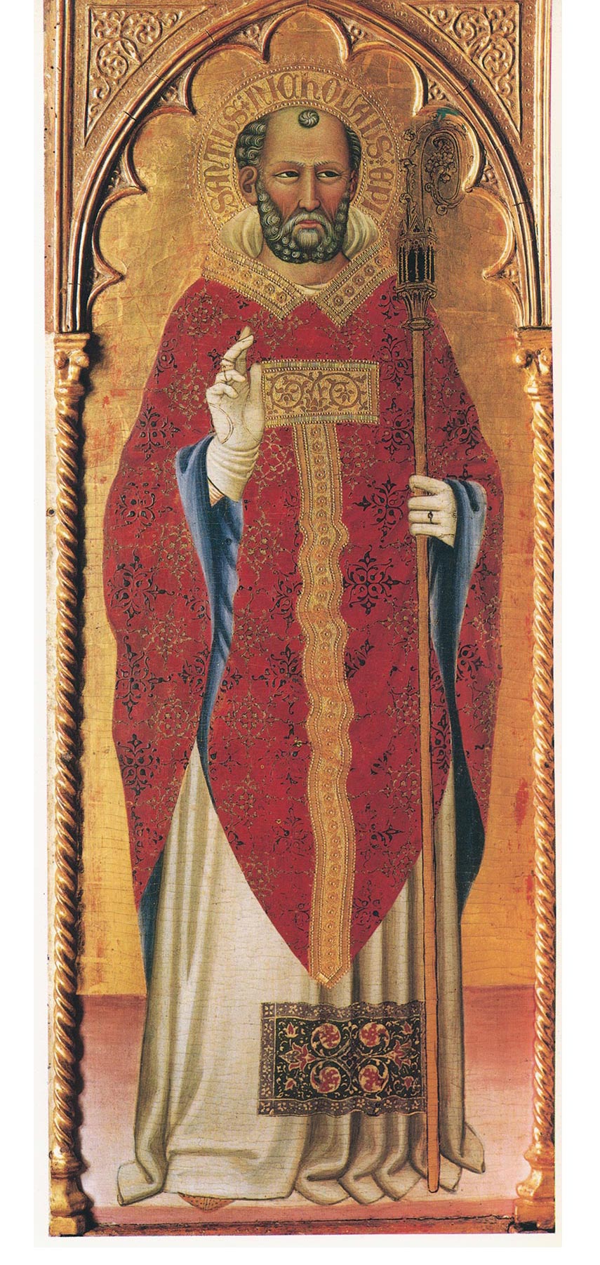 The disparate opinions and some of the perplexities elicited by the Yale panels are undoubtedly due to their unique quality, from the peculiarity of some of the framing elements to the figural style. Efforts to insert them in the oeuvre of Martino di Bartolomeo are unconvincing and unsubstantiated by comparison with any of the master’s surviving production. Beyond technical correspondences, the most pertinent analogies are those with Pisan painting. As well as employing some of the same punch marks, the figure of Saint Nicholas, in particular, appears modeled on images painted by Francesco Traini and his contemporaries and by a later generation of Pisan artists, such as Cecco di Pietro (documented 1364–99) (fig. 1). The representation of Saint Catherine of Alexandria holding a diminutive wheel in her hand is also iconographically indebted to Trainesque examples. Absent from both panels, however, is the subtlety of execution of Traini’s immediate followers. Cecco di Pietro’s production in the late 1370s and 1380s, although distinguished by a more incisive, hard-edged approach, provides perhaps the most relevant point of reference for the Yale panels, but a localization in Ligurian territory, with its artistic dependance on Pisan models, cannot be ruled out.6 —PP