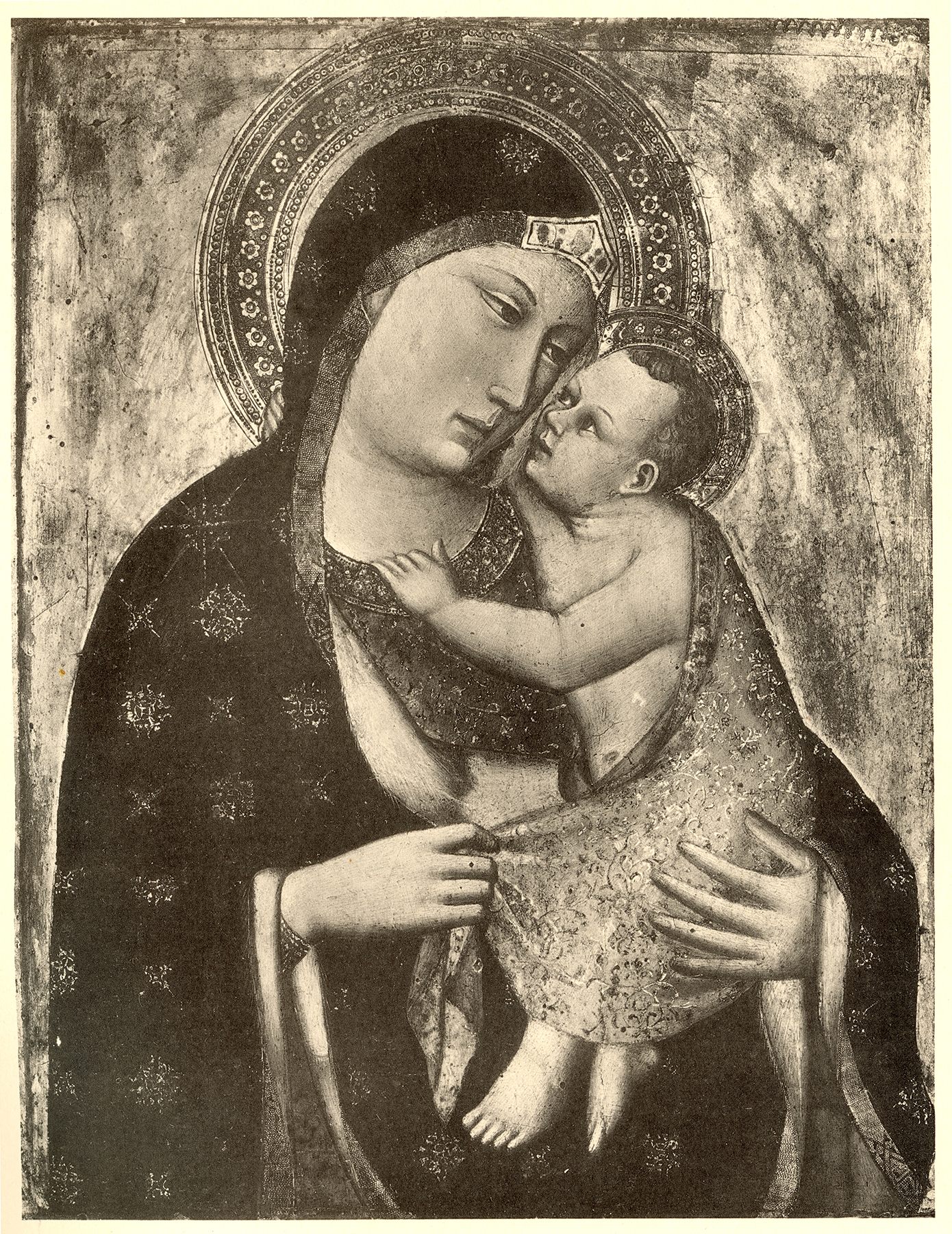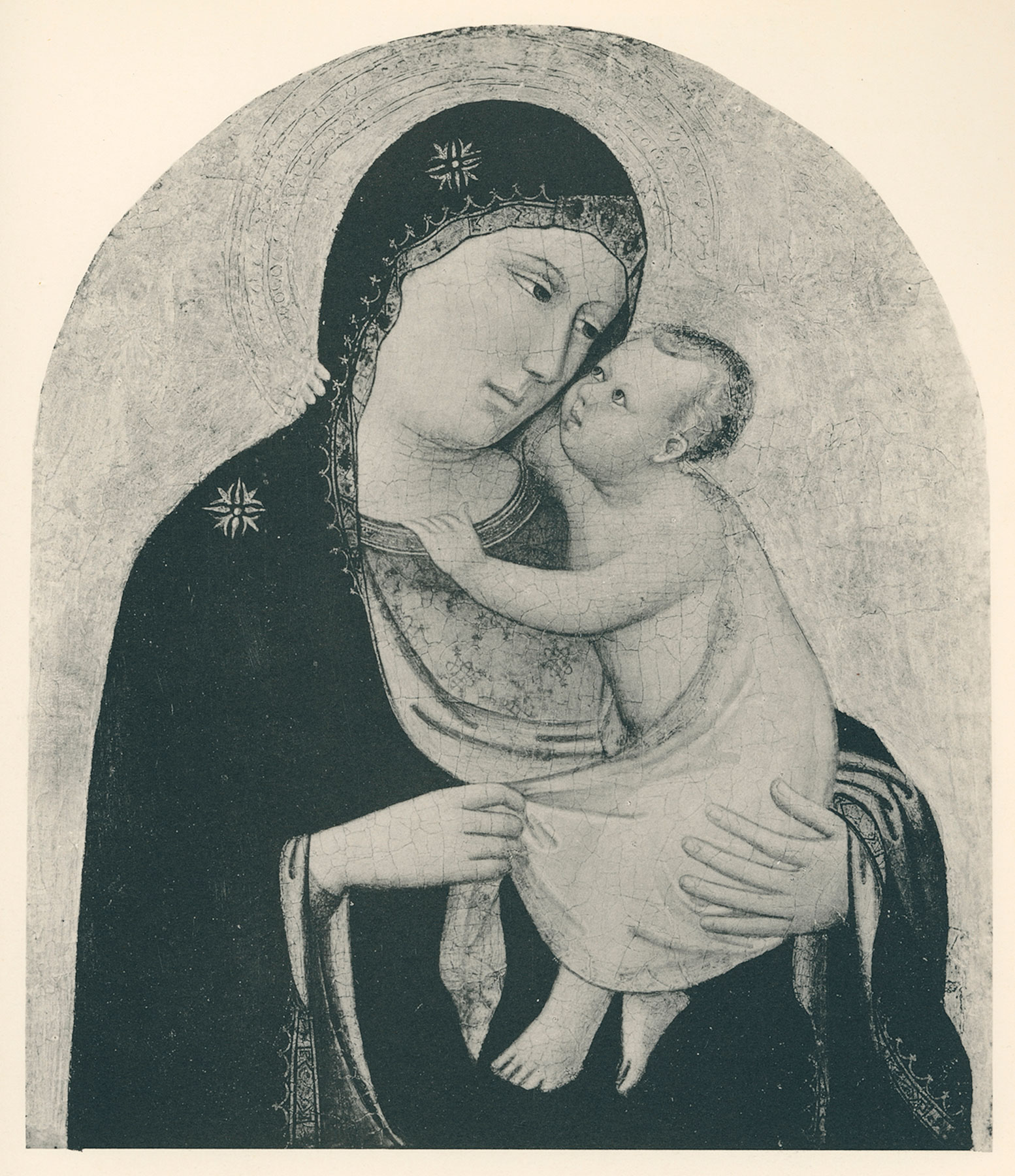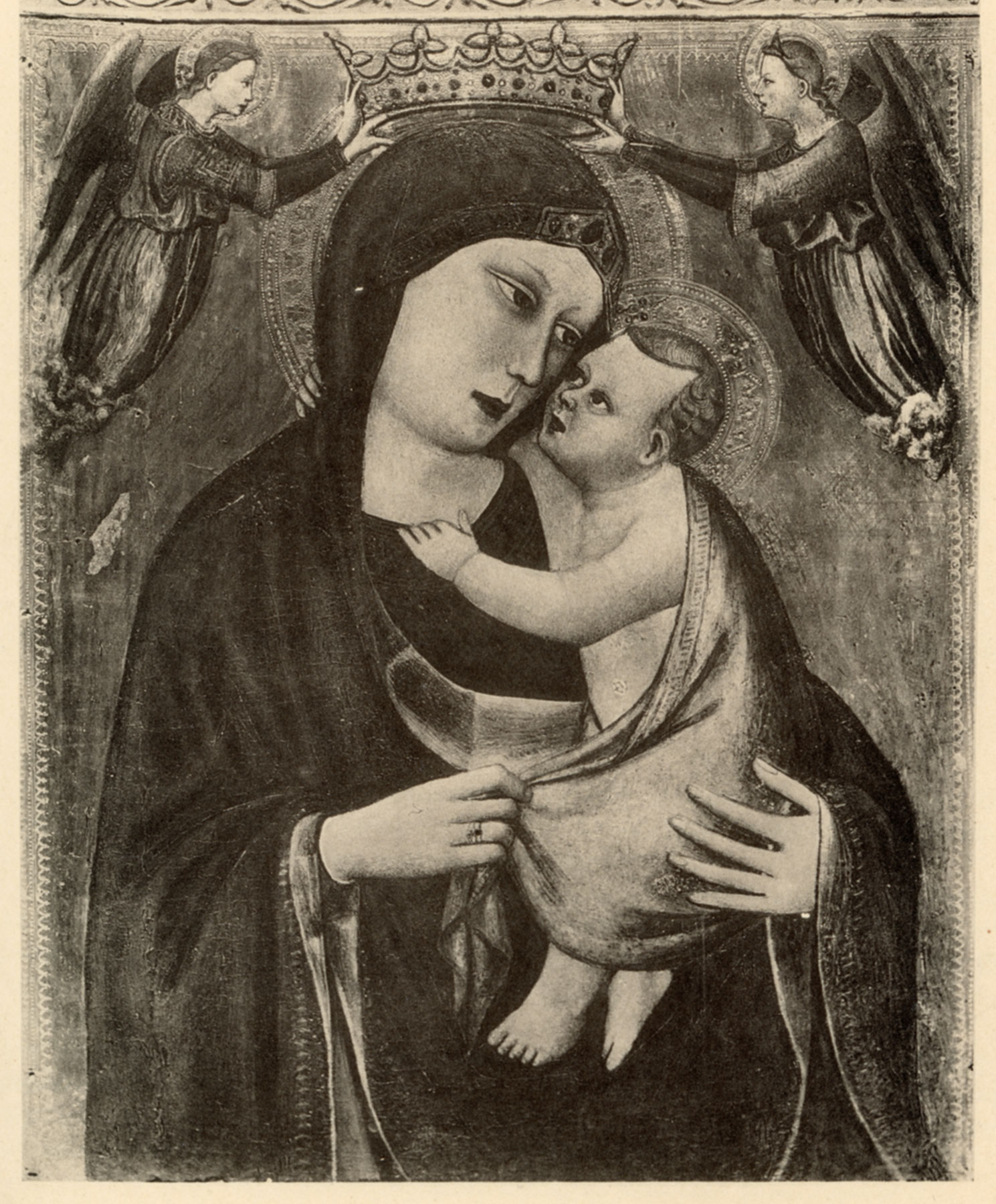 In Offner, Richard, and Klara Steinweg. A Critical and Historical Corpus of Florentine Painting. Sec. 4, vol. 4, Giovanni del Biondo, pt. 2. New York: Locust Valley, 1969., 27, Klara Steinweg alluded to a Virgin and Child by Giovanni del Biondo in the Pinacoteca Nazionale, Siena (inv. no. 584), in which the composition is closed at the top with a small scene of the Crucifixion divided from the main figures by a course of punched decoration, as evidence that the Hurd (and Yale) paintings were probably treated in the same fashion, and she felt that this was confirmed by a similar configuration in the Virgin and Child formerly in the Branch collection (see fig. 3). The latter, however, is problematic as evidence without access to the original. From the photograph published by Steinweg (Offner, Richard, and Klara Steinweg. A Critical and Historical Corpus of Florentine Painting. Sec. 4, vol. 4, Giovanni del Biondo, pt. 2. New York: Locust Valley, 1969., pl. 9), it appears that the upper and lower parts of this panel may be a marriage of fragments from two unrelated works of art: the Crucifixion appears to have been painted on a panel with a horizontal wood grain and possibly to have been enlarged to fit above the Virgin and Child, which instead was evidently painted on a panel with a vertical grain. ↩︎