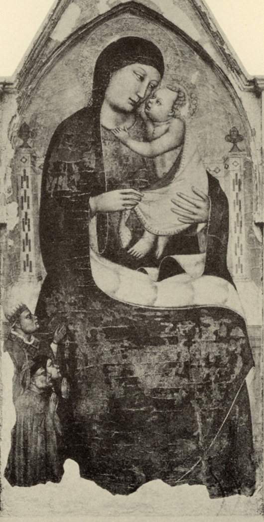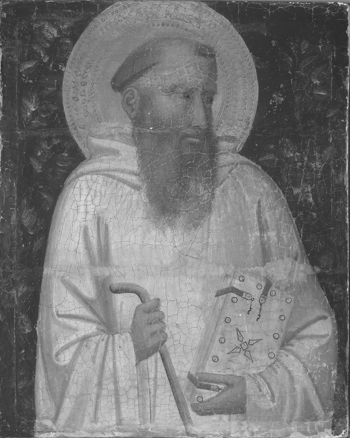 The existence of no fewer than three replicas of the Yale Virgin and Child, two by Giovanni del Biondo, does argue for “its importance for its period,” as Seymour suggested,21 and has led to some speculation regarding the original provenance of the altarpiece of which it formed part. The white habit worn by the saint in the left lateral panel probably indicates that the altarpiece was a Camaldolese commission and led Dillian Gordon to propose changing that saint’s identification from Benedict to Romuald, founder of the Camaldolese reform movement.22 Following on the assumption that the altarpiece was commissioned to Bernardo Daddi in 1337, the present author noted that two chapels in the sacristy of Santa Maria degli Angeli, the principal house of the Camaldolese order in Florence, were endowed by the Spini family in 1336, one with a dedication to Saint Mary Magdalen and one with a dedication to Saint Lawrence.23 Both of these would have contained altarpieces and either could have included the Yale panels if they were originally accompanied by two additional panels, one of which would have portrayed either the Magdalen or Saint Lawrence. Gordon prefers to identify another chapel in the sacristy at Santa Maria degli Angeli as the probable original site of the Yale altarpiece. Endowed in 1342 with a bequest of 60 florins by Giovanni di Lottieri Ghitti, the dedication of this chapel to Saint John the Evangelist would be appropriate on iconographic grounds for an association with the Yale altarpiece and now seems equally compelling on stylistic grounds. Also possible but entirely speculative would be a provenance from the Camaldolese monastery of San Giovanni Evangelista at Pratovecchio; no documentation exists for the commissioning of altarpieces there in the fourteenth century. —LK