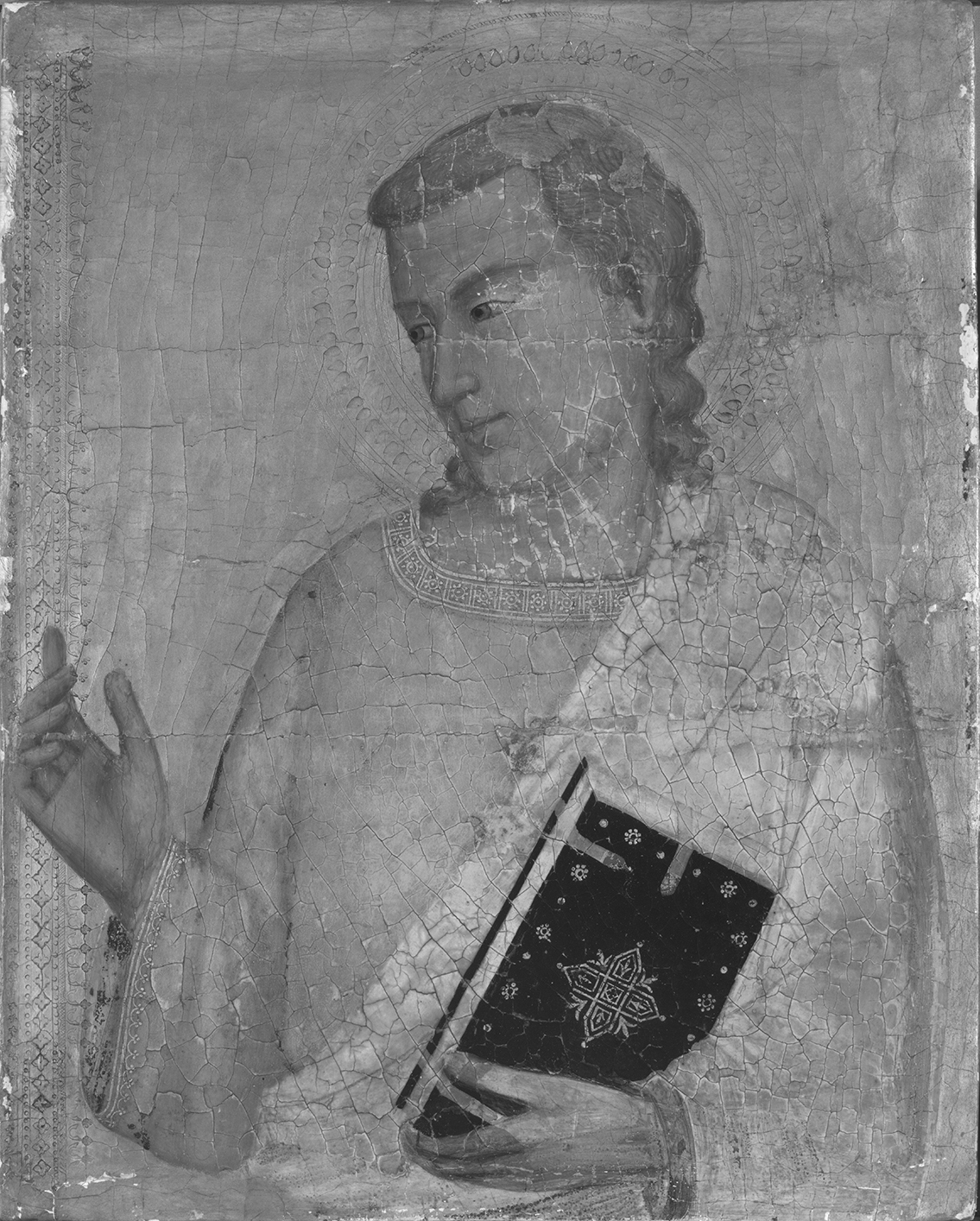Miklós Boskovits, in his synthetic study of late trecento painting in Florence, repeated Steinweg’s attribution to Giovanni del Biondo for both the Hurd and Yale paintings.8 In 1984, however, he reconsidered his attribution of the Yale Virgin and Child, returning to Berenson’s original designation for it as the work of Bernardo Daddi.9 At that time, he also published two half-length saints—Saint Romuald and the present Saint John the Evangelist—as probable lateral panels of an altarpiece of which the Yale Virgin and Child formed the center. This proposal was endorsed by Erling Skaug on the basis of a conformity of punch tooling across the three panels.10 It was confirmed by the present author with the observation that splits in the horizontal grain of the wood supports in the lateral panels align with damages to the paint surface of the Virgin and Child that must have been caused by similar splits in its original support.11 In discussing the two half-length saints—which were, at that time, identified as Benedict and John the Evangelist—the present author argued, from the evidence of punch tooling appearing along the margin of the gold ground only on the left side of each panel, that at least two additional lateral panels and possibly five triangular gable panels might yet be missing from the reconstruction of this altarpiece. The first of these suppositions must be correct: two other lateral panels, one standing immediately to the left of the Virgin and Child, separating it from the Saint Romuald, and one at the extreme right of the complex, alongside Saint John the Evangelist, are undoubtedly missing. That any of these panels might have been surmounted by triangular gables is, however, a matter of conjecture. The punched decoration of the left margins of the lateral saints continues along the top edge of the panels, implying (although not demonstrating) the existence of a frame molding running along the top, whereas early gabled altarpieces constructed of horizontally grained panels do not generally incorporate such moldings.12