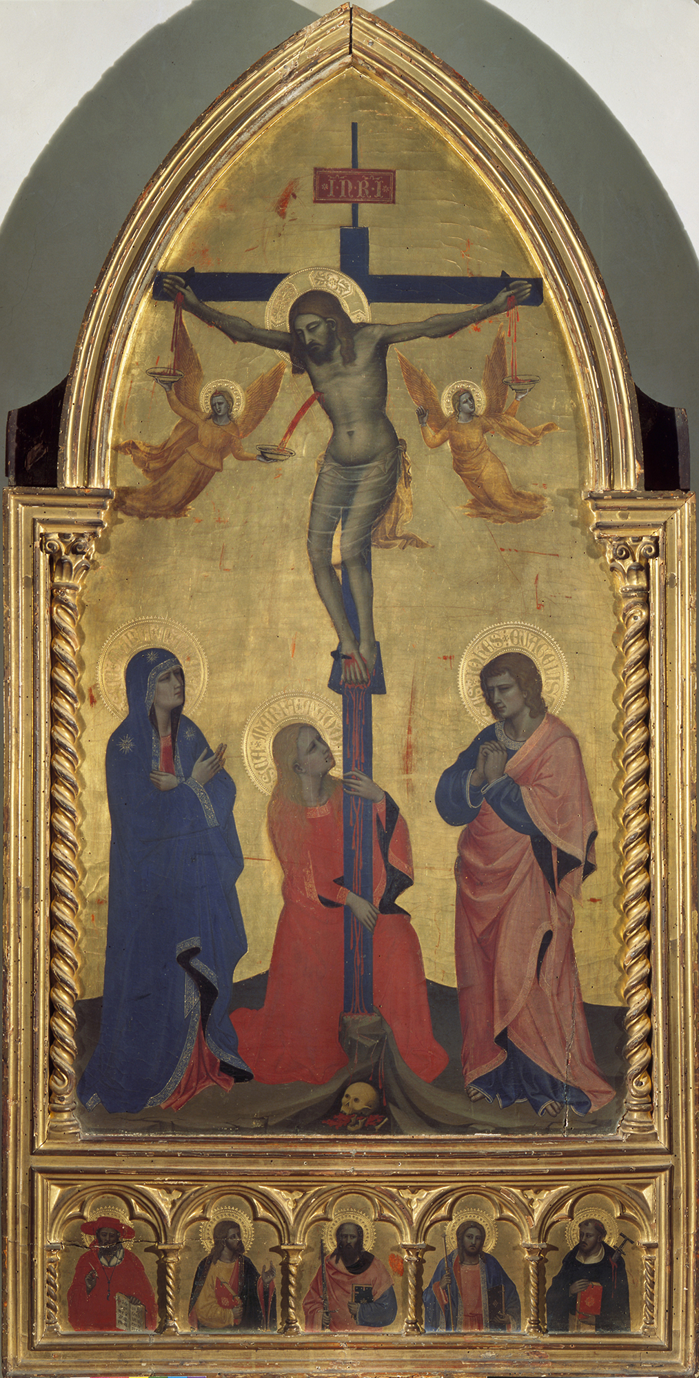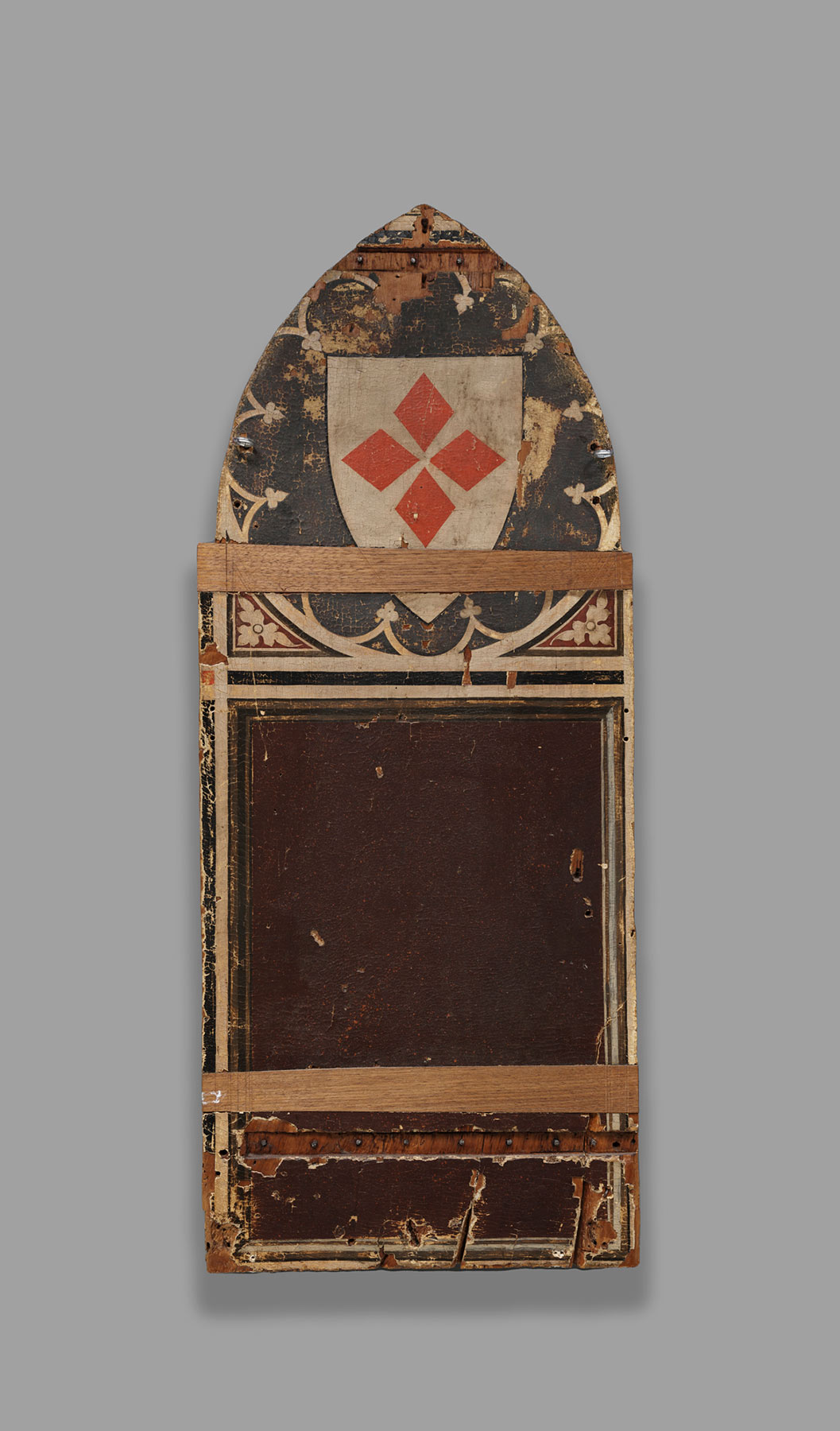 The Jarves panels incorporate a coat of arms on their reverses (see figs. 1–2)—four red lozenges arranged in a cross on a white ground—that has not been successfully identified but that may relate to a confraternal or civic commission. If, as seems likely, the panels were conceived as pendants to the Uffizi Crucifixion, a clue to that provenance may be supplied by the presence of Saint Peter Martyr among the small-scale figures in the fictive predella in the center panel. Peter Martyr, a Dominican, is credited with founding in 1244 the Societas Sanctissimae Viriginis in Santa Maria Novella, a militant confraternity intended to promote the fight against heresy within the Florentine citizenry. This confraternity gave rise to three others, one of which, the Societas Maior Sanctae Mariae, subsequently known as the Compagnia di Santa Maria del Bigallo, splintered off only one year later. The Bigallo—whose twelve captains, or rectors, were consigned banners of a red cross (signifying the papacy) on a white field—was dedicated to administering hospitals in and around Florence, initially from a seat at San Quirico a Ruballa, near Bagno a Ripoli. The Florentine commune granted them a parcel of land within the city walls, at the corner of the present via Calzolai and Piazza Orsanmichaele, in 1352. They remained headquartered there until 1425, when Cosimo de’ Medici, then treasurer of the Compagnia del Bigallo, effected their merger with the Compagnia della Misericordia, and they transferred to the present Loggia del Bigallo on Piazza San Giovanni.15