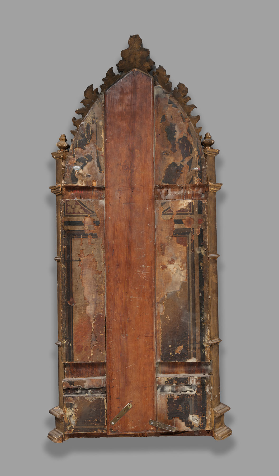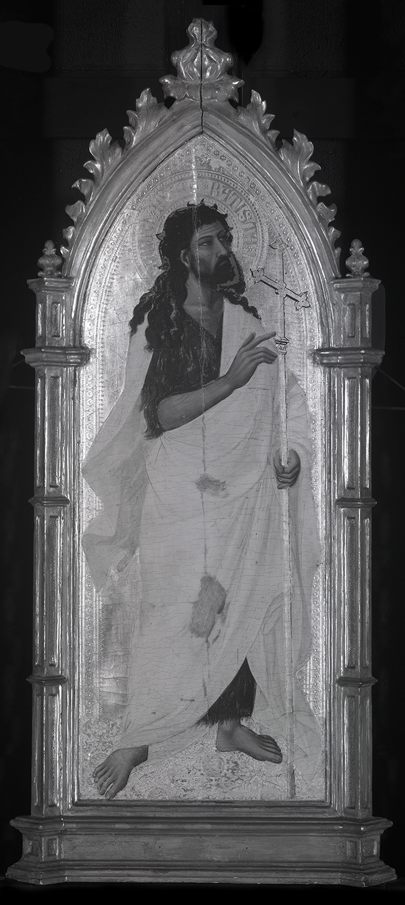 The panel supports of both panels—the Saint John the Baptist shown here and the Saint Peter catalogued before this entry—are of a vertical wood grain, are 2 centimeters thick, and have been neither thinned nor cradled, although both were beveled along the front of their lateral edges to accommodate the Gothic Revival frames applied to them in the nineteenth century. The modern frame elements and any gesso or gilding that might have remained on original moldings were stripped from the Saint Peter panel in a radical cleaning of 1971–72, at which time two battens that had been slotted into its back in the nineteenth century were replaced with new oak battens.1 The nineteenth-century frame was left intact on the Saint John the Baptist; the battens on this panel had previously been removed, probably in a cleaning of 1915, when a 13.5-centimeter-wide wooden insert running the full height of the panel was inlaid in its reverse, just left (viewed from the back) of center, to reinforce a split in the support. Both panels have 2.2-centimeter-wide horizontal channels carved in their backs, approximately 12 centimeters and 93 centimeters (on center) from their bottom edges. These were intended to receive iron strap hinges—the nails that affixed them are still preserved in the channels—which would have been recessed just below the painted surface of the reverses and gessoed and painted to continue the decorative patterns that they would otherwise have interrupted. Neither panel has been altered in width or cut at the bottom, but both have been trimmed along the profiles of their ogival arches.