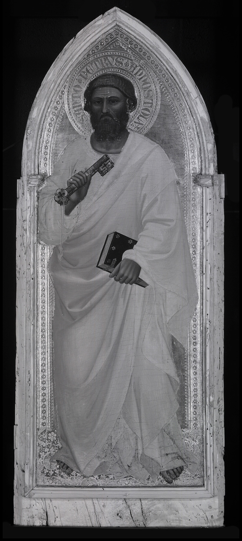 Elsbeth Selver, in Seymour, Charles, Jr., et al. Italian Primitives: The Case History of a Collection and Its Conservation. Exh. cat. New Haven: Yale University Art Gallery, 1972., 14–15, no. 6, figs. 6a–c, illustrates the Saint Peter during the course of the 1971–72 treatment, with the frame elements not yet removed, the lower batten missing, and the upper batten not yet replaced. ↩︎