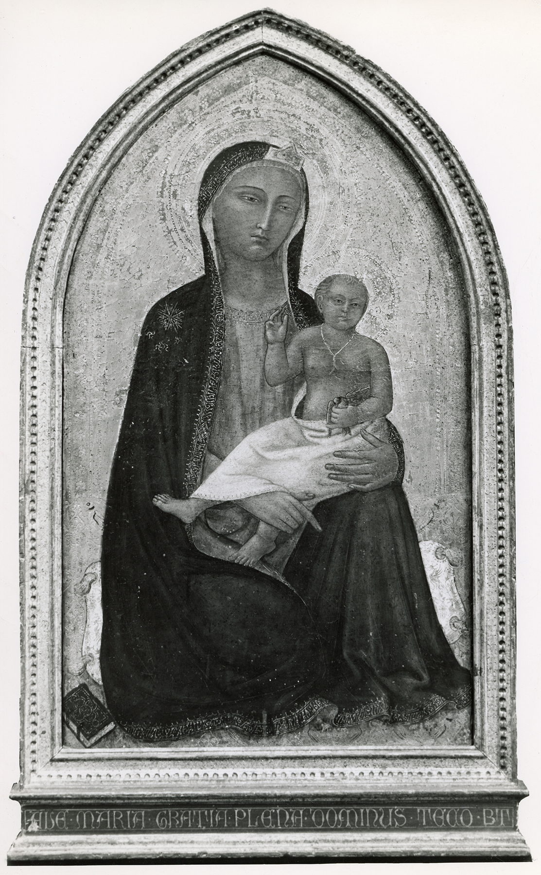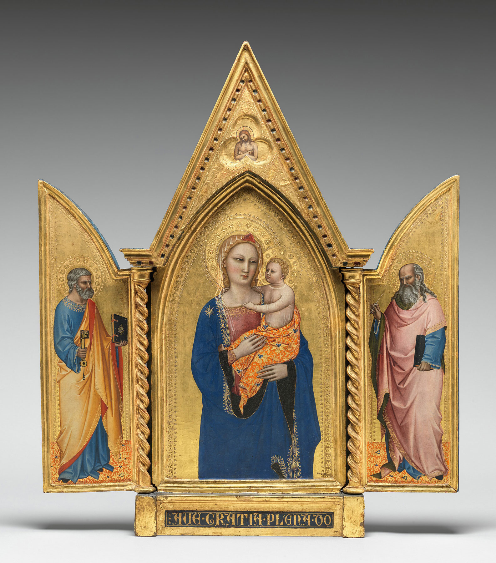 Notwithstanding its heavily repainted condition, Richard Offner, in a lecture delivered at Maitland Griggs’s home in 1925, had no difficulty in characterizing this painting as Orcagnesque, showing the influence of Nardo di Cione and Bernardo Daddi. Both artists were at that time recently recovered historical personalities, and Offner’s opinion was, in hindsight, remarkably precocious. The few subsequent notices the painting has garnered cluster around either Berenson’s association of it with Jacopo di Cione and his workshop2 or Charles Seymour, Jr.’s recognition of it as generically by a follower of Orcagna.3 So prudent an evasion of commitment to a precise attribution might seem warranted by the severely deteriorated condition of the painting, but several indices of style suggest instead that this is not simply a typical commercial product of an anonymous Cionesque or Orcagnesque artist but the ruin of a once-noble composition by Nardo di Cione. The unusual bulk of the Virgin, isolated against the gold ground and elegantly framed by the punched border of the panel (to the extent that this might reflect the original decoration); the lively turn of the Child away from her and her own attentive gaze in His direction; the delicate and slowly turning line of the cloak as it descends from the Virgin’s head to her chest; and the soft and somewhat elongated features and shape of the Virgin’s face are all reminiscent of Nardo’s Virgins, above all in the center panel of the polyptych in the Národní Galerie, Prague,4 or the center panel of the Goldman triptych in the National Gallery of Art, Washington, D.C. (fig. 2). The gilded crown on the Virgin’s brow is another feature commonly encountered in figures of the Virgin by Nardo di Cione.
