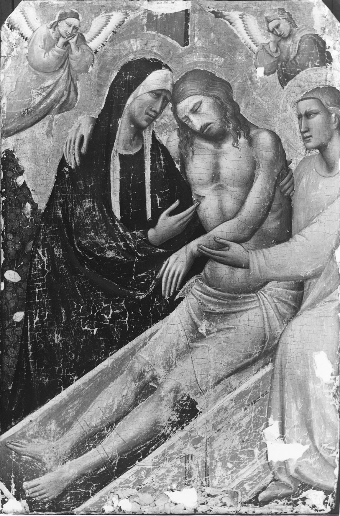 The original appearance and provenance of the Yale panel remain a subject of speculation. By the time the picture entered the Jarves collection, it had already been cut down on all sides and provided with a new summit and ogival frame that extended the vertical thrust of the composition (see fig. 1). Contrary to Keach’s assertion, however, there is no evidence to suggest that the panel was significantly reduced on both sides and that the original shape approximated that of the much larger Stigmatization of Saint Francis by Taddeo Gaddi in the Harvard Art Museums, Cambridge, Massachusetts.16 Based on comparable devotional images, it cannot be assumed that the figures of the kneeling Evangelist or even of the two flying angels were originally complete, as claimed by Keach. A clue to the panel’s shape and structure is perhaps provided by its often-noted iconographic relationship to two later Florentine works: a panel by Giovanni del Biondo in a private collection, Florence, dated to the late 1370s,17 and a painting formerly in the Grissel collection, Oxford, most recently attributed to Tommaso del Mazza and dated between 1400 and 1405.18 Both images, which develop Taddeo’s prototype into a more traditional representation of the Lamentation by the addition of other mourners and the elimination of the tomb in favor of a cloth of honor, terminate with an ogival arch at the top, filled in by the transverse arms of the Cross, with the angels hovering below. Particularly relevant are the close correspondences, first highlighted by Antal, between the Yale Entombment and the ex-Grissel Lamentation, which has similar dimensions and proportions and includes the same iconographic motif—not present in Giovanni del Biondo’s version—of the Virgin gesturing toward Christ’s wound. The ex-Grissel panel was the central element of a triptych and was originally flanked by standing figures of Saints James Major and Francis, possibly indicating a comparable context for the Yale image. If this were so, the rectangular damages at the elbows of both mourning angels and the larger losses aligned across the bottom of the panel (see fig. 2) might be explained by the removal of nails securing cross battens placed at those heights.