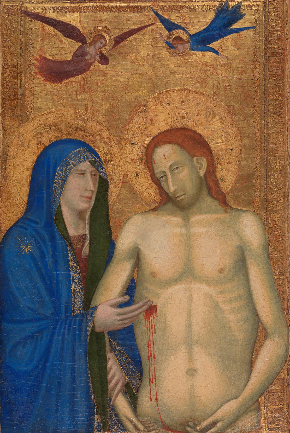 Notably missing from the scene are the multiple bystanders that usually characterize scenes of the Entombment and Lamentation. The composition is instead dominated by the monumental figures of the dead Christ and the Virgin. Her mournful gaze and gesture draw the viewer’s attention to Christ’s bleeding wound, token of His Passion and sacrifice for humanity. In this respect, the painting approximates the more iconic, meditative quality of representations of the Man of Sorrows between the Virgin and Saint John the Evangelist, in which the half-length Christ is sometimes shown rising from His tomb and pointing to the open gash in His side. The transfer of this gesture to the figure of the Virgin, however, is rare in Italian panel painting and has been interpreted within the context of the theological doctrine of Mary as Coredeemer (Maria Corredemptrix) that gained currency during the fourteenth century.4 The motif appears in only two other images before the fifteenth century: the left wing of a diptych by an anonymous Neapolitan follower of Giotto in the National Gallery, London (fig. 3), generally dated between around 1335 and 1345, and Giovanni da Milano’s panel in the Galleria dell’Accademia, Florence, signed and dated 1365.5 Although indebted to a different compositional model than the Yale picture, the National Gallery painting—generally described as a Man of Sorrows—shares a similar focus on the Virgin’s gesture. The fact that the position of her right hand, with which she both touches her Son’s wound and motions toward Him, is repeated almost exactly in the present work has led some scholars to speculate on a possible derivation from the same Giottesque prototype.6 Like more traditional representations of the Man of Sorrows, these powerfully contemplative images coincide with renewed devotion to the cult of Christ’s wounds during the course of the fourteenth century, when worship of the side wound, in particular, became enshrined in the liturgy and sanctioned by votive masses and papal indulgences.7