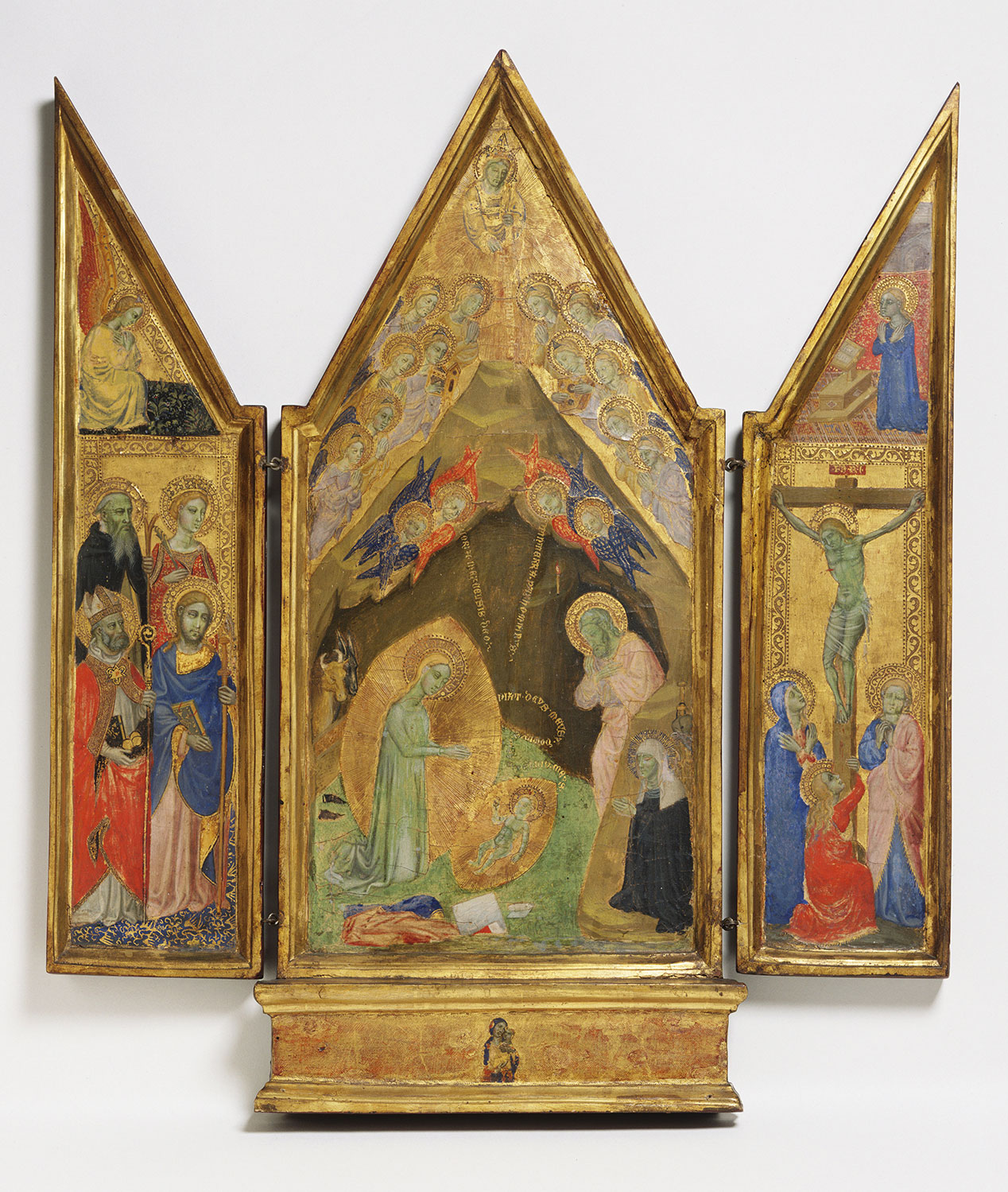 Three closely related illustrations of the mystical vision of Saint Bridget survive that are conventionally attributed to Niccolò di Tommaso: the present panel, the center panel of a gabled triptych in the Philadelphia Museum of Art, and a rectangular panel in the Pinacoteca Vaticana. These differ only slightly from one another. The composition of the Philadelphia version (fig. 1) is markedly more vertical than the other two. In it, two seraphs and two cherubs hover at the mouth of the cave, a chorus of angels fills the gold ground outside of the cave, and God the Father blesses the scene from above. Inscriptions on it are more numerous and more descriptive than on the Yale panel, and certain details follow the narrative of Saint Bridget’s vision more closely. The ox and ass, for example, are shown behind the Virgin’s back, as specifically described by Saint Bridget, and the candle left by Saint Joseph—the light of which was eclipsed by the “ineffable light and splendor” radiating from the Christ Child—is mounted on the back wall of the cave.