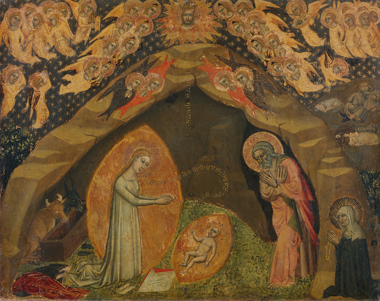 The composition, to the extent that it can still be discerned in the painting’s present state, follows closely the description by Saint Bridget of Sweden (1302–1373) of her miraculous vision of the Nativity, which occurred on March 13, 1372, while she was in Bethlehem on a pilgrimage to the Holy Land. The Virgin, dressed only in a white chemise, kneels at the left in the mouth of a cave or grotto, her discarded red robe and blue mantle lying on the ground beneath her and her shoes placed neatly behind her at the left. Her hands are joined in prayer, and her head is bowed as she adores the newborn Christ Child lying naked on the ground before her. Both the Virgin and the Child are surrounded by mandorlas of light. Beneath the Child is a large square of white cloth with its edge turned up, and between Him and His mother is a smaller rolled cloth. These were described by Saint Bridget as having been brought by the Virgin and placed by her on the ground, in anticipation of dressing her baby. Saint Joseph, in a pink or, more likely, violet robe, stands in a dark recess at the right, his hands crossed before his breast in humility. Further to the right, the diminutive figure of Saint Bridget, in a black habit and white veil, kneels outside the mouth of the cave, her pilgrim’s staff cropped at the edge of the panel and a rayed nimbus around her head. The ox and ass traditionally present in scenes of the Nativity kneel in the center of the picture field, presumably tied to a now-obliterated manger. A chorus of seven angels hovering at the top of the cave opening forms an arch above the heads of the holy figures. They, too, join their hands in prayer as they sing the praises of the Virgin and Christ Child. Outside the cave at the upper right is a fragmentary scene of the Annunciation to the Shepherds. The balancing scene at the upper left is illegible. Several inscriptions are still partially legible on the panel.