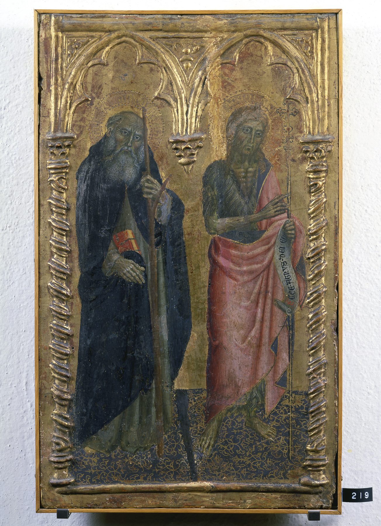 in the Virgin’s halo, AVE MARIA GRATIA; in Saint Joseph’s halo, SANCTUS IOSEP; against the ground above the Christ Child, presumably following what was once a banderole, [. . .] VS DEVS MEVS [DOMINUS?] FILLI [. . .]