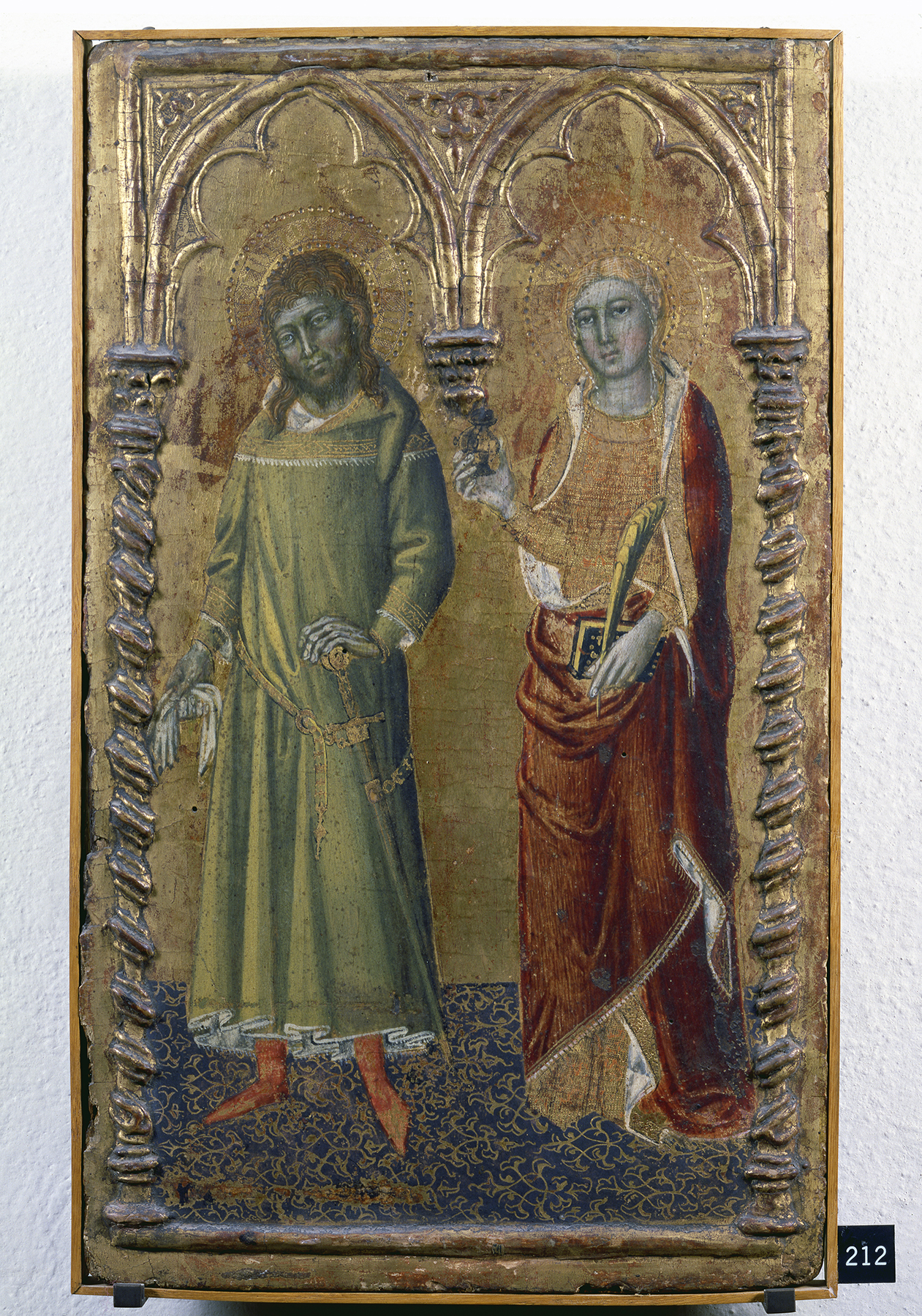 The Yale panel is—or was—painted at a level of quality and inventive originality at least equal to that of the Philadelphia panel, although the minor iconographic changes it introduces suggest that it is unlikely to have preceded the latter in ideation. It is not clear what function it might originally have been intended to serve or what its precise format might have been. It has been reduced in height and modestly in width, but it cannot be ascertained whether it was once gabled or was always rectangular. Skaug proposed, tentatively, that two panels in the Pinacoteca Vaticana representing Saints Anthony Abbot and John the Baptist (fig. 3) and Saints Julian and Lucy (fig. 4), sometimes thought to have been the wings of a triptych with the Vatican Vision of Saint Bridget at its center, might instead have been associated with the Yale panel.4 This proposal was based on a loose correspondence of dimensions and on the common use within all three of the unusual rotella punch. The Yale panel, however, is exceptionally thick for the center panel of a portable triptych and shows no visible evidence of the removal of hinges at either side. Hinges might have been driven into now-missing frame moldings surrounding the image, but for no hinge scars to be in evidence on the reverse of the panel such moldings would have to have been large enough to alter the panel’s proportions significantly, making association with the Vatican wings even less likely.