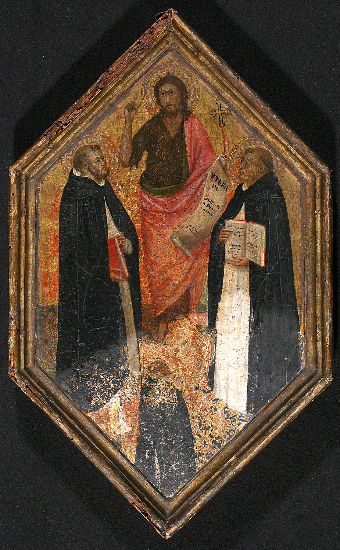 The panel, of a horizontal wood grain and evincing scarcely any warpage, preserves its original thickness of 3.8 centimeters. A prominent knot at the upper right has not provoked any movement or damage in the corresponding area of the paint surface. The engaged moldings along the two top edges of the pedimental shape are largely original; although repaired in spots, they preserve traces of their original gilded surface. The panel and these two moldings have been encased in a larger series of engaged moldings nailed and glued to them, including carved crockets along the upper edge, a stepped molding along the bottom edge to match the original moldings at the top, and a tabernacle-style base carved out of old, worm-eaten wood. These additional moldings, probably dating to the nineteenth century, were gilded, and the frieze in the base painted blue, but the gold and color in the left half of the structure were stripped back to the wood during a cleaning of 1963–67. The paint surface is in exceptionally good condition, except for scraping of the color in the aforementioned restoration campaign that has resulted in numerous small local losses scattered throughout. These are densest in the gray areas of the landscape and around the contours of the figures where they overlap the landscape.