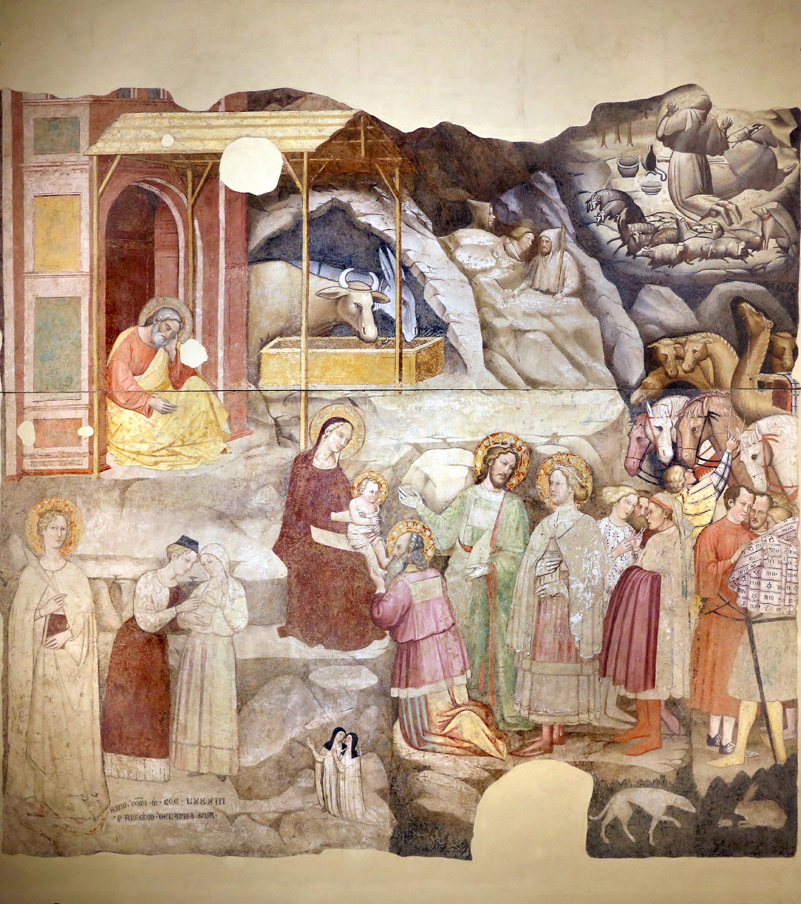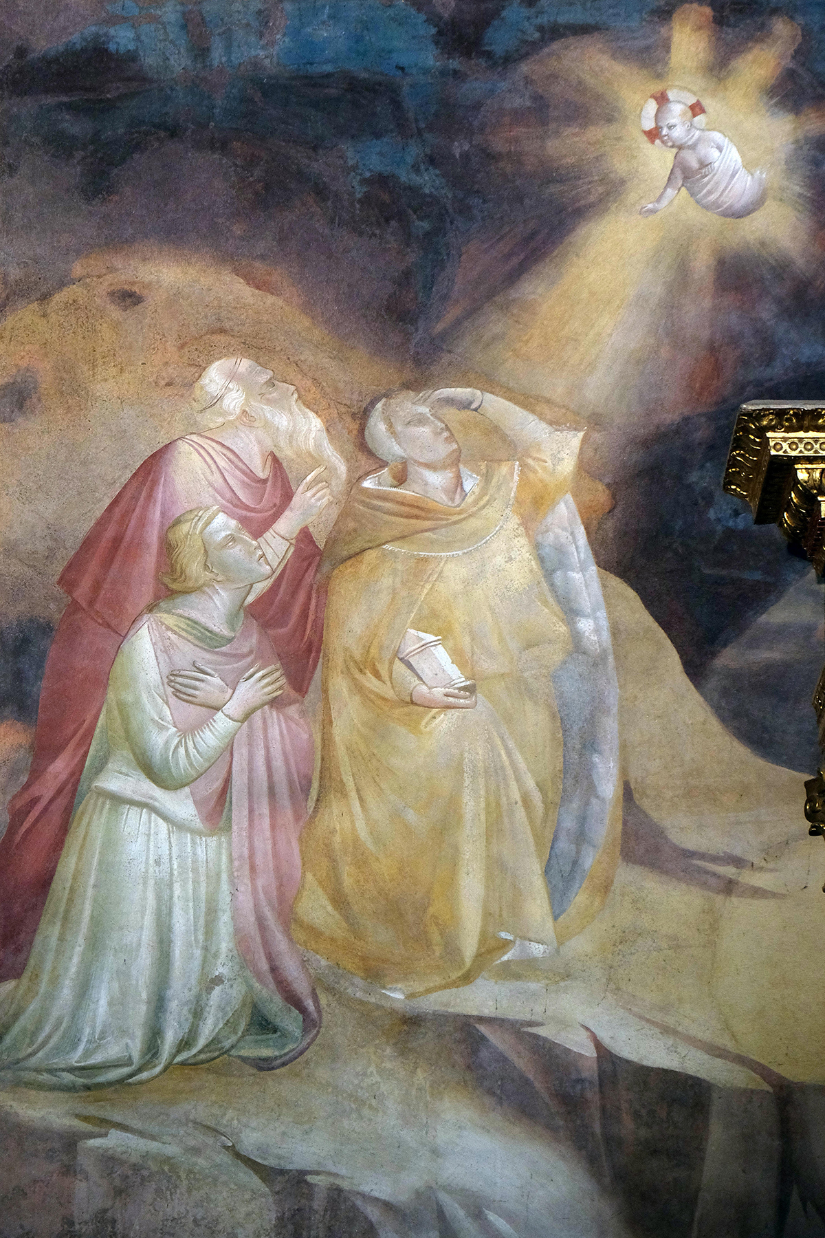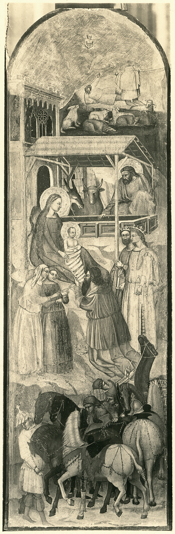 Notwithstanding its abraded condition—and elimination of most of the gilt surfaces—the Adoration still manages to retain the original charming effect produced by the sheer variety of anecdotal details and figure types, which the artist has succeeded in compressing into the limited, narrow format. The composition, combining elements of the Nativity and Adoration of the Magi, is organized vertically on different levels of the rocky landscape, which acts as both a backdrop and an anchor for the spatial arrangement. In the lowest zone, at the base of the panel, is a lively group of elegantly saddled horses and brightly clad attendants, one of whom struggles to restrain a frightened camel. In the middle ground is the main event, dominated by the large shed of the Nativity projecting from the facade of a Gothic building. Careful attention has been devoted to the architectural components of these two structures, as well as to the rendering of realistic details, such as the knotted cord threaded through holes in the wood by which the ass and ox are tethered to the manger. Disposed on different planes under the roof of the shed are the Virgin and Child, seated on a rocky outcrop, and Joseph, crouched alongside the animals behind the manger. Kneeling on a steep incline below the Virgin is one of the Magi, who kisses the Child’s feet in adoration. On the same plane as the Magi are two female attendants, presumably midwives, curiously examining the contents of the king’s gift. In the uppermost section of the composition, on the mountain’s summit, is the Annunciation to the Shepherds. Both figures are bathed in the brilliant aura of the angel; one of them is on his knees, shielding his eyes from the light, while the other, in a reclined position, has just been awakened from his sleep. Directly above the angel, centered under the panel’s pointed arch, is a diminutive Christ Child emerging from a cloud instead of the more typical representation of God the Father. The motif, relatively rare in fourteenth-century panel painting, is usually associated with images of the Annunciation to the Virgin and, more often than not, appears in a Franciscan context.1 The nearest equivalent for the present example is Taddeo Gaddi’s fresco in the Baroncelli Chapel in Santa Croce, Florence (fig. 4), which shows a small Christ Child bathed in golden light appearing to the Magi, as described in the Golden Legend accounts of both the Nativity and Epiphany: “Then there are the luminous corporeal creatures, such as the supercelestial: these too revealed the Nativity. For on that very day, according to what the ancients relate and Chrysostom affirms, the magi were praying on a mountaintop and a star appeared above them. This star had the shape of a most beautiful boy over whose head a cross shone brilliantly.”2
