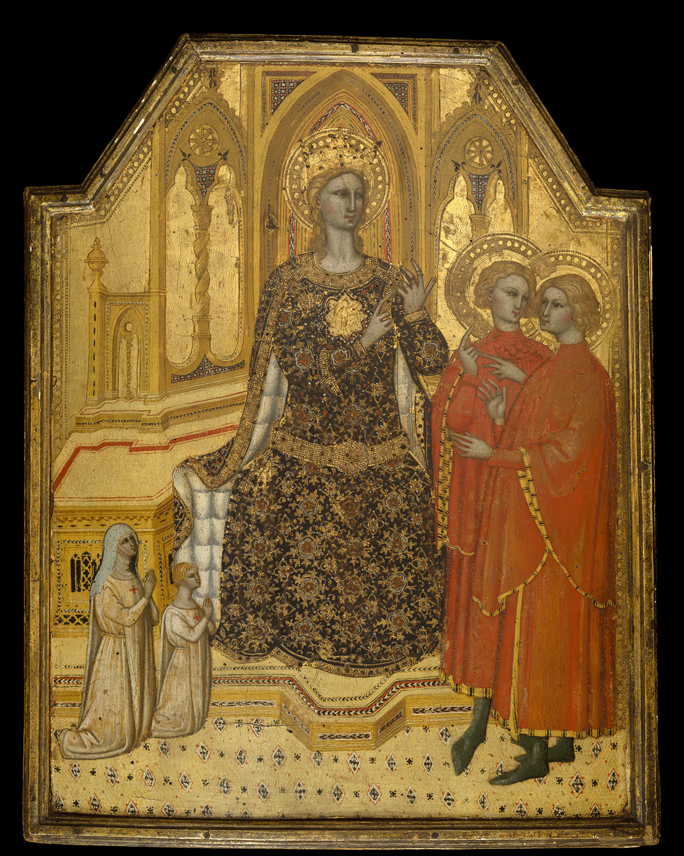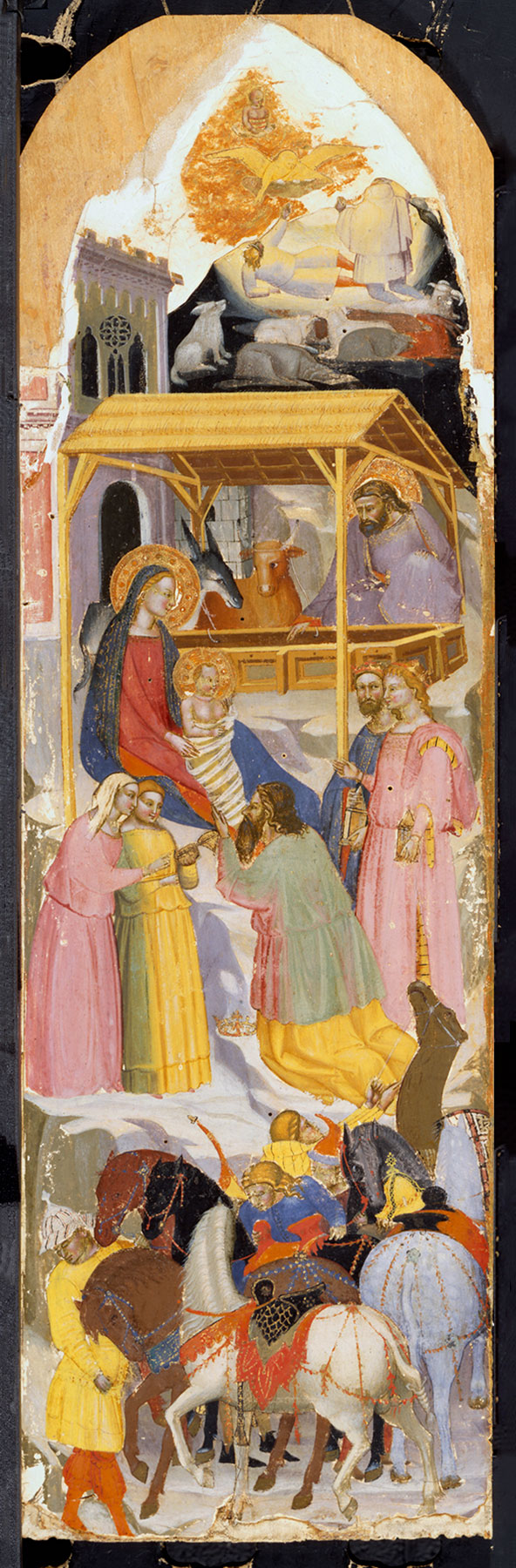 This Adoration of the Magi, along with a roundel showing the Virgin Annunciate and another with an Annunciatory Angel, are fragments of the same unidentified complex. When they were in the James Jackson Jarves collection, they were displayed in a nineteenth-century frame, with the roundels of the Annunciation placed below the Adoration of the Magi as elements of a predella (fig. 3). The size and proportions of the Adoration, however, suggest that it was originally the left wing of a folding triptych and that the small roundels probably occupied the spandrels of the central panel or the gables of the lateral ones. The original appearance of the Annunciatory Angel and Virgin Annunciate is difficult to ascertain in their present state, but the drawing of the figures and identical tooling and punching in the haloes confirm their association with the Adoration of the Magi.