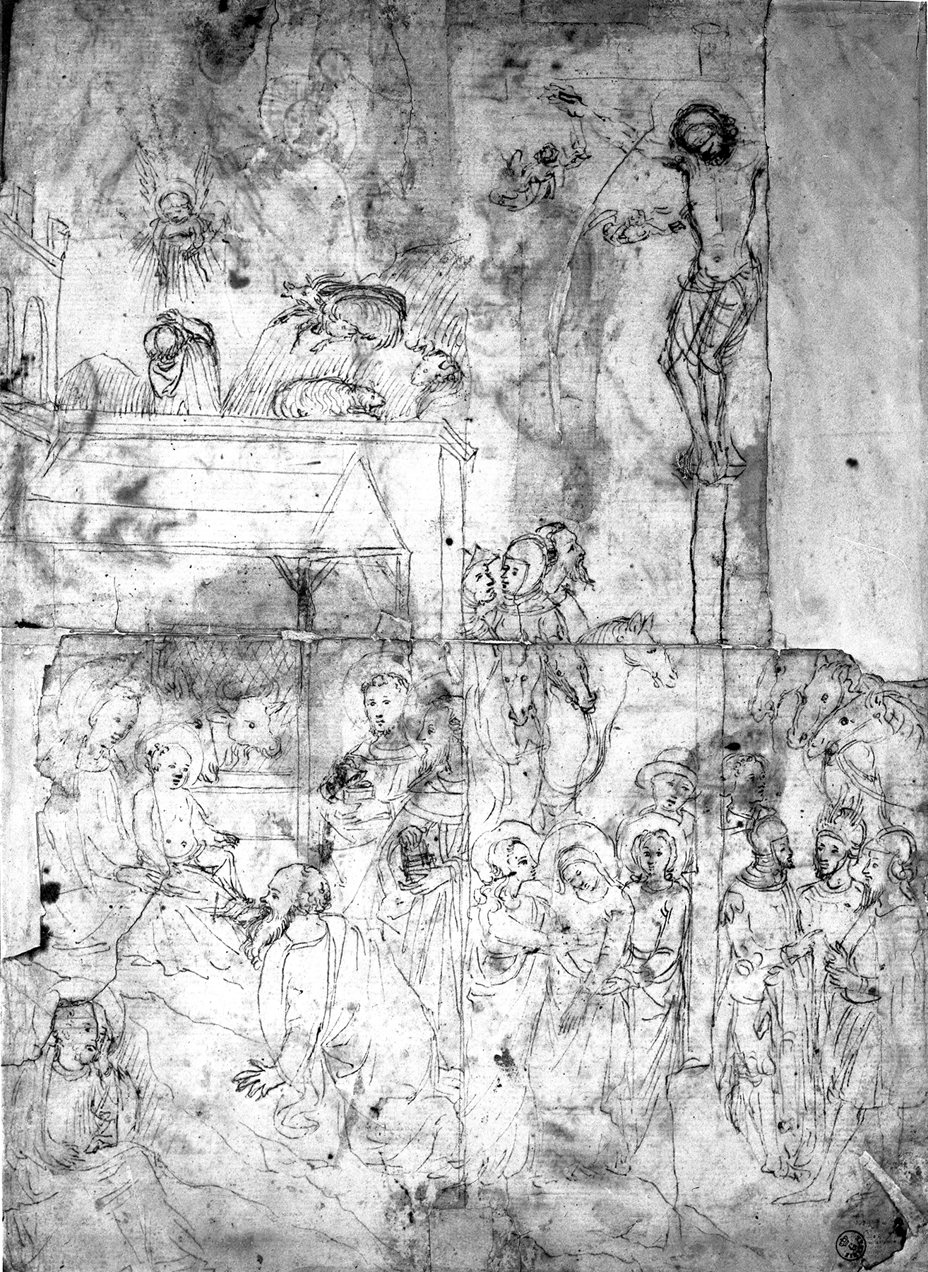 While it has not been possible to identify other elements from the same complex, a clue to the subject matter and appearance of the missing right wing of Cenni’s triptych is contained in a little-known fourteenth-century sheet of drawings in the Gallerie degli Uffizi, Florence (fig. 7). The sheet was first cited as comparison for the Adoration of the Magi by Jarves, who noted that the drawing for the “upper portion” of the picture was preserved “among the designs of the old master in the Florentine Gallery.”17 Jarves’s reference, recorded in the next two catalogues of his collection18 but overlooked or dismissed by all subsequent scholarship, is especially relevant since the sheet in question, divided along its length into two equal sections, appears, in fact, to be a sketch of the two wings of a triptych.19 On the left side is a compressed version of the Yale composition, showing the Adoration and the Annunciation to the Shepherds in the same narrow, vertical format against a rocky backdrop. Missing from the drawing is the bottom section of the Yale image and subsidiary details, such as the two female attendants and the Christ Child in the clouds, but the two compositions are otherwise identical in most aspects. On the right half of the Uffizi sheet is a crowded representation of the Crucifixion, suggesting that a similar composition also appeared in the right wing of Cenni’s triptych, opposite the Yale Adoration. The scene, the vertical thrust of which provides a parallel to the Adoration, is organized around the impossibly tall Cross, which takes up the entire length of the paper, with the various figures and animals arranged on different levels in the narrow space on either side. At the base of the Cross are the swooning Virgin, supported by the Magdalen and Saint John the Evangelist, and three soldiers arguing over Christ’s clothing. Peeking out from behind the Cross is a curious figure wearing some sort of bowler hat. On a different plane, above the main characters, are six soldiers on horseback, symmetrically disposed into two sets of three each, on both sides of the Cross (the soldiers on the right are no longer visible due to a tear in the paper).