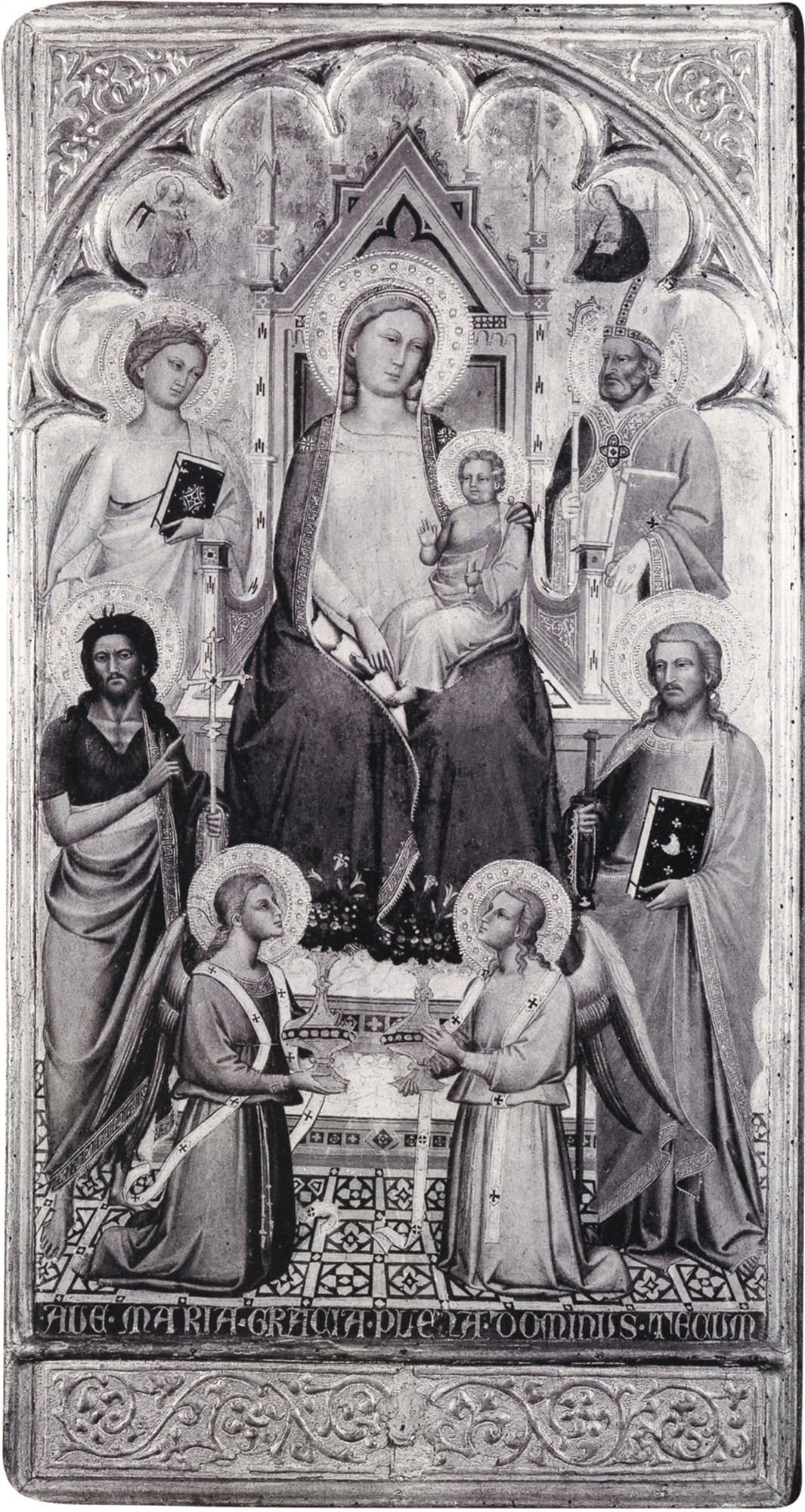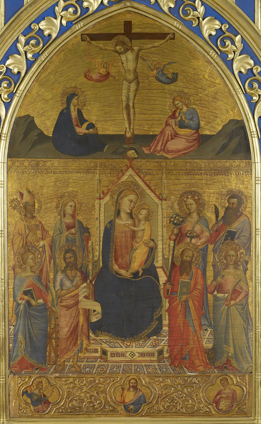 The panel, conceived as an independent devotional image, shows the Virgin seated on a throne against a red cloth of honor, with the Christ Child standing on her lap. Her right hand points to the Child, who holds a bird—probably a goldfinch, symbol of the soul and of the Resurrection—in His right hand. Standing to the left of the Virgin’s throne are Saint Nicholas of Bari and a female saint wearing a crown and holding a cross in one hand and a book and martyr’s palm in the other; erroneously identified as Saint Reparata in the early catalogues of the James Jackson Jarves collection as well as by Charles Seymour, Jr., she is more likely Saint Margaret of Antioch.1 To the right of the throne are Saints John the Baptist and Dorothy. In the gable above the main scene is a Crucifixion with the mourning Virgin and Saint John the Evangelist and two flying angels.