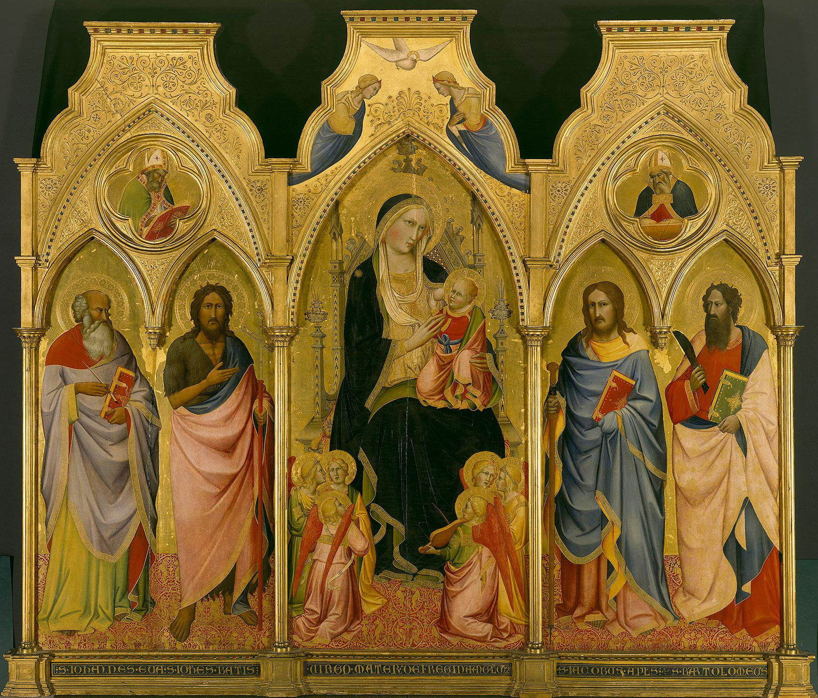 Osvald Sirén, the first scholar to study the Yale panel in any detail, over a century ago, recognized it as the left wing—or a fragment of the left wing—of an altarpiece triptych,7 but only Gronau and Boskovits have advanced suggestions for identifying any other parts of its original complex. Gronau proposed a reconstruction based on a Virgin and Child Enthroned by Agnolo Gaddi (fig. 3) that had been discovered near Pisa, framed together with a predella panel believed also to be by Gaddi representing two miracles of Saint Michael the Archangel.8 Both panels passed into the Achillito Chiesa collection in Milan, where they were separated: the Virgin and Child is now in the Contini Bonacossi Collection at the Gallerie degli Uffizi, Florence, and the predella is now in the collection of the Yale University Art Gallery (see Fra Angelico, Two Scenes from the Legend of Saint Michael). Gronau assumed these two panels came from a single source—even though the predella would originally have stood beneath a lateral panel in its altarpiece, not the central panel—and he proposed joining Saints Julian, James Major, and Michael to the complex as the figure of Saint Michael within it would thus have stood in the position of honor, immediately to the right of the enthroned Virgin and above the predella panel now at Yale. He added to his reconstruction another predella panel showing two further scenes from the legend of Saint Michael, coincidentally also in the Yale collection and now recognized to be the work of Lippo d’Andrea (see Lippo d’Andrea, Two Scenes from the Legend of Saint Michael), and a third predella panel in the Pinacoteca Vaticana,9 but he found no other fragments of the main tier of the altarpiece.