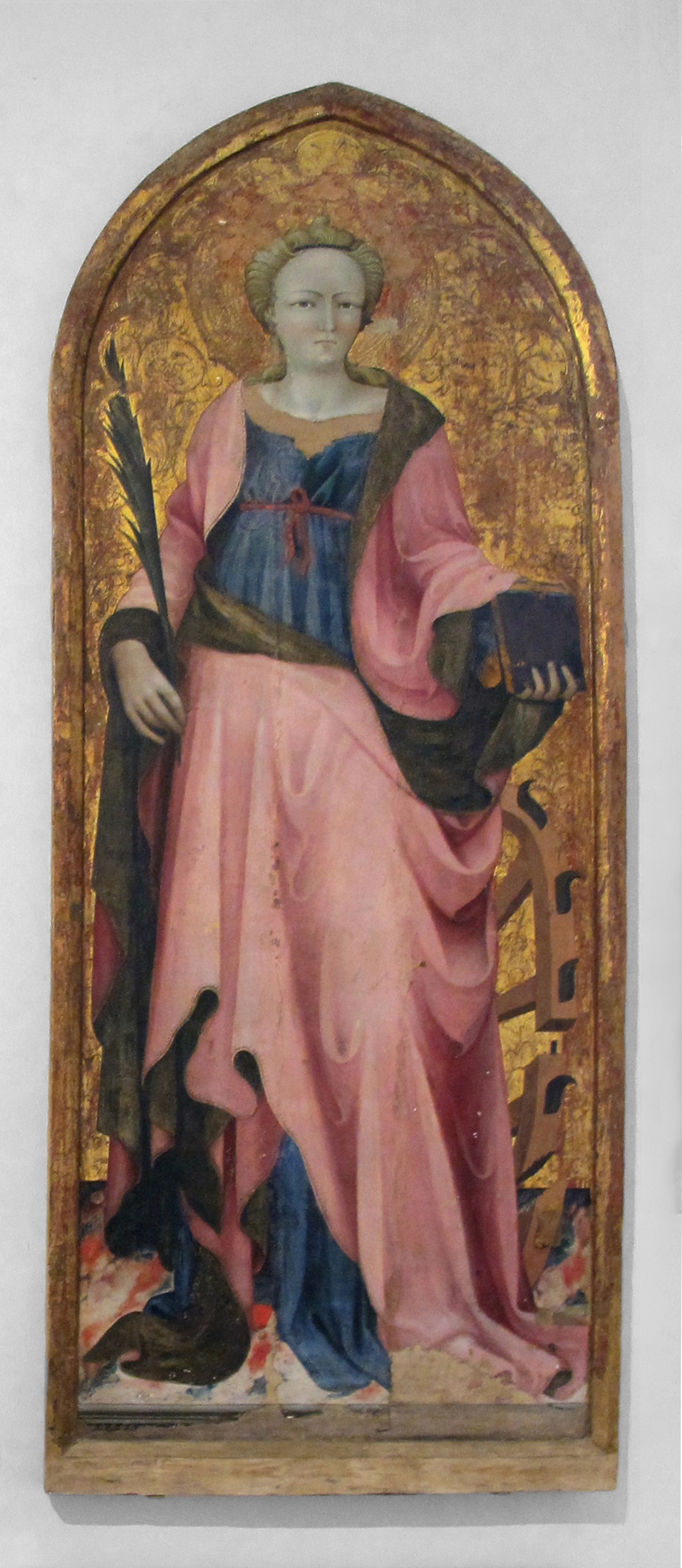 The Saint Catherine is a pendant to a Saint Michael by Lippo d’Andrea in the same museum. The pair, formerly in the church of San Domenico in San Miniato al Tedesco, Pisa, were first dated between 1415 and 1420 by Serena Padovani (in Tesori d’arte antica a San Miniato. Genoa: Sagep, 1979., 55–56, 64), based on stylistic considerations. The subsequent recovery of a 1416 document recording Lippo’s involvement in a series of frescoes in San Domenico has allowed modern scholarship to posit that the panels were most likely commissioned around the same time; see Chiodo, Sonia. “Gli affreschi della chiesa di San Domenico a San Miniato: Un capitolo poco noto della pittura fiorentina fra tre e quattrocento (Parte II).” Arte cristiana 96, no. 845 (March–April 2008): 81–94., 87. ↩︎