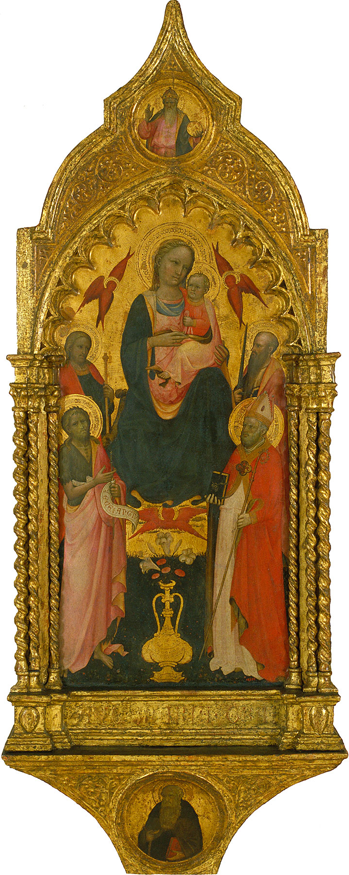 As indicated by a comparison with early photography (fig. 1), the appearance of the Virgin and Child has been greatly compromised by past interventions. The image conflates the traditional theme of the Madonna of Humility, in which the Virgin is shown seated on the ground, with the celestial vision of the Virgin and Child in Glory, where she is suspended in the sky and surrounded by golden rays. In the present instance, the Virgin was originally placed against a gilded, brocaded cloth of honor, now reduced to the original bolus preparation. Framing the Virgin and Child as in a mandorla are two cherubim, who close off the composition at the top; two standing angels bearing offerings of lilies in a vase, at the sides; and a red seraph with spread wings, at the bottom. Standing on a porphyry floor, in the viewer’s realm, are Saint John the Baptist, who raises his left hand in a gesture of presentation, and Saint Peter. In the middle between them are two large vases of lilies. The palette, now less discernible as a result of the abraded surface, once consisted of delicate pastel tones, contrasted with brilliant hues of blue, yellow, and orange.