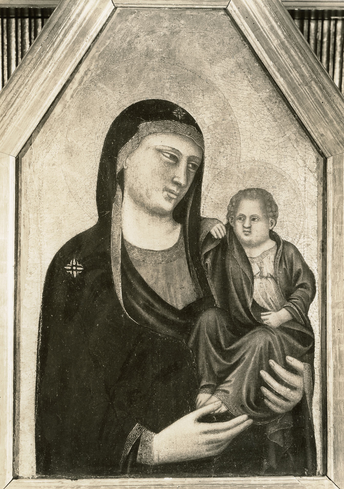 Offner’s comments in 1930 were based on the restored state of the painting that is recorded in the photograph by Mortimer Offner published in the first edition of the Corpus (fig. 1). At that time, the gold ground of the panel had apparently been releafed and the lightly abraded flesh tones liberally reinforced, lending them a sharper, more linear appearance than they actually have. Offner must quickly have become aware that the appearance of the painting was misleading. It was lent by Griggs to the 1937 Mostra Giottesca in Florence not as a work by Pacino di Bonaguida but as by the Master of the Horne Triptych, presumably with Offner’s blessing. Offner unequivocally retracted his attribution to Pacino in 1956, owning that it had been a mistake (a rare admission for him) and reverting to his initial grouping of the painting with works by the Master of the Horne Triptych.3 He bolstered this reclassification with several physical observations, including the difference in height from which the two diagonals of the panel’s gable spring—an anomaly found in other works by the Horne Triptych Master—and the general similarity in shape, size, and the pattern of the engraved border decoration to that in two other panels he ascribed to the Horne Master, lateral panels from a polyptych showing half-length saints that he discovered in the chapter house of the monastery of San Jacopo in Acquaviva, Livorno.4 The latter panels, though damaged, are so closely related to the Griggs Virgin and Child that Offner did not hesitate to suggest that they might be reconstructed as parts of a single altarpiece.