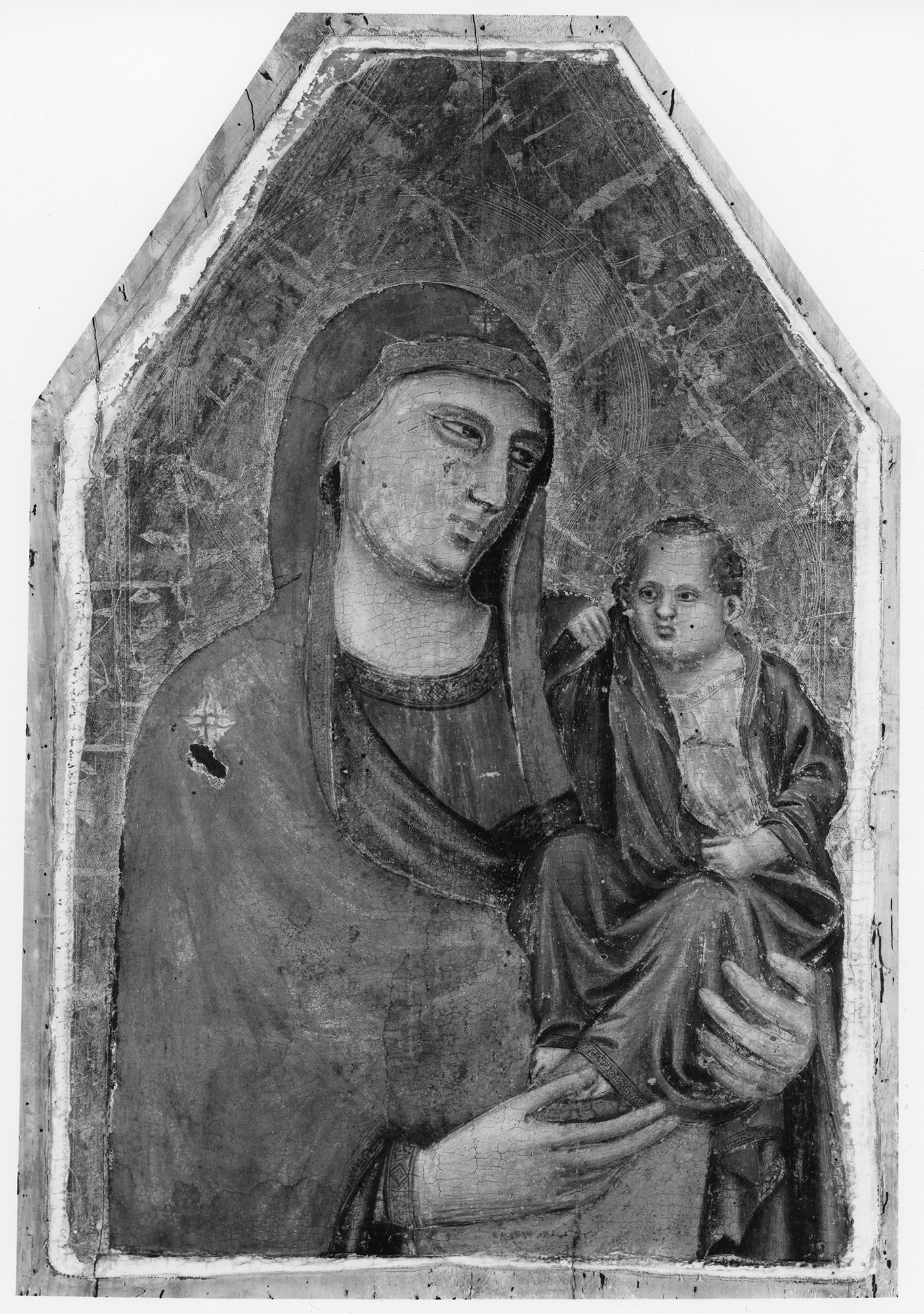 The attributional history of this painting is confusing but tends to vacillate within the orbit of three names associated with the early influence of Giotto on his Florentine contemporaries. In a letter to Maitland Griggs dated December 12, 1924, Raimond van Marle described the painting as more Giottesque than Cavallinesque, presumably in response to an unrecorded earlier association of the painting with Pietro Cavallini and the Roman school. He specifically related it to the work of the Master of Saint Cecilia, comparing it to the altarpiece in the Biblioteca Communale, Pescia,1 painted by that early colleague of Giotto. In a lecture delivered the following year, on January 19, 1925, shortly after Griggs acquired the painting, Richard Offner also affirmed its Florentine origin but pointed out its many Roman or romanizing characteristics, including the types of the Virgin’s head and the Child’s face, and the purse of both figures’ lips. He concluded that it was painted by a follower of the Saint Cecilia Master with affinities to the Master of the Horne Triptych. Offner had occasion to revise this opinion, however, for when he first published the painting five years later he assigned it to Pacino di Bonaguida, with the observation that the “weight and solidity of the forms . . . are evolved beyond [Pacino’s] hitherto identified larger panels. . . . [They] indicate a tendency towards increased plasticity, and mark a distinct phase of the master.”2 In his detailed comments on the painting, Offner noted that “the cleaning the picture has undergone, over-emphasizes the shadows a little,” perhaps by way of explaining its divergence from Pacino’s standard production.