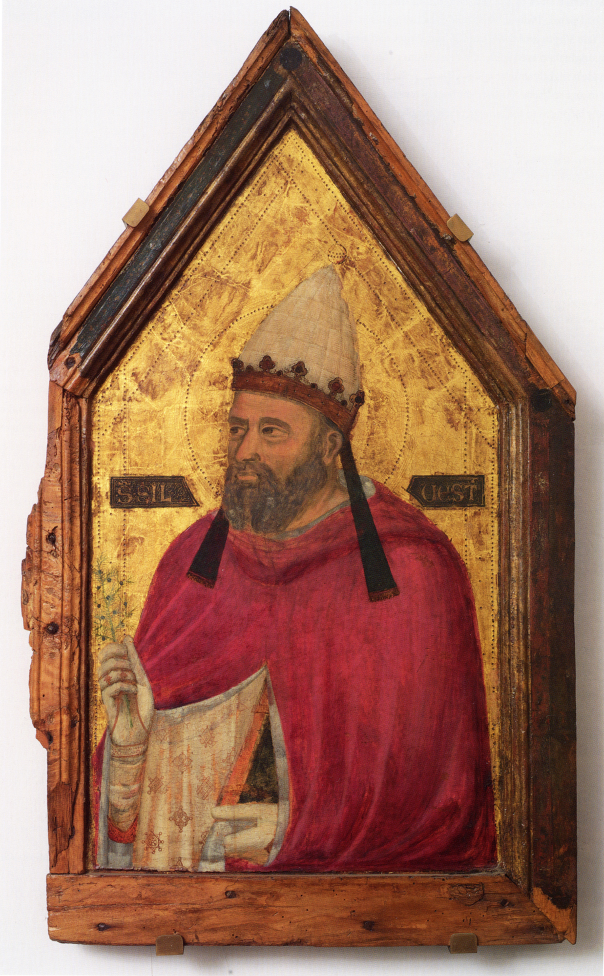 Recently, Yvonne Szafran and Christine Sciacca advanced the even more compelling suggestion that a previously unpublished half-length Saint Sylvester in the convent of Santa Maria Novella in Florence (fig. 3) might instead be a companion panel to the Griggs Virgin and Child, based on the correspondence in the patterns of their border decoration.7 They accepted Boskovits’s attribution to Pacino for both the Griggs panel and the Saint Sylvester, noting that Mojmír Frinta had identified a punch tool appearing in the latter as belonging to Pacino. While it is true that Frinta classed the Saint Sylvester as a work by Pacino, he also identified the same punch tool in several paintings by the Saint Cecilia Master.8