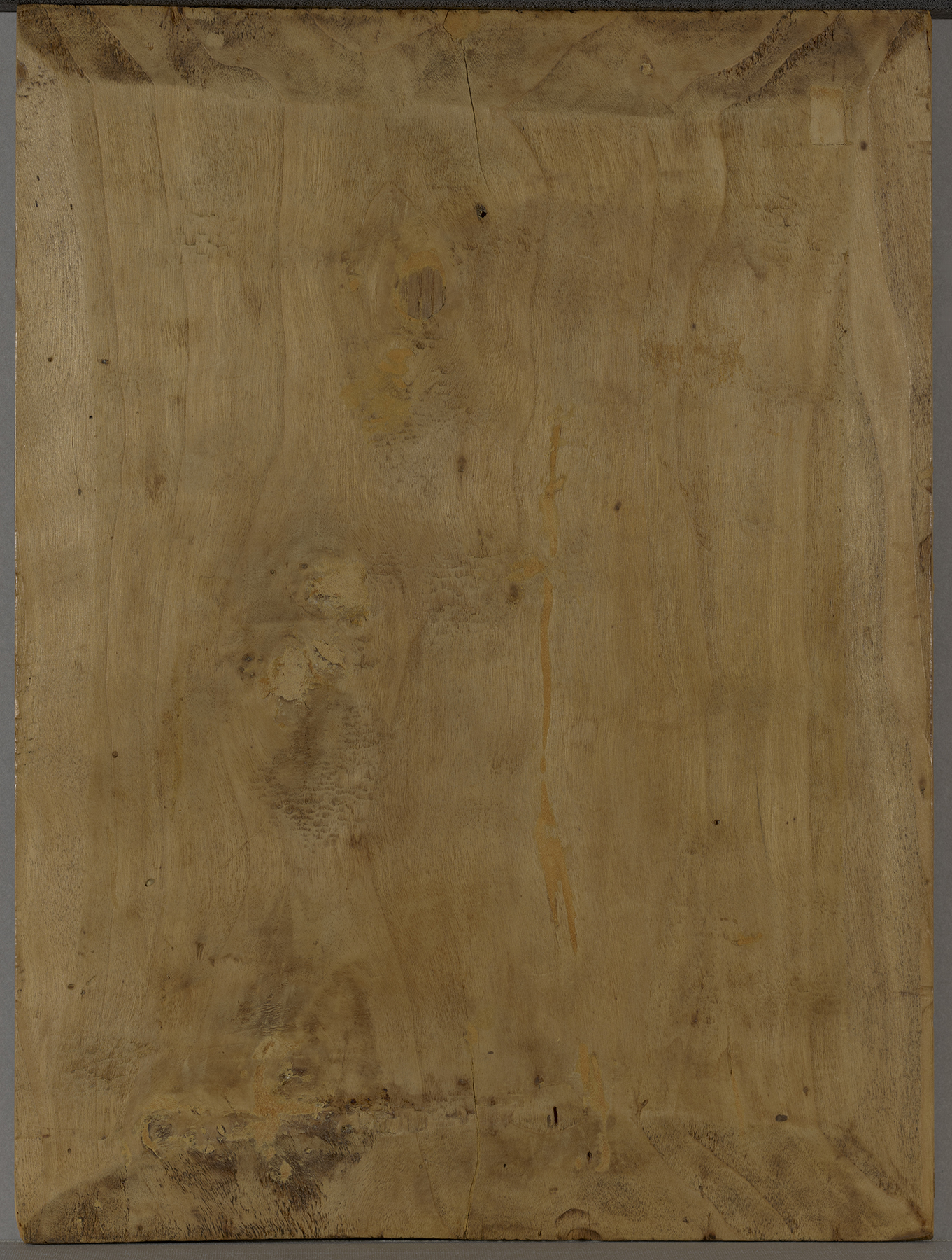 The panel support, of a vertical wood grain, is approximately 2 centimeters thick and exhibits a pronounced convex warp; chisel and gouge marks on the reverse (fig. 1) suggest that the thickness may be original. The reverse of the panel is beveled along all four edges. While this is unusual for fourteenth-century panels, there is no firm evidence that the beveling is the result of a later intervention. A small rectangular plug in the upper-right corner of the reverse is a modern repair. All the raised frame moldings are carved in one with the support rather than applied to it, an archaic carpentry technique more common in the thirteenth than in the fourteenth century. The moldings have all been liberally releafed over original bolus and gilding, though much original gold is still in evidence along the uppermost outer frame molding and the top third of the lateral moldings above the spring of the interior arch; gilding on the left molding, for example, is nearly intact in this area. The new gold has been articulated with an incised craquelure. The two roundels contained within the spandrels outside the arch are modern inserts, as are the spiral colonettes supporting the arch: the capitals and bases are original and are carved out of the wood of the support, but the colonettes are nailed in place (with modern wire nails) and cover original paint surface.