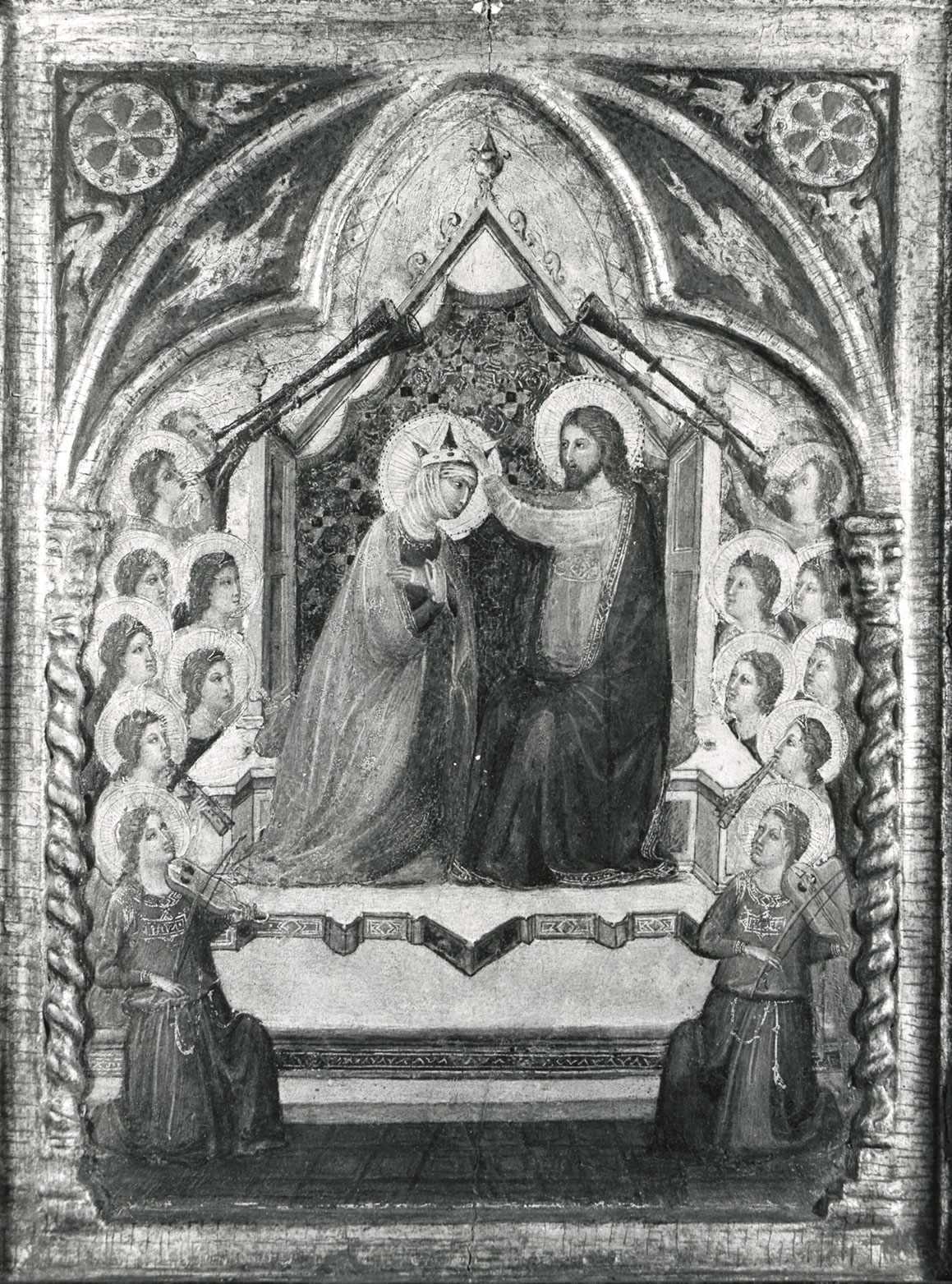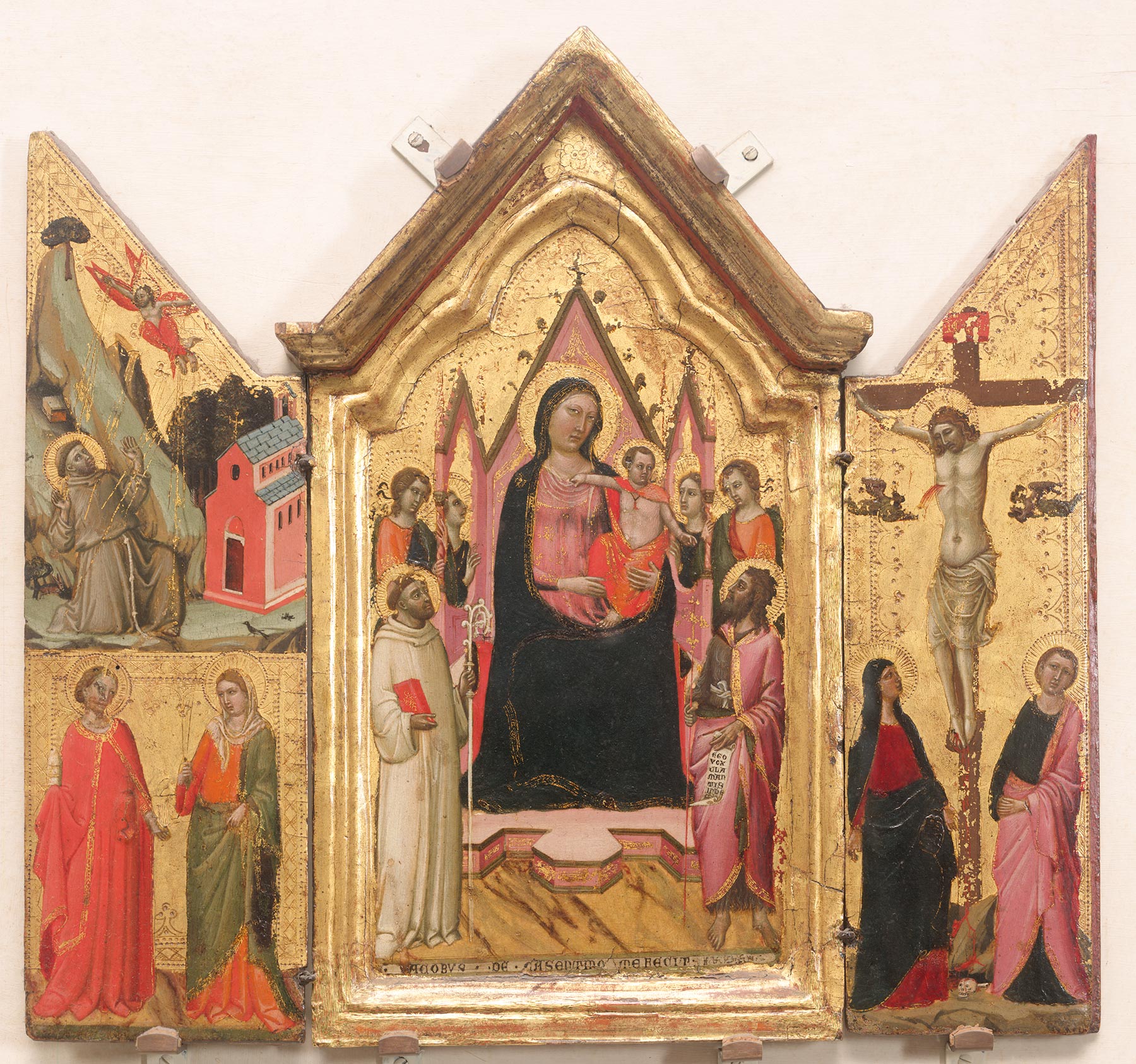 When the eminent German historian Gustav Waagen saw this panel in the collection of Rev. John Fuller Russell in 1854, he remarked upon its damaged state, commenting that only in the “fifteen [sic] angels” it depicts could one fully appreciate “the fine character of the master.”1 He identified this master as the Sienese painter Taddeo di Bartolo, possibly in recognition of the clarity and brilliance of his palette but perhaps as a slip of the pen, for only three years later, in 1857, Fuller Russell lent the panel to the Art Treasures of Great Britain exhibition in Manchester, England, with an attribution to Taddeo Gaddi, and it is difficult to imagine who, in the brief intervening period, might have corrected Waagen’s attribution. The painting retained its attribution to Taddeo Gaddi at the 1877 exhibition of the Royal Academy, London, at the sale of Fuller Russell’s estate in 1885, and again when it was lent by Henry Wagner to the 1903–4 exhibition Early Italian Art at Burlington House, London. By the time it appeared at the sale of Wagner’s collection in London in January 1925, however, the attribution had been changed to Bernardo Daddi and was quickly corrected, in 1927, by Richard Offner to Jacopo del Casentino.2 Raimond van Marle’s opinion that the panel might be by the Master of the Saint George Codex was formulated before he had read Offner’s arguments and was almost immediately withdrawn.3