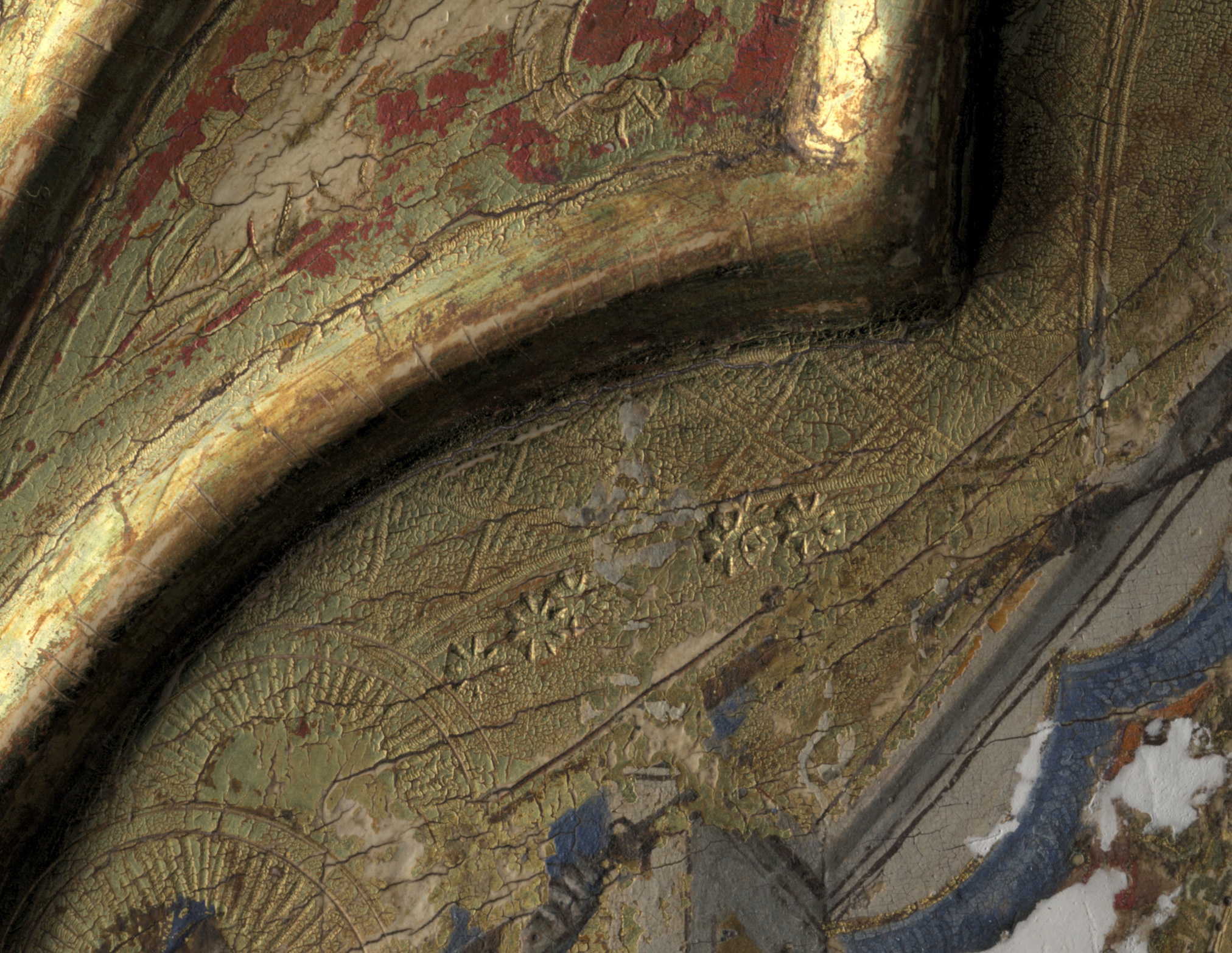 Of further interest to the question of Jacopo del Casentino’s possible training in the workshop of either Gaddo or Taddeo Gaddi may be the identification of the punch strike that appears five times along the border of the first arc of the trefoil in the frame at the left of the Griggs Coronation. The tool was struck so lightly that its impressions are visible only in raking light (fig. 6) and do not interrupt the crackle pattern in the gold created by the stylus ruling of the border pattern. The incomplete impressions were described by Skaug as an “eight-part asterisk . . . unlike Jacopo’s secure punches,” but they do approximate the impressions of another tool catalogued by Skaug that was used exclusively by Taddeo Gaddi in his earliest paintings.14 That Jacopo used this tool so tentatively and discontinued its application after a single arc of the border implies an indecisive or experimental approach that may be yet another indication of an early date for the painting. Similarly tentative are the facts that only one halo among the sixteen angels is decorated with a dotted rim and even this is not dotted along its full perimeter, and that the “perspective” tiling of the foreground continues beneath the first riser of the dais of the throne, revealing an uncertainty in the planning of the composition from the outset.