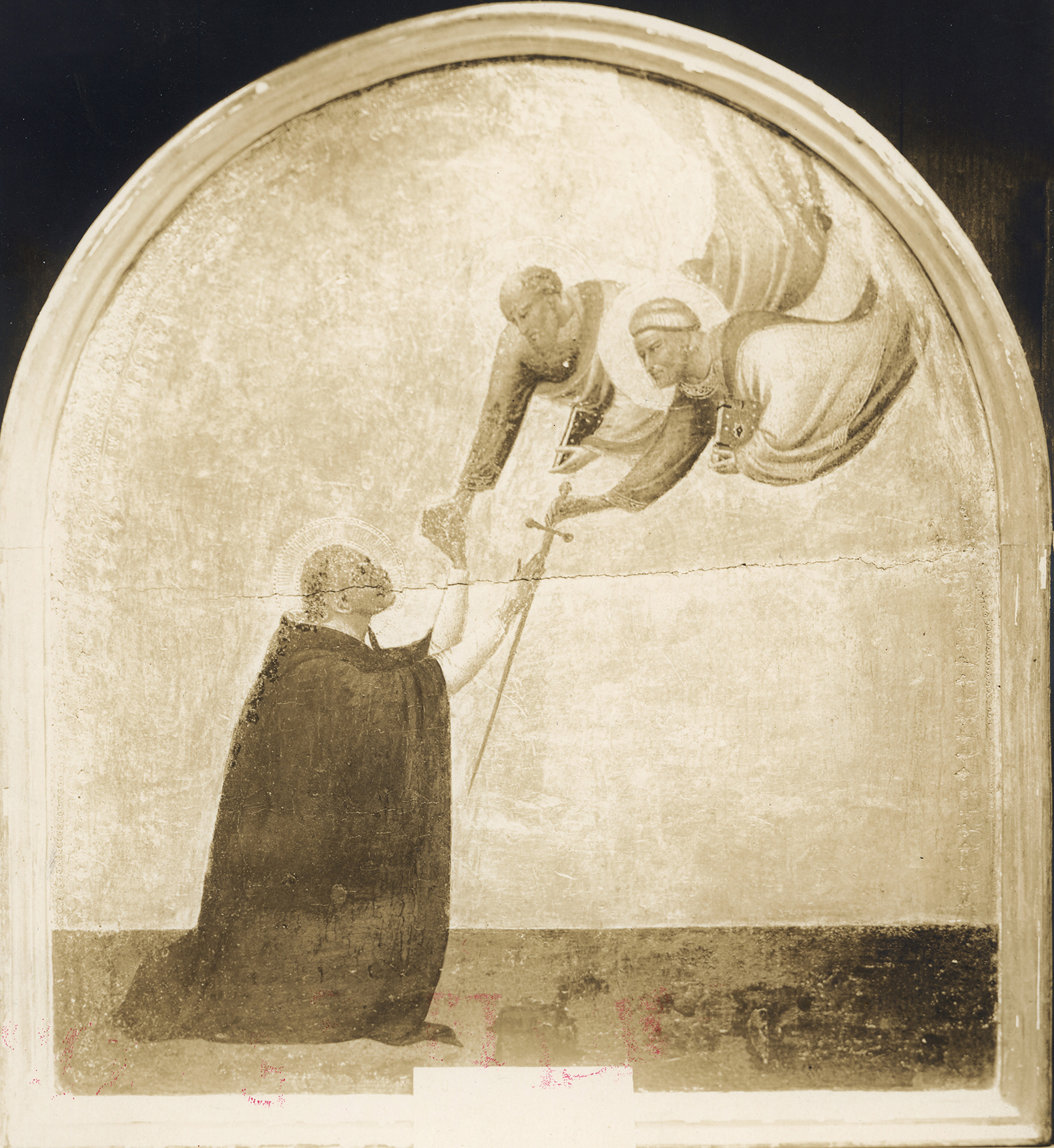 The panel support, of a horizontal wood grain, has been thinned to a depth varying between 7 and 10 millimeters and exhibits a pronounced convex warp. A split running the full width of the panel on a slight diagonal rises from the bottom of the spring of the arch at left to the top of the spring of the arch at right, resulting in a near-complete loss of pigment where it crosses through the head of Saint Dominic. In 1915 Hammond Smith noted that this head had suffered flaking losses, but these were revealed in photographs to have been minor (fig. 1). He recradled the panel at that time and repainted the head of Saint Dominic (fig. 2). His restorations and cradle were removed by Andrew Petryn in 1957, and the split was glued together. In this cleaning, the gold ground was abraded to its bolus and gesso underlayers, the head of Saint Dominic was obliterated, and the beards of Saints Peter and Paul were removed. The two latter figures are otherwise reasonably well preserved, except for the trailing end of Saint Peter’s pink robe, as are the black and white of Saint Dominic’s habit, including his left cuff and right hand where they pass over the split in the panel. Also removed in the 1957 cleaning was the sword that had been painted over a staff proffered by Saint Paul to Saint Dominic. Only the engraved profile of the staff remains today. The hands of all three saints retain much of their expressive character.