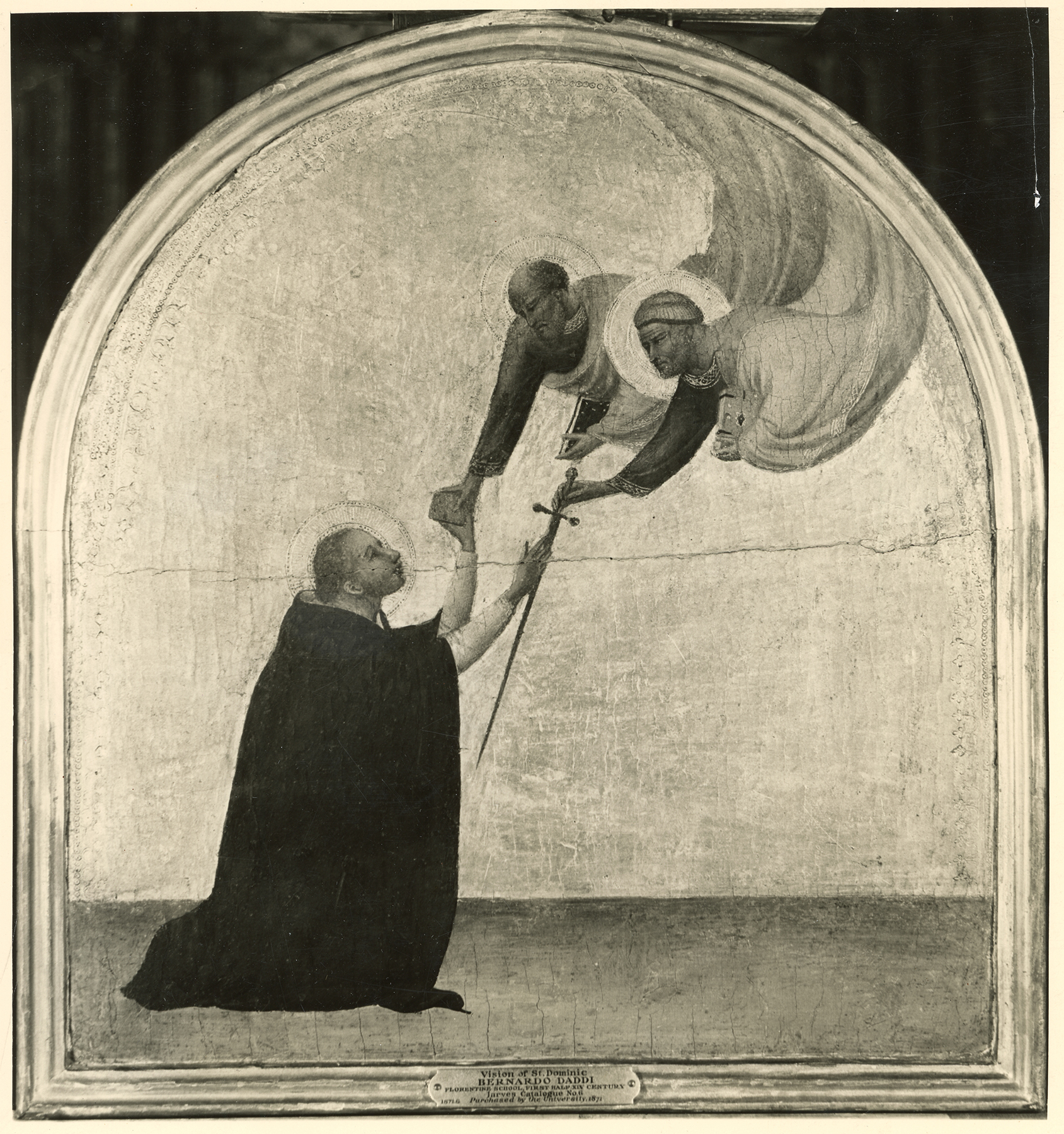 Associated by James Jackson Jarves and by early commentators on his collection with the name of Giotto’s foremost pupil, Taddeo Gaddi, the Vision of Saint Dominic was first recognized by Osvald Sirén as the work of Bernardo Daddi, part of the earliest reconstructions of that artist’s personality.1 This attribution has not been doubted or questioned since, and the painting has indeed come to be accepted—as its lengthy bibliography attests—as one of the iconic images of early trecento painting in Florence. Roberto Longhi, who held Daddi in far lower esteem than did any of his non-Italian contemporaries, went so far as to label it the apogee of Daddi’s career (“[L’artista] non era mai salito più in alto [in qualità]”).2 The only debate the panel has elicited has revolved around its iconography, its condition, and the identification of the complex from which it came.