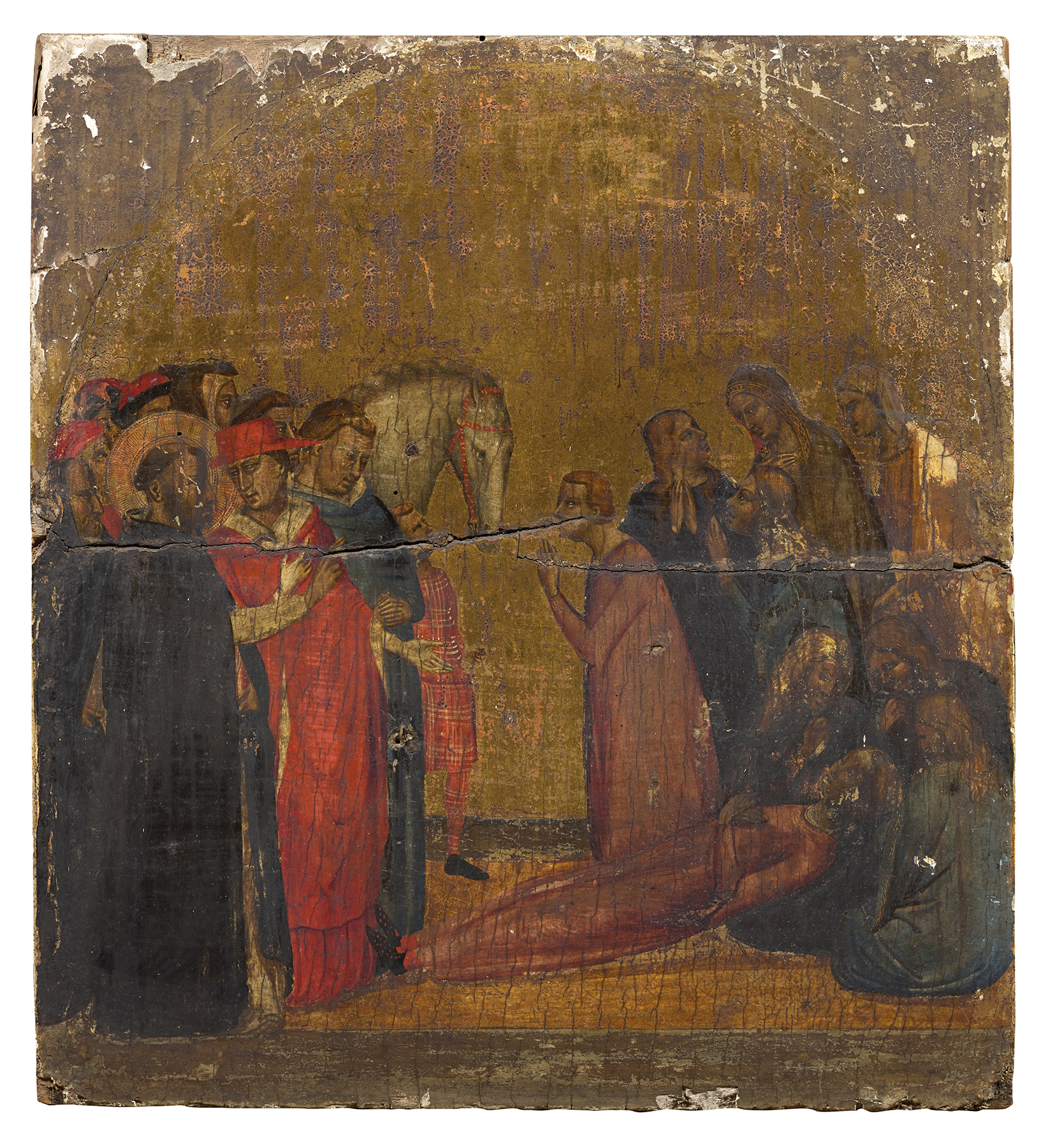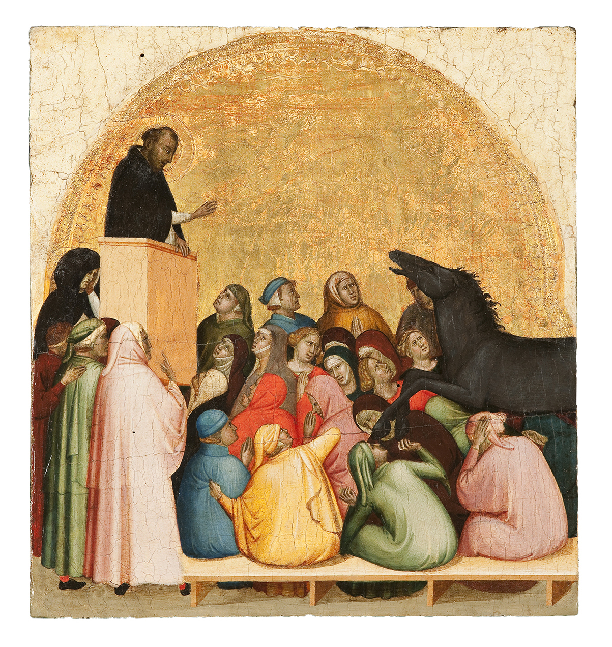 The Gemäldegalerie panel, thought to represent a miracle of Saint Dominic, was first associated with the others by Raimond van Marle; van Marle, Raimond. The Development of the Italian Schools of Painting. Vol. 3. The Hague: M. Nijhoff, 1924., 373–75. The correct subject was identified by Richard Offner, cited in the 1931 catalogue of the Gemäldegalerie, and a full reconstruction of the predella was published by Offner in 1947; see Offner, Richard. A Critical and Historical Corpus of Florentine Painting: The Fourteenth Century. Sec. 3, vol. 3, The Works of Bernardo Daddi. Ed. Miklós Boskovits. Florence: Giunti, 1989., 185–205, pl. 8. ↩︎