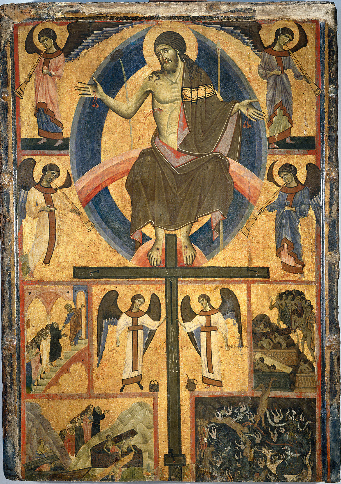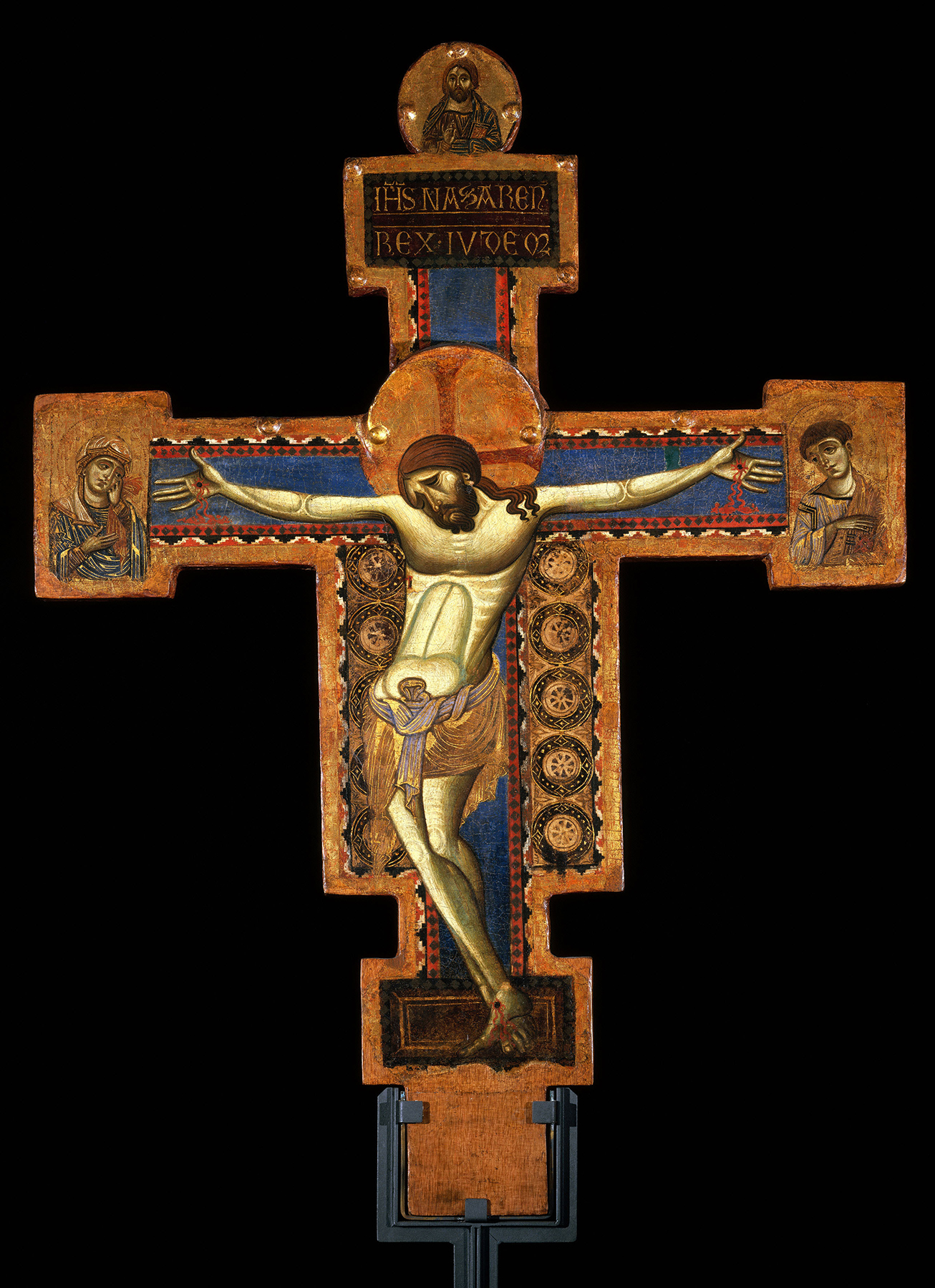 Described as a “little masterpiece” by Richard Offner, this beautifully preserved panel was probably the pediment above a large altarpiece or reliquary cupboard.1 Occupying the full height of the composition is the Crucified Christ, whose sharply curved body is set against a brilliant blue Cross inscribed with His name in Greek letters. The deep folds of His ochre loincloth are highlighted by delicate gold striations. Kneeling in adoration below the Cross, her arms wrapped around its base, is the diminutive figure of the penitent Mary Magdalen, clad in a scarlet robe also highlighted in gold. Arranged symmetrically around the Crucified Christ are two groups of figures whose size and placement follow the slope of the panel. Standing on the left is the full-length figure of the mourning Virgin followed by Mary Cleophas and Mary Salome, each shown in a different attitude of distress. On the opposite side is the mourning Saint John the Evangelist, behind whom is a lively group of soldiers in various dynamic poses. A centurion, shown with a Jewish headdress, directs attention toward the Cross with a gesture of declamation, proclaiming to his companions that “truly this was the Son of God” (Matt. 27:54). Two of the soldiers behind him look up in awe, while a third recoils in fear.