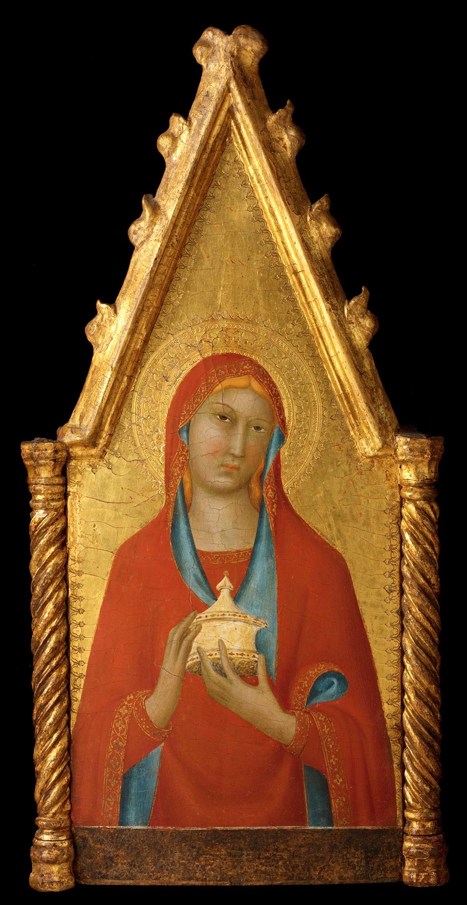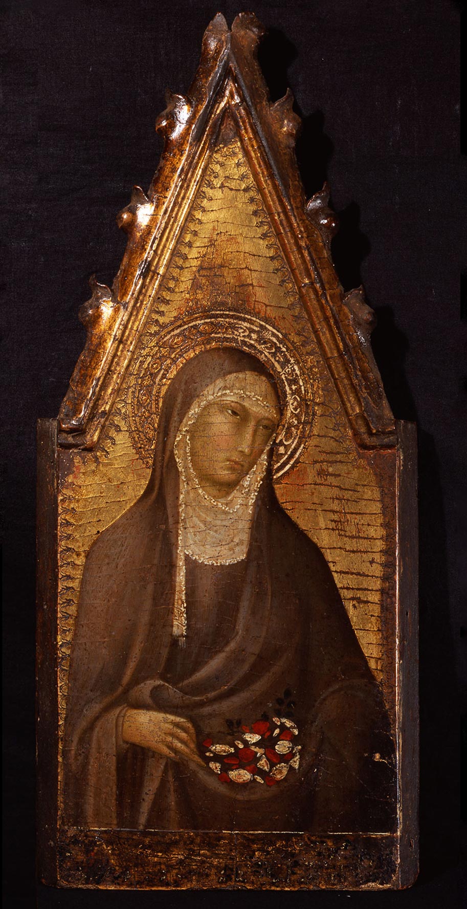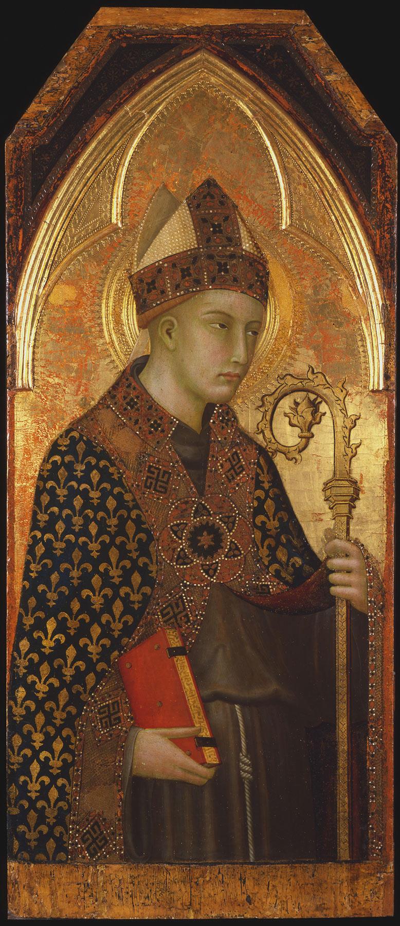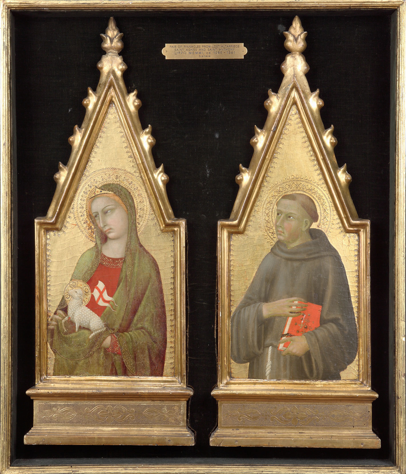 Returning to the altarpiece of which the Griggs Evangelist once formed part, Mallory further observed that the Saint Francis and Saint Louis of Toulouse in Siena were recorded in 1865 in the church of San Francesco in Colle Val d’Elsa. Since these panels conform in style, internal measurements, and frame design to the panels in New Haven, New York, Paris, and Washington, that provenance was then extended to the entire altarpiece. Establishing a Franciscan provenance for this altarpiece also allowed Mallory to propose the identification of five pinnacle panels from the structure. These included three more Franciscan saints: Saint Clare (fig. 7), in the Metropolitan Museum; Saint Elizabeth of Hungary (fig. 8), in the Museo Poldi Pezzoli, Milan; and Saint Anthony of Padua, in the Frick Art and Historical Center, Pittsburgh; along with Saint Agnes, also in the Frick collection, Pittsburgh (fig. 9); and Saint Mary Magdalen (fig. 10), in the Rhode Island School of Design Museum, Providence. A sixth pinnacle has been added to these more recently: Saint Augustine (fig. 11) in the Salini Collection at the Castello di Gallico, near Asciano. Finally, Bagnoli, who correctly accepted this complete reconstruction, observed that none of these panels, including the two now in Siena (where they were brought in 1867), is recorded in San Francesco in Colle Val d’Elsa in any source earlier than 1865.14 He noted instead that several fifteenth-century panels also appearing in the 1865 inventory of San Francesco in Colle Val d’Elsa are documented as commissions from the Franciscans at San Gimignano. That community relocated to Colle in 1787, following the suppression of their own convent five years earlier. This fact, combined with the prominence of the Memmi family workshop in San Gimignano, led Bagnoli to propose the church of San Francesco, outside the walls of that town, as the probable original site of this altarpiece. The church of San Francesco at San Gimignano was destroyed in 1553, at which time the friars were reassigned to conventual premises at San Giovanni Battista, inside the walls of the town. They remained there until the suppression of the chapter in 1782 and their relocation to Colle Val d’Elsa in 1787.