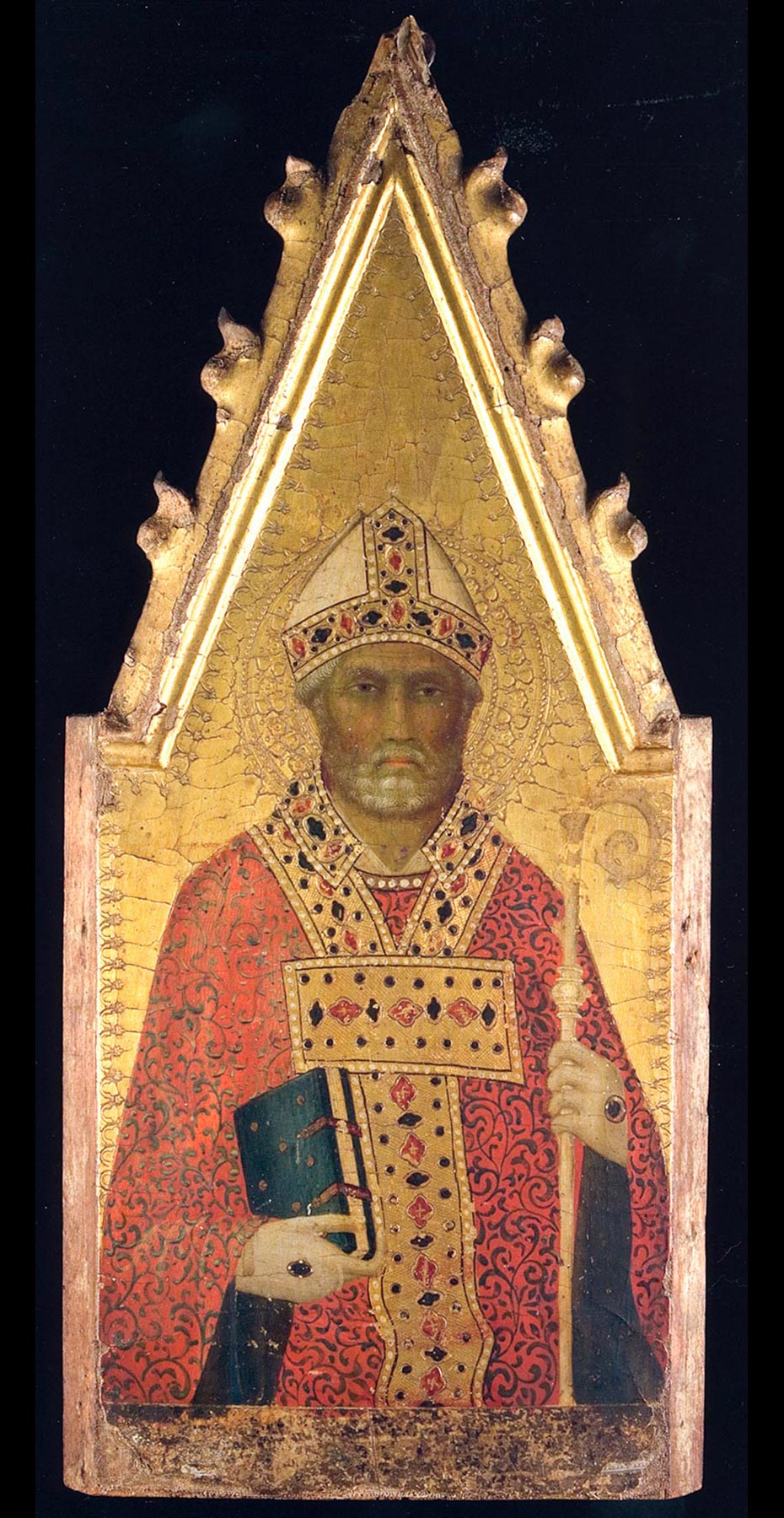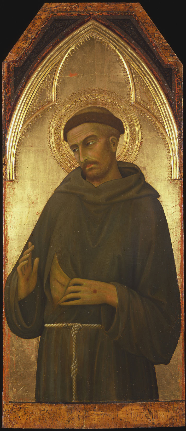 The panel, of a vertical wood grain, is 2.5 centimeters thick but may have been thinned slightly, no more than 5 millimeters, judging by the off-center positioning of the dowel holes on its edges. These occur at 7, 40.5, and 75.5 centimeters from the bottom on the left margin and at 7, 41.5, and 76.5 centimeters from the bottom on the right margin. The spandrel applied above the arch of the panel is a 7-millimeter-thick panel with a horizontal grain; its original silver decoration is missing, but the bolus, punched ornament, and blue sgraffito decoration are intact. A capping molding at the top of this spandrel is missing. A split in the primary panel support, originating at its top edge (beneath the spandrel) and extending just right of center to the level of the saint’s forehead, is open and has caused minor losses in the gold ground through which it passes. Three smaller splits rise from the bottom of the panel, only one of which, near the left edge, reaches above the 6.5-centimeter-wide area of exposed wood that originally bore an attached predella or base molding. A 1.5-centimeter-wide strip of exposed gesso and linen above this base molding probably indicates a lost portion of paint surface: no barb is visible anywhere along the bottom edge of the composition. A cradle formerly attached to the back of the panel was removed in 1959, and scars from batten nails 11.5 and 72.4 centimeters from the bottom were filled with wood putty.