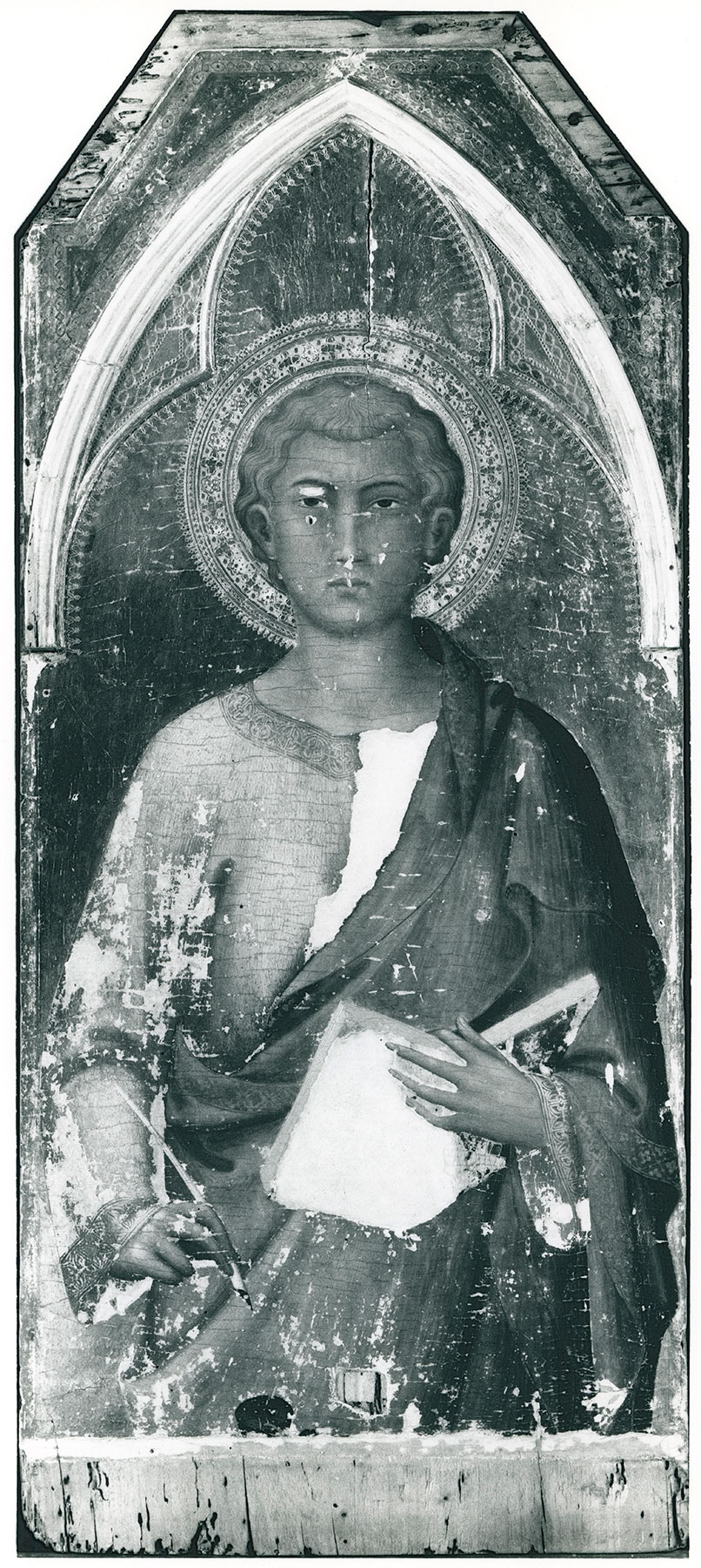 The gilding overall is well preserved, except for approximately 1-centimeter-wide strips running the full height of each side of the panel, beneath the spring of the arch molding; presumably, applied colonettes once covered these areas, which therefore may originally not have been finished with more than polished bolus. Missing corbels or capitals at the spring of the arch at each side are indicated by exposed areas of gesso. Abrasion to the gilding is greater on the right side of the panel than on the left and is particularly evident above and below the points of the trilobe framing arch, whereas the saint’s halo, the interior spandrels, and the top lobe of the arch are beautifully preserved, as is most of the gilding on the left side of the panel. The mordant gilt decoration of the saint’s robe is largely intact. The paint surface is thin but generally well preserved, with light overall abrasion. Areas of total loss, as revealed by the aggressive cleaning by Andrew Petryn in 1959 (fig. 1), include the green cover of the saint’s book; shadowed areas in his blue tunic at the breast, right sleeve, and left cuff; and scattered smaller losses in the lower portion of his red cloak. These were filled and inpainted by Gabrielle Kopelman in 1985.
