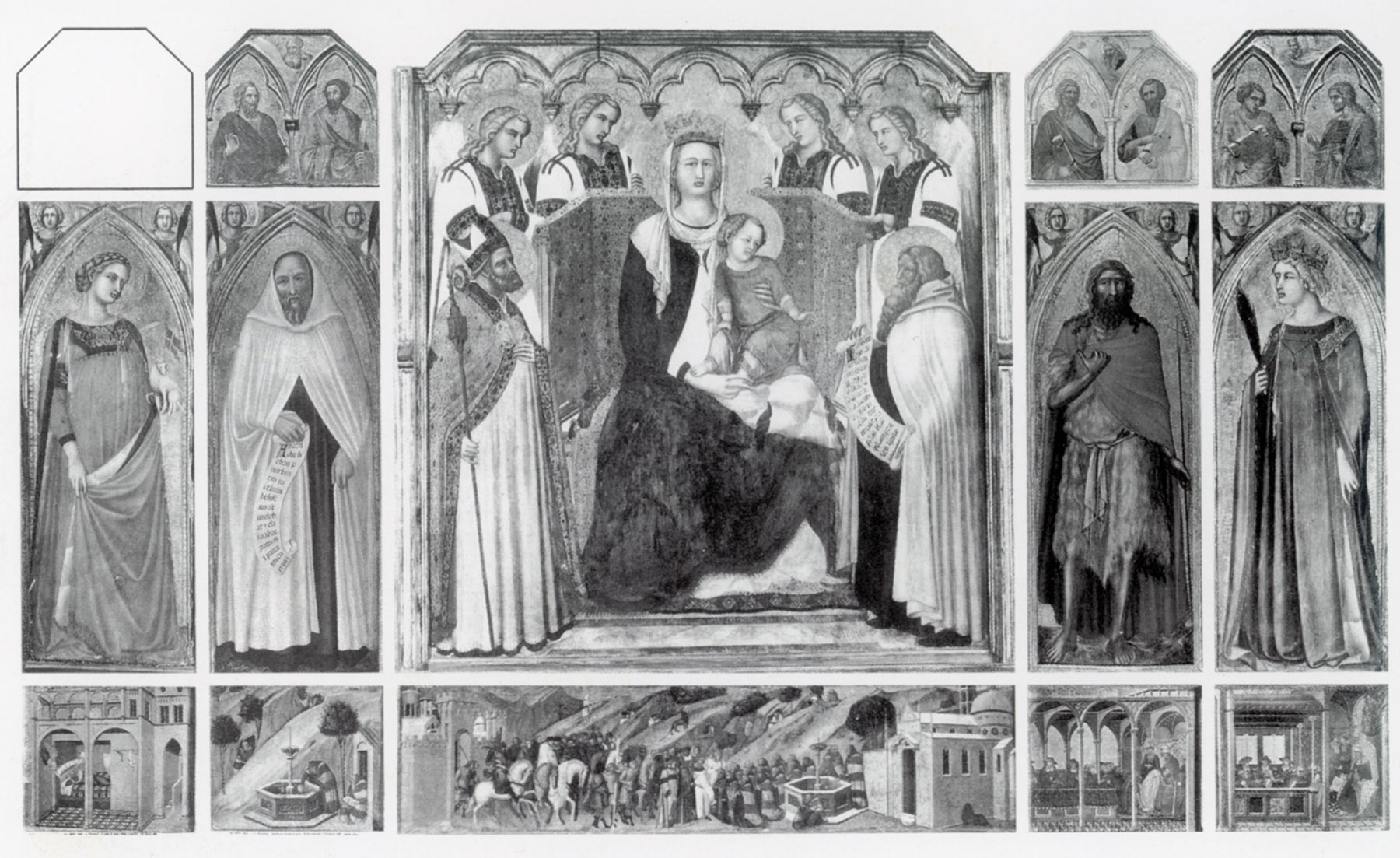 The earliest evidence for the Carmine Altarpiece is in the life of Pietro Lorenzetti compiled by the eighteenth-century Franciscan author Guglielmo della Valle, who first referred to the surviving documentary records of this commission: a resolution dated October 26, 1329, in which the Sienese commune approved the petition of the monks and prior of Santa Maria del Carmine for financial assistance so that they could “collect” the finished altarpiece from Pietro Lorenzetti’s workshop; and the subsequent disbursement of the requested sum to the artist, on November 29, 1329.2 The work, painted for the high altar of the monastery’s church, dedicated to Saint Nicholas, was described in the first document as an “admirable [honorabilem] and very beautiful panel in which the Blessed Virgin Mary and the most blessed confessor Nicholas, and apostles and Martyrs, confessors and virgins, were painted most beautifully and in great detail by Master Pietro Lorenzetti of Siena.”