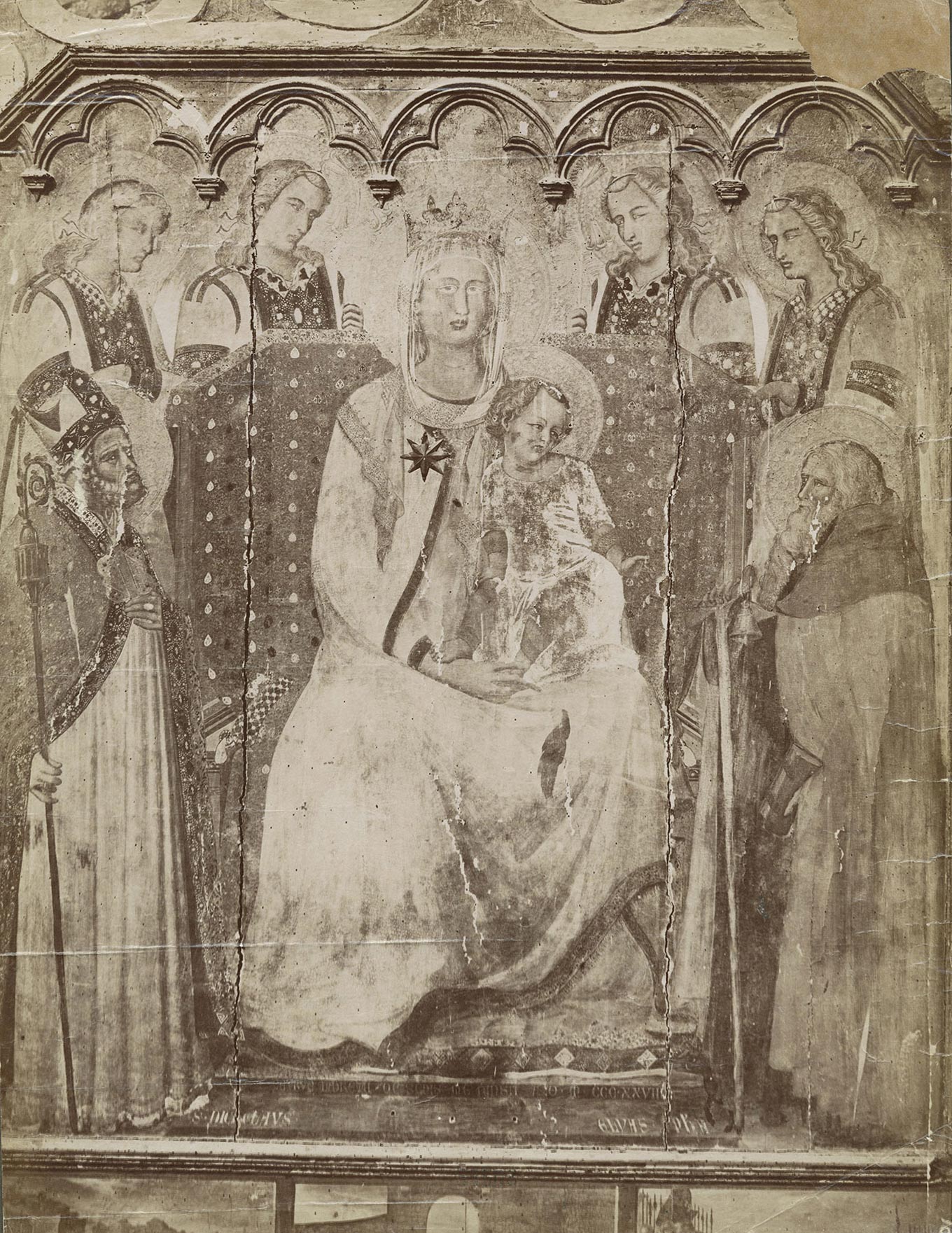 Ironically, well before the purported 1818 sale, which may have applied to some of the subsidiary parts of the polyptych, the signed and dated central compartment, with the Virgin and Child, had already made its way to the small parish church of Sant’Ansano a Dofana, in the environs of Siena, where it went unrecognized by Romagnoli and all subsequent nineteenth-century scholars.6 Joseph Crowe and Giovannni Cavalcaselle described the work in great detail, highlighting its very poor state of preservation, in their 1864 volume of the History of Painting in Italy: “The earliest altarpiece signed by Pietro is that of the Cappellina del Martirio in the little church of S. Ansano, belonging to the Compagnia a Dofana outside the Pispini gate of Sienna [sic], in which the Virgin, almost life size, is enthroned under the guard of four angels, between S. Anthony the abbot and S. Nicholas, erect at her sides. On the step of the throne are the words: ‘Petrus Laurētii de Senis me pinxit A.D. MCCCXXVIIII’” (fig. 2).7 The connection between this painting and the Carmine commission was not made until the following century, when Ernst DeWald noticed the later repaints that had transformed the figure of the Prophet Elijah, the mythical founder of the Carmelite order, into a Saint Anthony Abbot. DeWald’s discovery laid the groundwork for his later identification of two other previously overlooked fragments in the Pinacoteca Nazionale, Siena: the two pinnacles with Saints Thaddeus and Bartholomew and Saints Thomas and James Minor, companions to the present figures.8