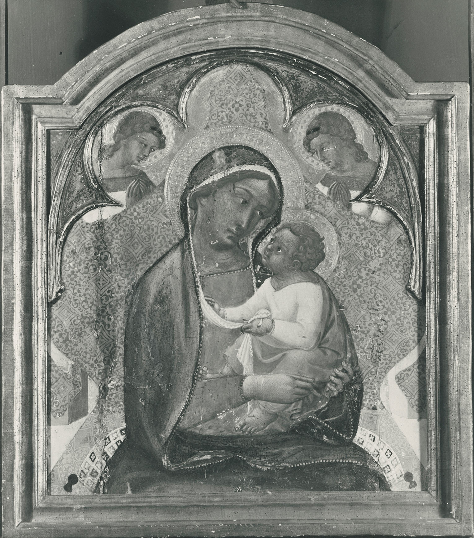 This panel, already drastically reduced in height when it first appeared on the art market around 1920, was originally the center of a large polyptych with the Virgin and Child Enthroned, flanked by standing saints. As evidenced by comparisons with early photographs (fig. 1), its previously decorated painted surface was still relatively intact before being irreparably damaged in a 1959 cleaning. The earliest record of the picture is an expert opinion written by F. Mason Perkins for the London and New York firm of Durlacher Brothers, in April 1920, excerpts of which are preserved in the Frick Art Reference Library, New York, and in the Yale curatorial files.3 In it the scholar referred to the Virgin and Child as “a most interesting and rare find” and attributed it to the author of a Nativity in the Fogg Art Museum, Cambridge, Massachusetts, christened by him “Master of the Fogg Museum Nativity.”4 As Perkins reported in another letter, his attribution had been confirmed by Bernard Berenson, who had already gathered a body of works around the Fogg Nativity under the fictitious sobriquet “Ugolino Lorenzetti,” in reference to the peculiar blend of derivations from Ugolino di Nerio and Pietro Lorenzetti. In 1923 Ernest DeWald5 inserted the Yale Virgin and Child, then with the New York branch of Durlacher, in his reconstruction of the so-called Ovile Master—named after a Virgin and Child in the church of San Pietro Ovile, Siena (now Museo Diocesano d’Arte Sacra )—whose oeuvre comprised some of the paintings assigned by Berenson to “Ugolino Lorenzetti,” including the Fogg Nativity. Calling the present panel “an excellent example of the Ovile Master’s work,” DeWald evoked the coloristic brilliance that characterized the image, noting “the lovely vermillion brocade” of the cloth of honor behind the Virgin; “the lovely blue” of the Virgin’s mantle; and “the strong yellow” of the drapery of the Christ Child, which recalled the color effects of the Fogg Nativity. The painting was in the collection of Maitland Griggs by February 25, 1924, when Richard Offner described it as “an undisputable and typical” work of the Ovile Master in a Lorenzettesque phase,” pointing out that the painted surface was “slightly worn, but free from any disfiguring damage or restoration.”6 The attribution to the Ovile Master was reiterated in Lionello Venturi’s 1931 overview of Italian paintings in American collections, which provides the most detailed record of the painting’s original palette: “The gold background is nearly covered by the great red and gold cloth of the throne. The Madonna wears a blue cloak and red robe, the Child a lilac cloak and yellow robe, and the angels are in blue, red and gold. The flesh tints are dark blonde. There are some signs of toning.”7