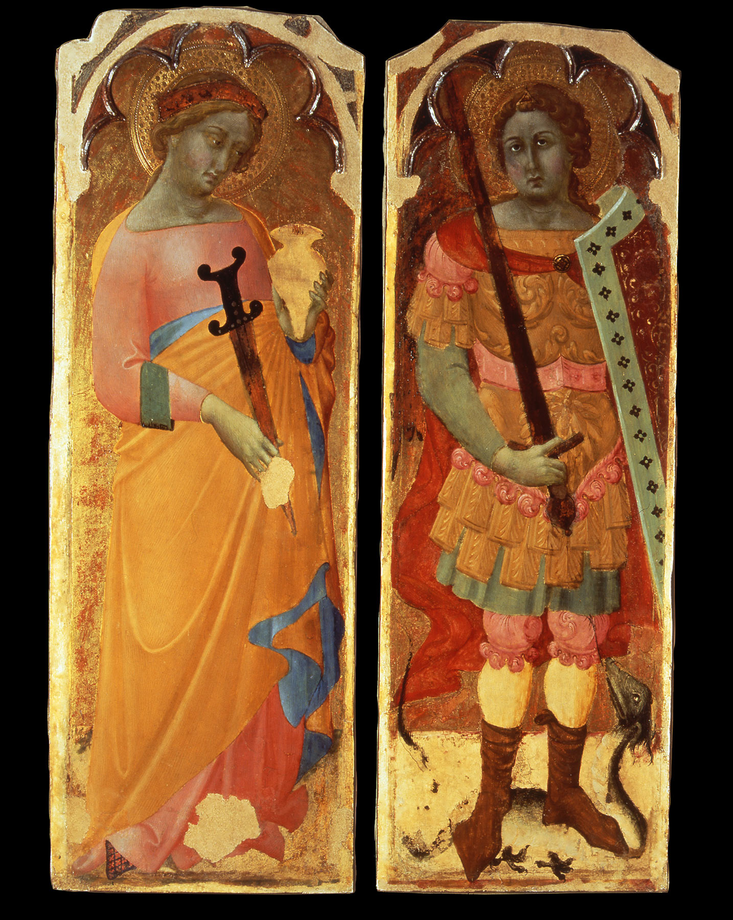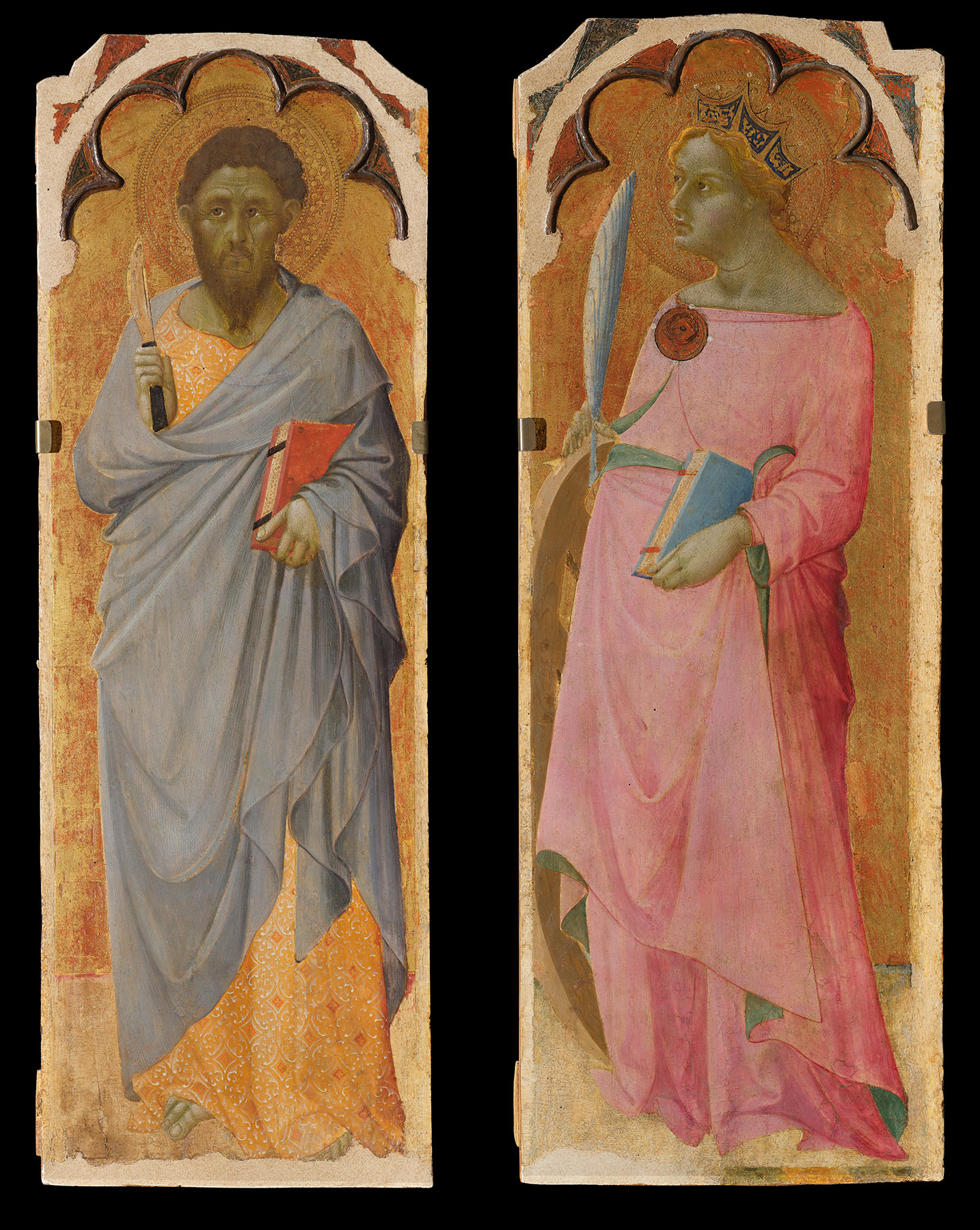 In her monographic study of Bartolomeo Bulgarini, Judith Steinhoff reexamined the Yale Virgin and Child, confirming the hypothesis, first formulated by Berenson and picked up by Seymour,11 that it was originally flanked by the four standing saints unanimously attributed to the artist in the Museo Nazionale di San Matteo, Pisa: Saint Lucy, Saint Michael the Archangel, Saint Bartholomew, and Saint Catherine of Alexandria (figs. 2–3). As demonstrated by Steinhoff and supported by recent examination, the relationship between the Pisa Saints and the Yale Virgin and Child is confirmed by shared framing elements and structural details as much as by stylistic comparisons. Like the Yale Virgin, the standing figures are enclosed by the same five-lobed arch, with identical silver patterns in the spaces between the raised cusps and in the spandrels. The panels, which have the same thickness, were formerly attached by horizontal battens, still present on the top and bottom of the Pisa Saints. Traces of the missing upper batten are still visible on the reverse of the Yale Virgin, and dowel holes on both sides align with those in two of the Pisa panels: on the left, with Saint Michael, and on the right, with Saint Bartholomew. The two female saints occupied the extremities of the altarpiece, Lucy on the left and Catherine of Alexandria on the right.12