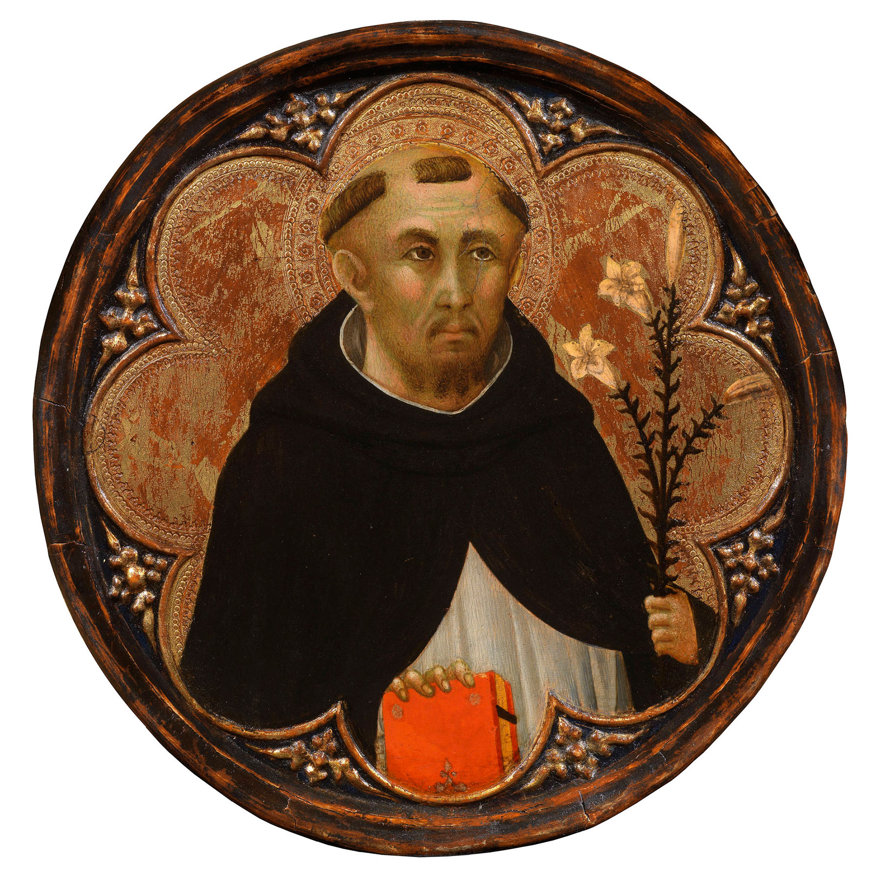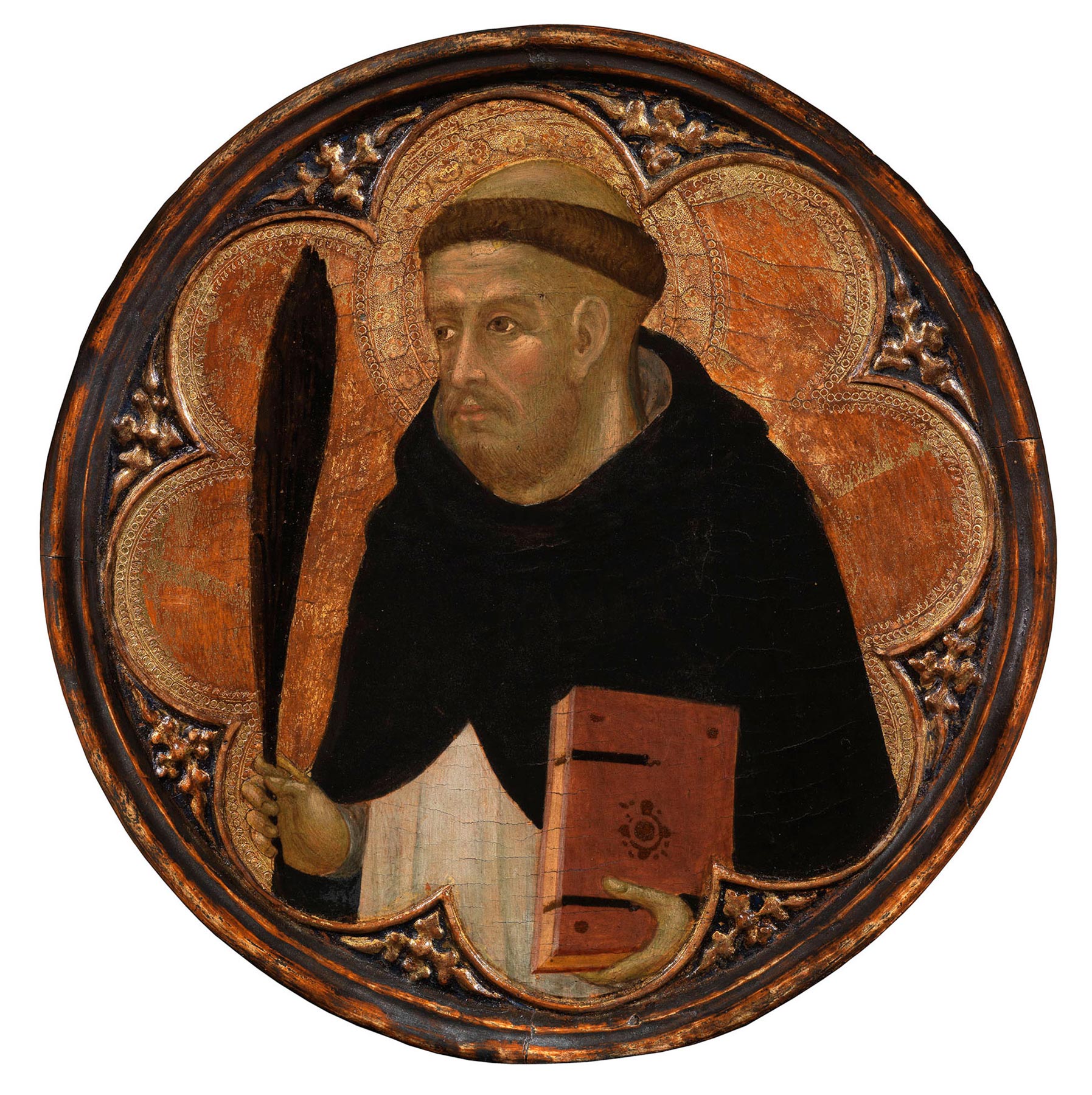 The Pisa panels were formerly part of the collection of Canon Sebastiano Zucchetti (1723–1801), deacon of Pisa Cathedral between 1784 and 1801, suggesting a Pisan provenance for the original complex.13 Most recently, Linda Pisani advanced the possibility that Bulgarini’s altarpiece, which shows Saint Michael in the position of honor to the Virgin’s right and also includes Catherine of Alexandria, could have been executed for the chapel of Saint Michael in the Dominican convent of Santa Caterina in Pisa.14 According to a description of the church of Santa Caterina compiled by the Pisan canon Ranieri Zucchelli around 1787, the chapel had been founded sometime before 1340 by the powerful Della Rocca family and was the site of a family tomb.15 Bolstering Pisani’s proposition is her plausible suggestion that two small tondi by Bulgarini recently on the art market, showing Saint Dominic and Saint Peter Martyr and stylistically related to the Yale/Pisa panels (figs. 4–5), could be additional fragments of the same altarpiece, possibly inserted into the now-missing upper framing elements.16 Pisani tentatively placed the execution of the polyptych around 1355, when the probable founder of the chapel of Saint Michael, Dino Della Rocca (documented 1322–55), banned from the city in 1347 for his role in a plot to assassinate Count Ranieri Novello, returned from exile along with other members of the family.17