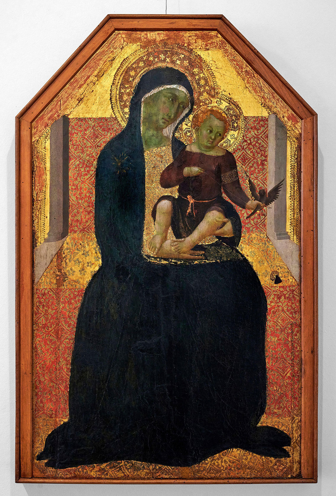 The Grosseto panel, badly damaged and cut at the top and sides, may originally have had a round arch set in a rectangular field, like the Yale Virgin. For a full discussion of its provenance and condition, see Steinhoff, Judith. “Bartolomeo Bulgarini and Sienese Painting of the Mid-Fourteenth Century.” Ph.D. diss., Princeton University, 1990., 487–92, no. 30. ↩︎