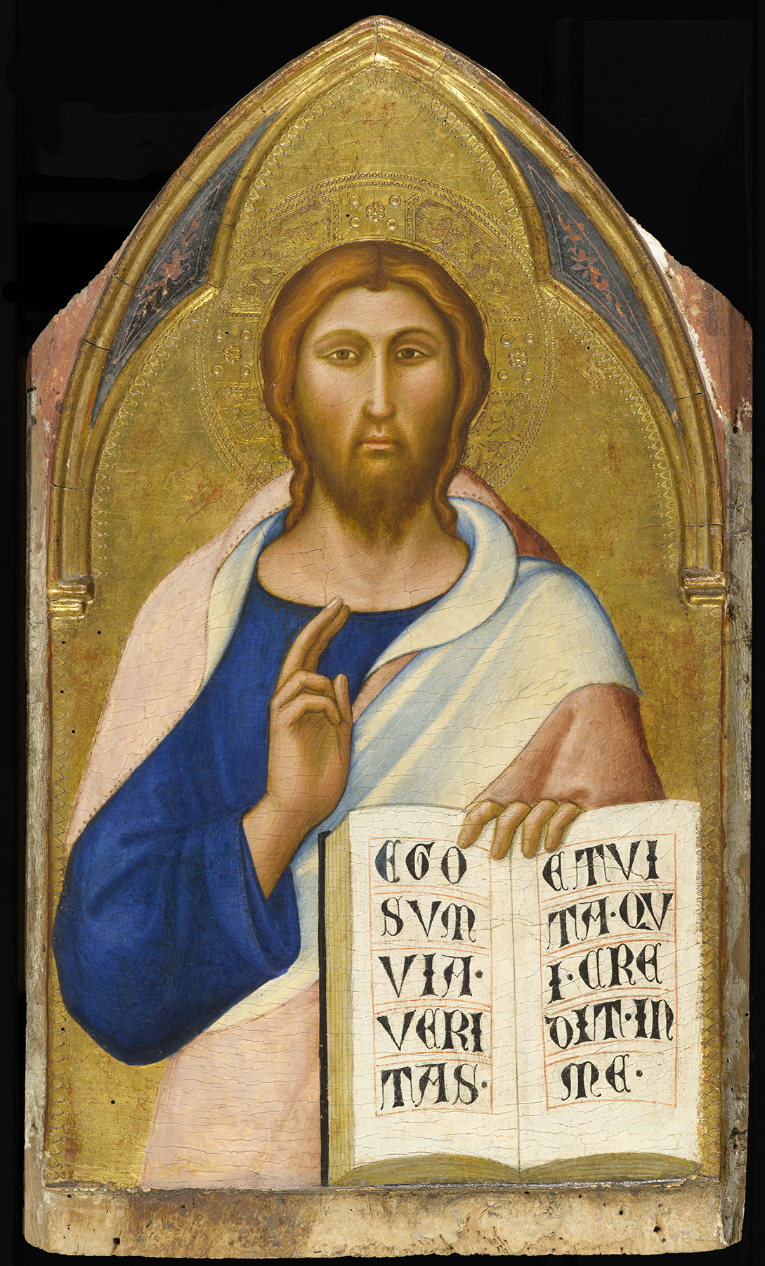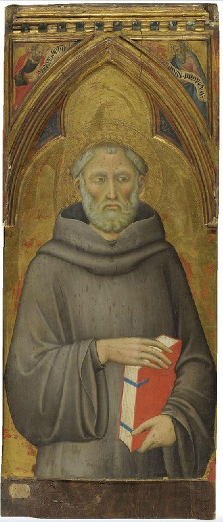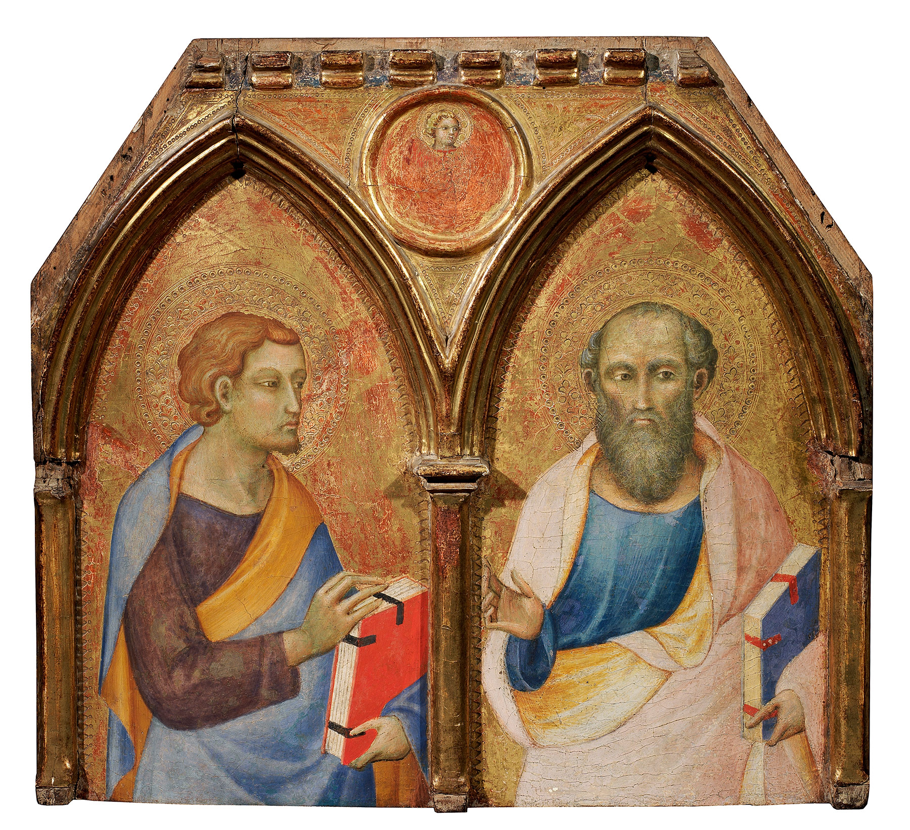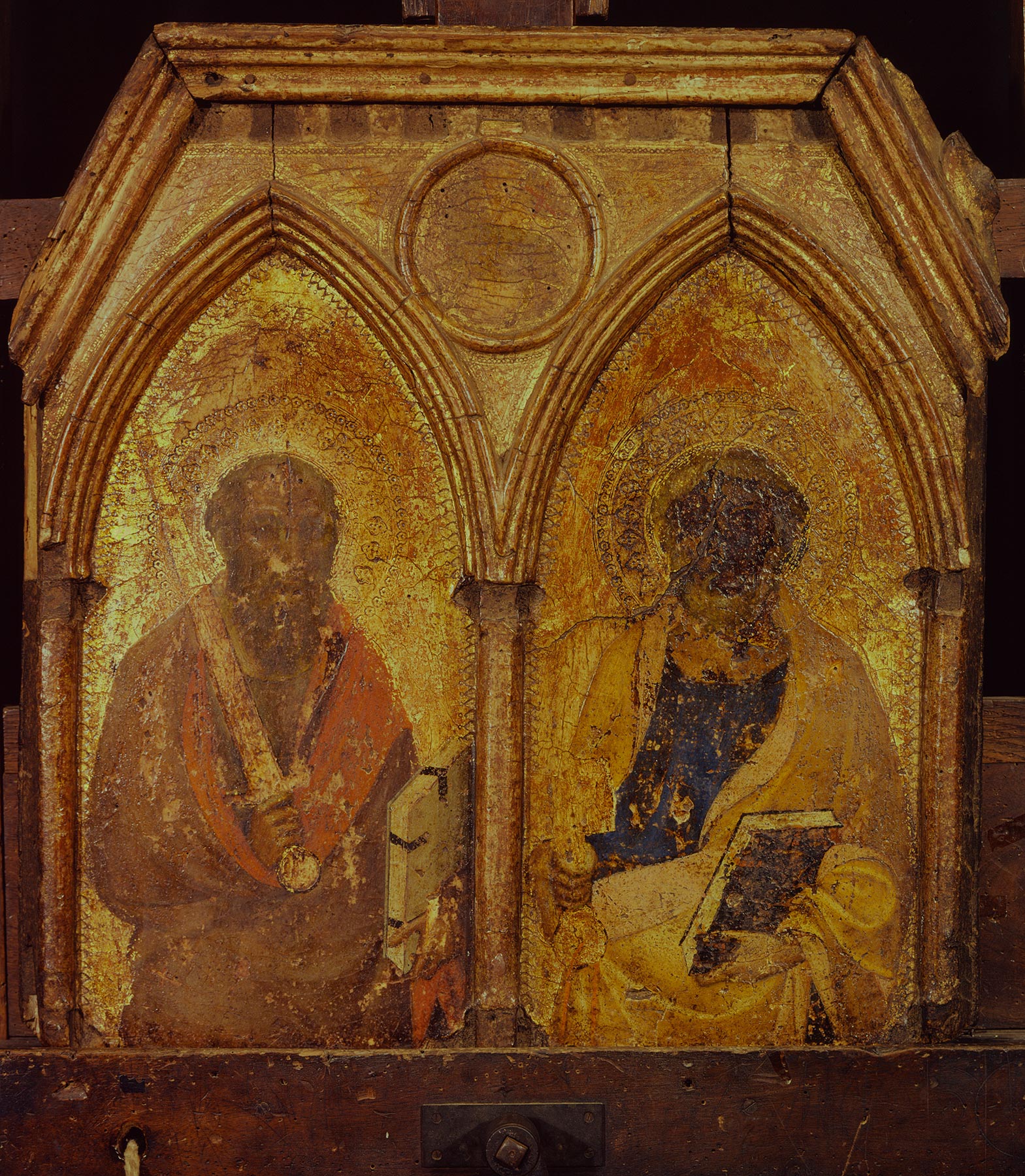 In 1978 Federico Zeri wrote to Andrea Norris, then assistant to the director at the Yale University Art Gallery, reporting that he had found four panels from the main register and two pinnacles from the altarpiece to which he believed the Yale predella belonged, but that he was awaiting further evidence to support the connection. The basis of Zeri’s reconstruction, according to his letter, was in part “that absolutely identical dentils, like those which have been removed from your painting, appear in five of the panels of the altarpiece, and they are unquestionably genuine.”5 It seems that his hesitation was occasioned by uncertainty over the attribution of the other six panels, as it was only through the Yale predella that they could be linked to Luca di Tommè. The panels in question comprise four half-length saints from the main register of the altarpiece: Saint John Gualbert, formerly in the Chalandon collection (fig. 2);6 Saint Michael, in the Alana Collection, Newark, Delaware (fig. 3); Saint John the Baptist, in the J. Paul Getty Museum, Los Angeles (fig. 4); and Saint Bernard degli Uberti, formerly in the Chalandon collection (fig. 5),7 reading left to right according the reconstruction proposed by Gaudenz Freuler.8 Among the pinnacles, Zeri identified a panel showing two apostles in the Fondazione Roberto Longhi, Florence (fig. 6), and a Blessing Redeemer in the Kress Collection at the North Carolina Museum of Art, Raleigh (fig. 7).9 To these has since been added a third pinnacle panel, showing Saints Peter and Paul, that appeared at auction in 1989 (fig. 8).10