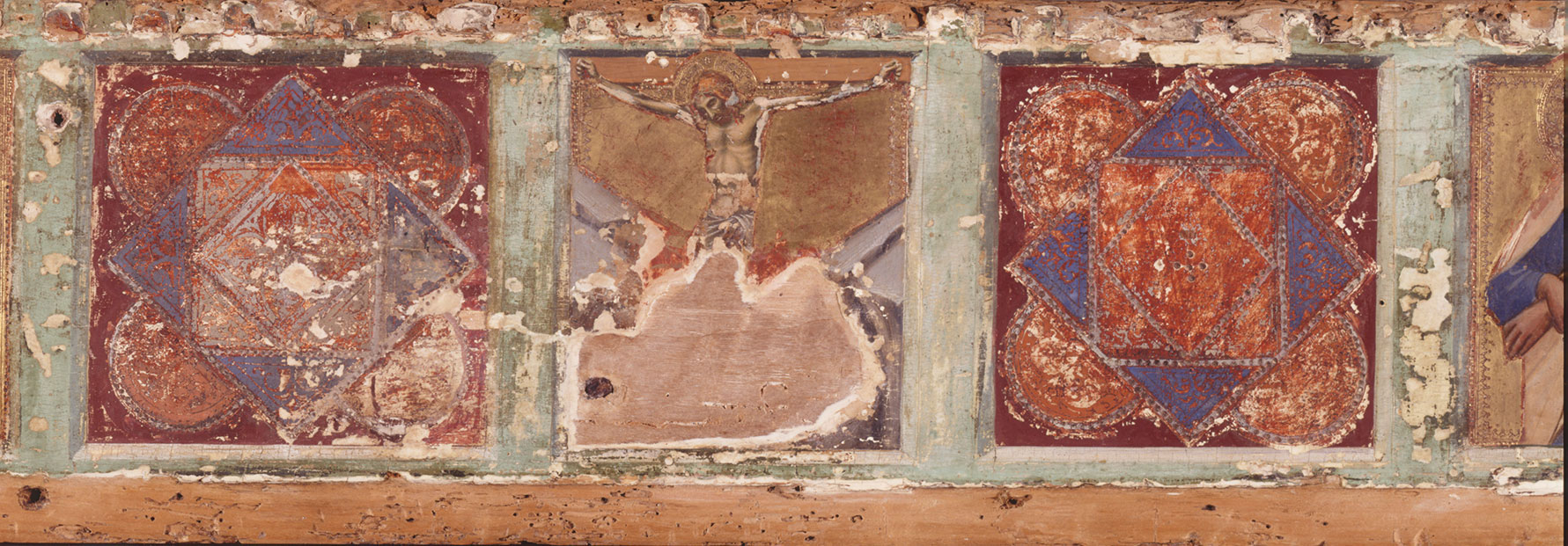 A large area of total loss affects the lower third of the central compartment, from Christ’s thighs down, and extends into the decorative compartment alongside it at the left (fig. 1). The lower-right quadrant of that compartment is a modern reconstruction from the Getty cleaning, as is the green framing strip separating it from the Crucifixion. The lost area in the Crucifixion was filled at that time with a “neutral” colored tratteggio, creating the illogical appearance of damage occurring “behind” the fictive moldings. All the gilt backgrounds and haloes in the figurated compartments are modern, possibly applied in the pre-1924 restoration, but the silver gilding in the decorative fields, while damaged, is largely original; the half panels at either end are more extensively damaged than the complete panels dividing the figurated compartments. Abrasion and flaking losses are scattered throughout the panel along the interfaces of paint surfaces with the new areas of gilding, and the green “moldings” framing each compartment are much restored. The haloes, where they project beyond the borders of their gilded compartments, are raised slightly above the level of the green painted surrounds. It is not clear if that reflects the original appearance of the predella and was once better resolved, perhaps with pastiglia rims along the top arcs of the haloes, or if it is a clumsy by-product of the early twentieth-century gilding.