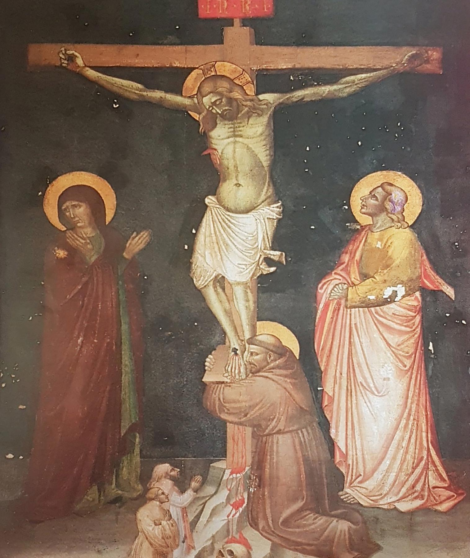Listed by James Jackson Jarves as a work of Puccio Capanna,2 the Yale Lamentation over the Dead Christ was first described by Joseph Crowe and Giovanni Cavalcaselle, who saw it when it was still in Florence, as having “altogether the character of the works of Antonio [Veneziano].”3 Subsequent nineteenth-century scholars reiterated this attribution, although William Rankin, while noting a relationship to Antonio’s frescoes in the Camposanto, Pisa, emphasized the cruder execution of the Yale panel.4 In 1909 Osvald Sirén described the picture as “of no great artistic value” and rejected the association with Antonio Veneziano in favor of the Pisan painter Cecco di Pietro.5 He later revised this opinion, however, and compared the stiff execution, heavy black contours, and caricatural figure types to Bolognese painting, tentatively proposing the name of Michele di Matteo da Bologna—an attribution that was not taken up by Raimond van Marle, who included the panel in Cecco di Pietro’s oeuvre.6 In the most detailed examination of the Lamentation to date, Richard Offner echoed Sirén’s negative judgment, referring to the painting’s “crudities of execution,” but dismissed any association with the Bolognese school and attributed the painting to Giovanni di Pietro da Napoli, a mysterious painter known primarily for his collaboration with Martino di Bartolomeo on several important Pisan commissions between 1402 and 1404.7 According to Offner, the Yale painting displayed “clear and direct” analogies with the only signed work by Giovanni di Pietro, the Crucifixion from the convent of San Domenico in Pisa, painted on cloth and dated 1405 (fig. 1). Although separated from each other chronologically, Offner specified, the two images were united by the same “insistent deficiencies,” yielding “about an equally small degree of aesthetic energy.”8